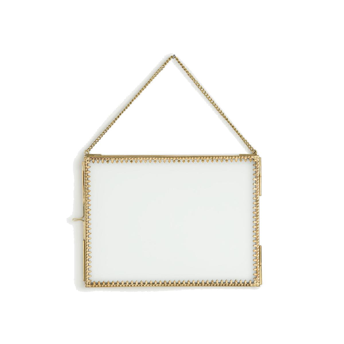 A beautifully retro design, the Uyova hanging photo frame is handcrafted in glass and brass. With its ace of spades detailing around the edge, you can leave it empty for a boldly decorative touch. Or pop in one of your favourite photos. Product Details • Landscape format • Brass-finish steel frame with ace of spades detailing and glass • Chain for hanging (screws and wall plugs not supplied) • For 20 x 15cm photos • Hand-crafted, each piece is unique: colours and dimensions may vary from product to product. Dimensions • Width: 20cm • Height: 15cm. Dimensions and weight of parcel1 parcel • L29 x H8 x D22cm, 0.7kg