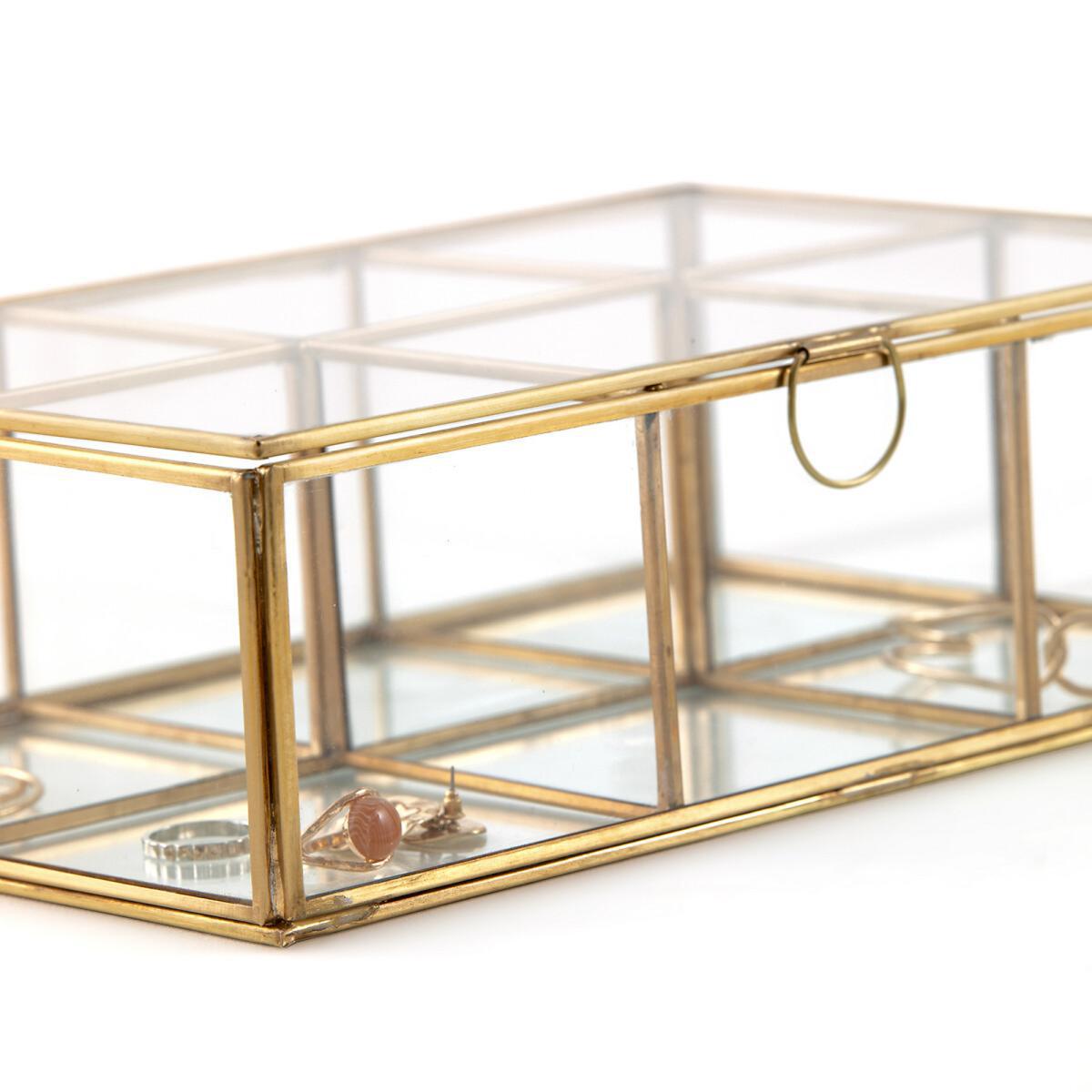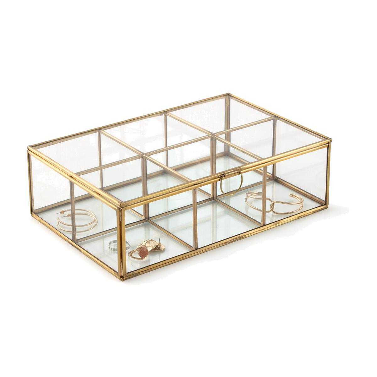 This charming storage box with multiple compartments has a touch of Art Deco style about it. Product Details. Metal structure in brass or black finish. Glass panels. Box with lid. See the full Uyova collection online. Size. H9 x L30 x D20 cm. Dimensions and weight of parcel. L37 x H15 x D27 cm. 2.3kg.