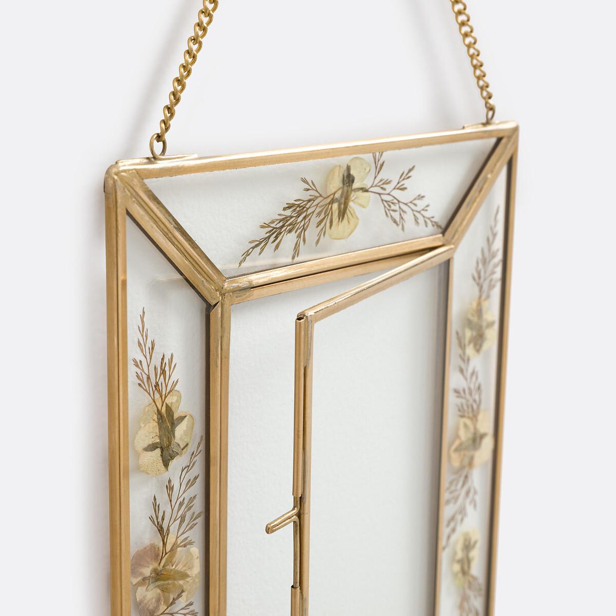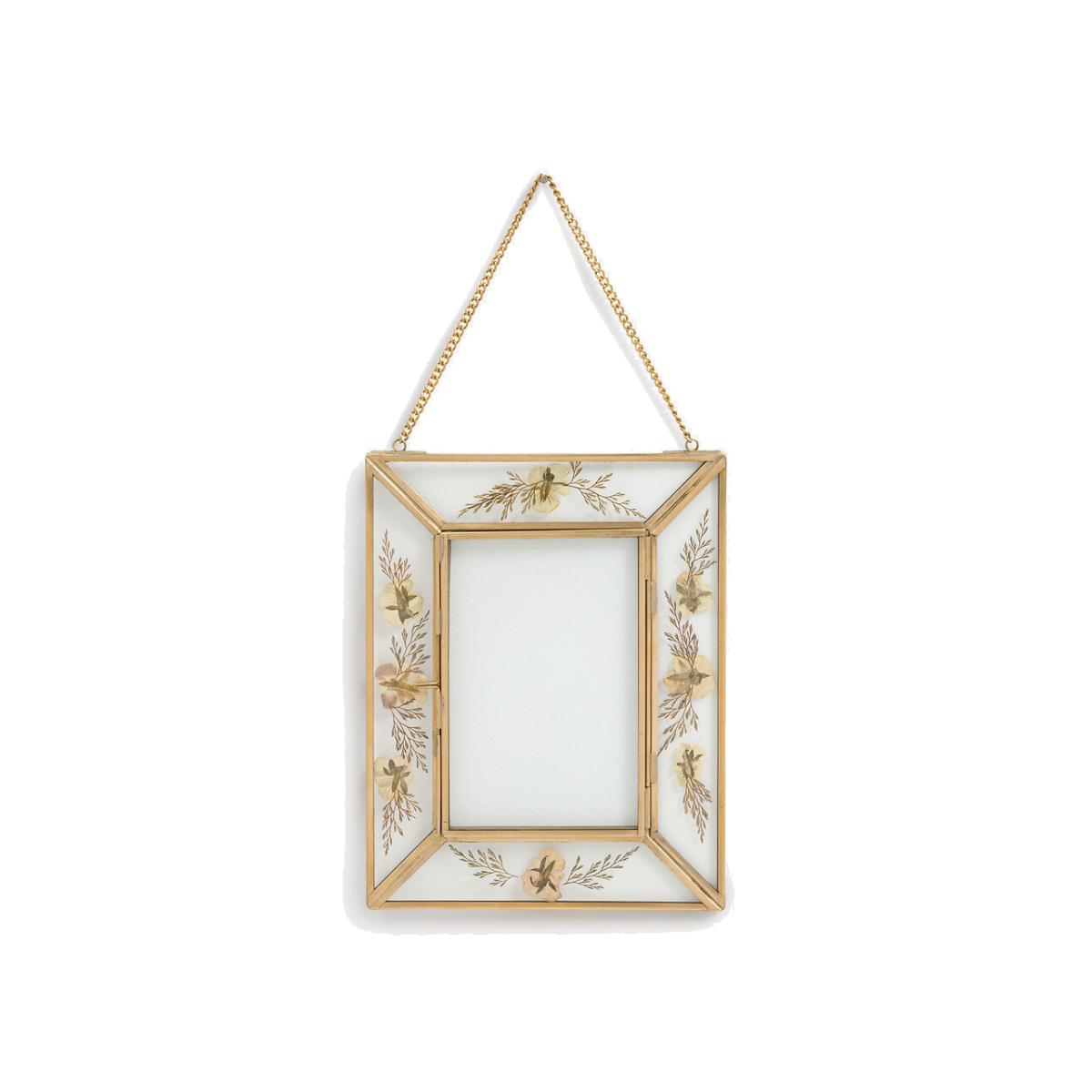 A beautifully retro design, the Uyova hanging photo frame is handcrafted in glass and brass. With its integrated dried flowers around the edges, you can leave it empty for a truly decorative touch. Or pop in one of your favourite photos. Product Details • Metal with a brass finish • Double-walled glass • Chain for hanging (screws and wall plugs not supplied) • For 10 x 15cm photo. Quality Info • Hand-crafted, each piece is unique: colours and dimensions may vary from product to product. Dimensions • Width: 18cm • Height: 23cm • Depth: 0.6cm