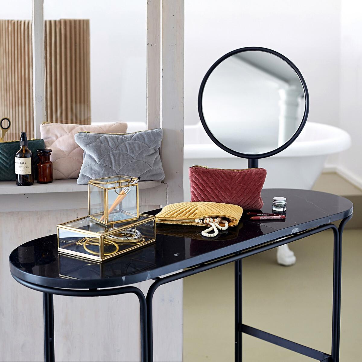 I love this little tray for its sleek blend of brass and glass, which adds a modern yet timeless touch. It works particularly well in contemporary or minimalist interiors, but can also elevate more eclectic spaces due to its versatile material pairing. Use it to organise jewellery, keys, or small accessories on a bedside table or vanity, keeping clutter contained while adding a hint of sophistication. Practical styling tips include stacking it with other jewellery dishes or placing it atop a tray cloth for visual interest; it also looks great displayed as a standalone piece on a coffee table or dressing unit to highlight its framed glass design.