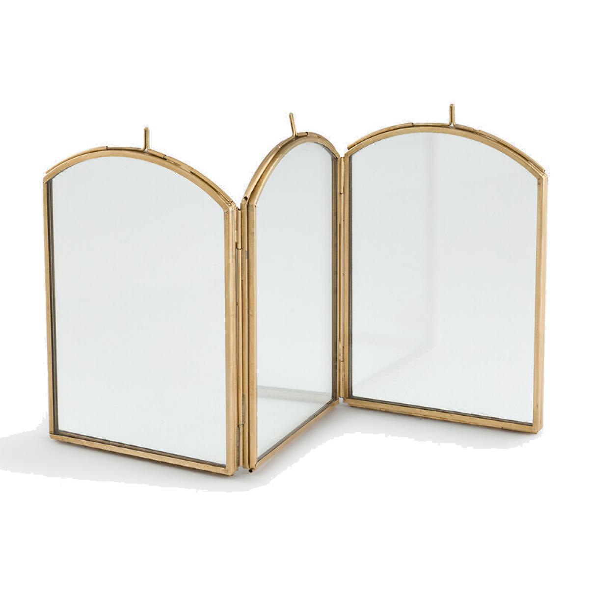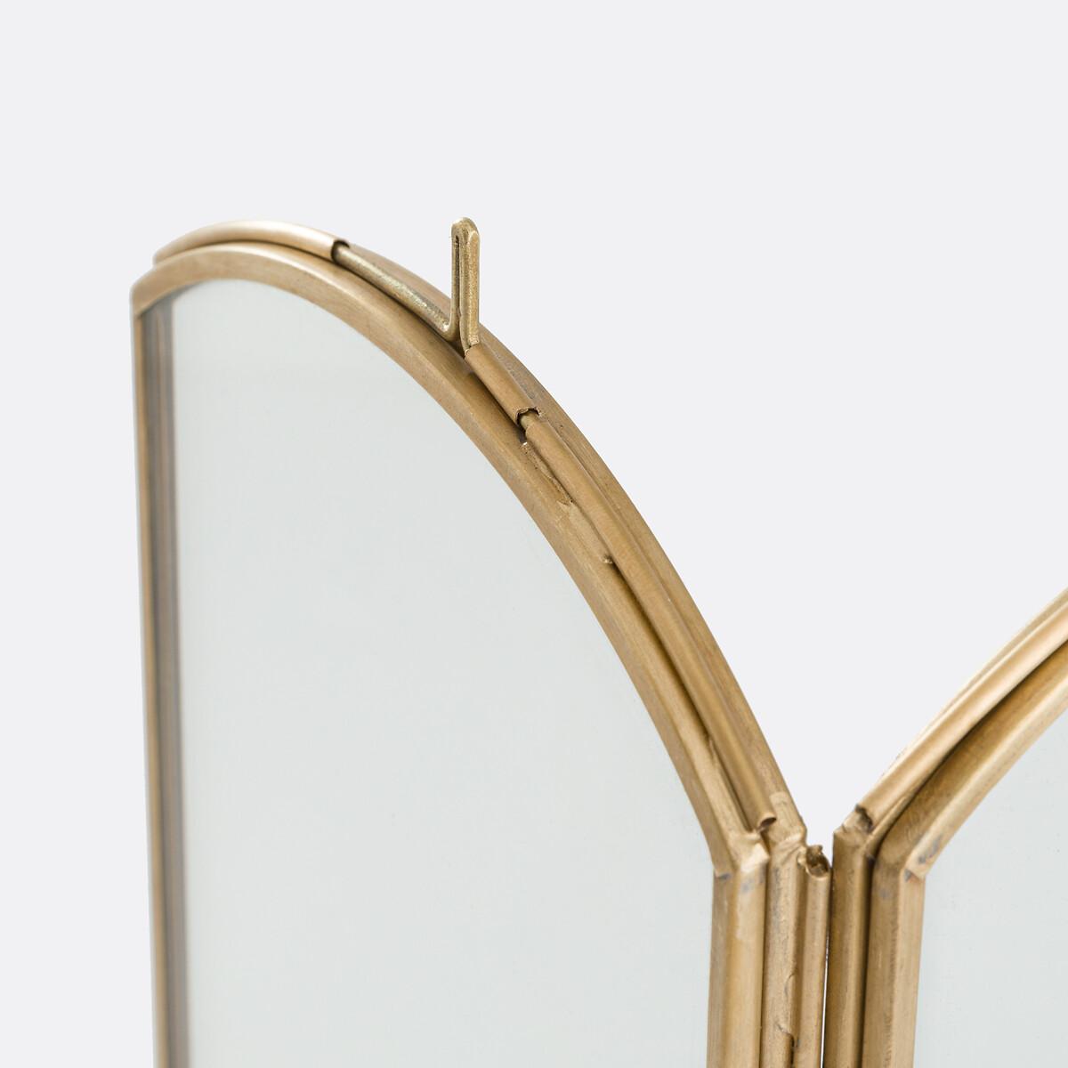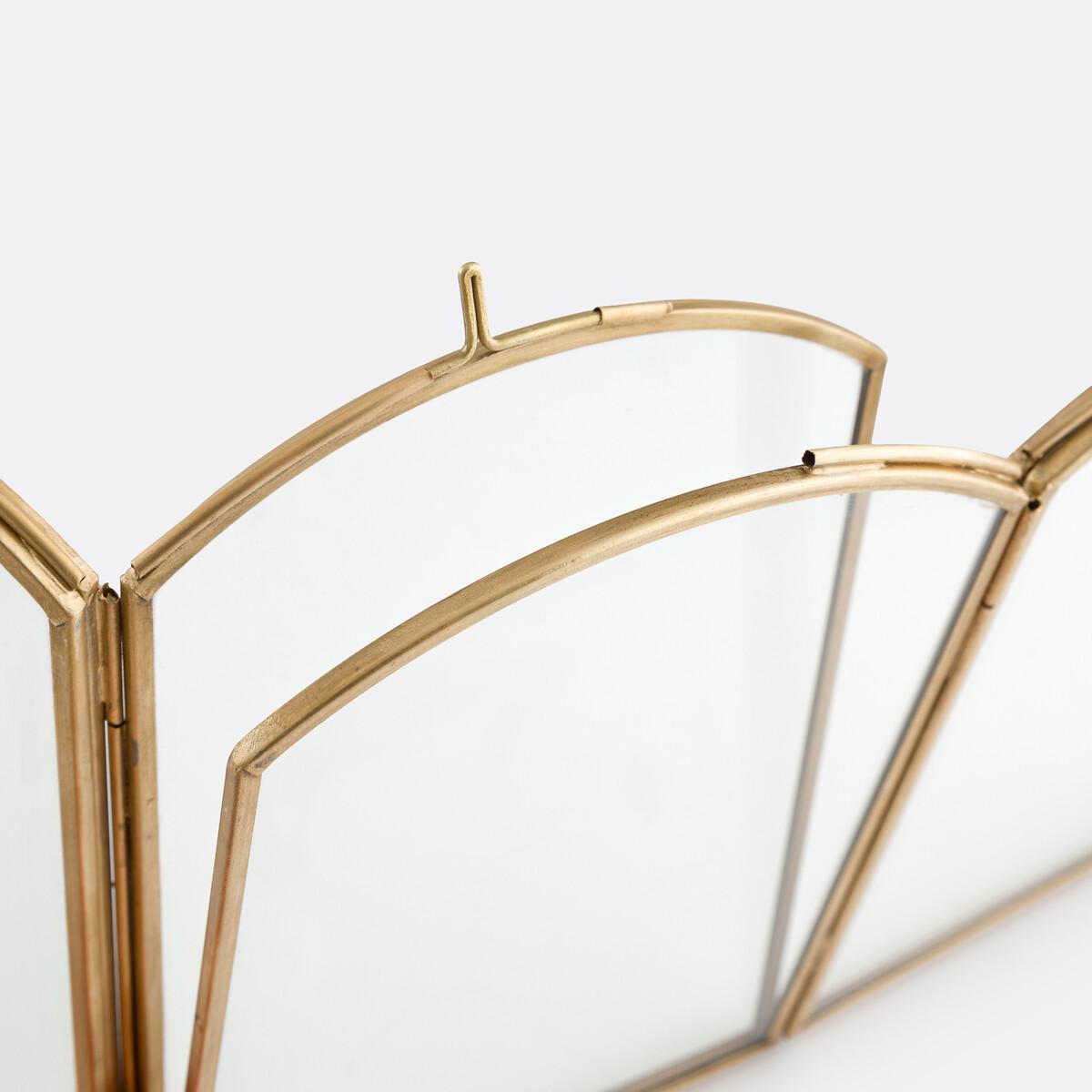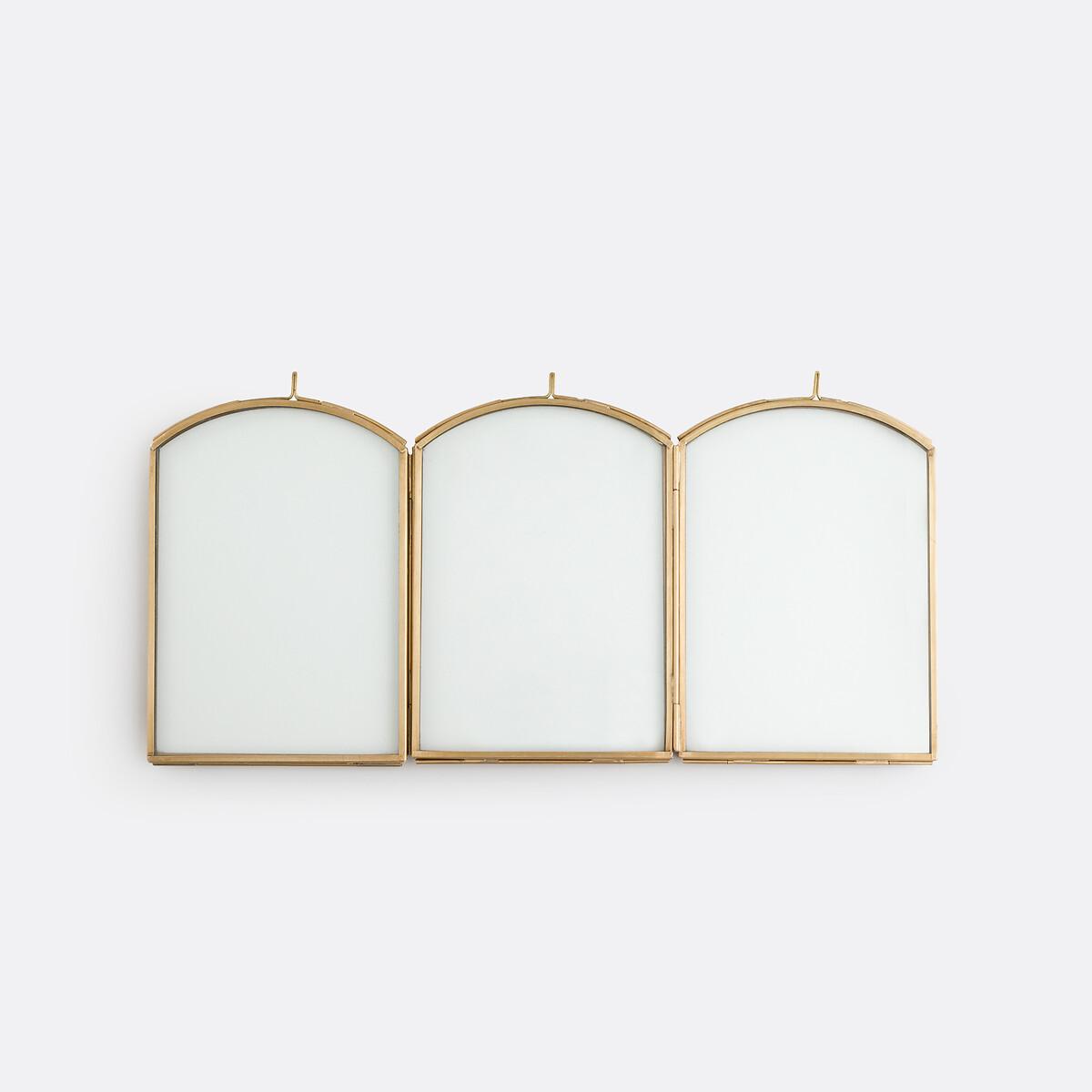 Switch up your photos and decor. A beautifully retro look. The Uyova triptych photo frame is handcrafted in glass and brass. It opens easily, so you can display your favourite photos and change them to suit your mood. Simply place it on a living room table, desk, sideboard or bedside table.. Product Details • 3-frame set • Metal with a brass finish • Double-walled glass • Latch closure • For photos 10 x 15cm. Quality Info • Hand-crafted, each piece is unique: colours and dimensions may vary from product to product. Dimensions • Width: 38cm • Height: 17.5cm • Thickness: 0.6cm