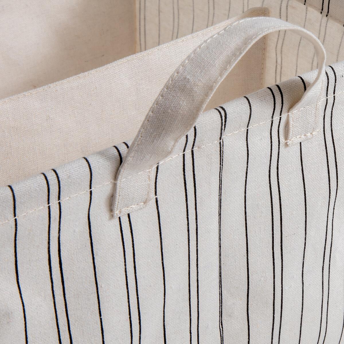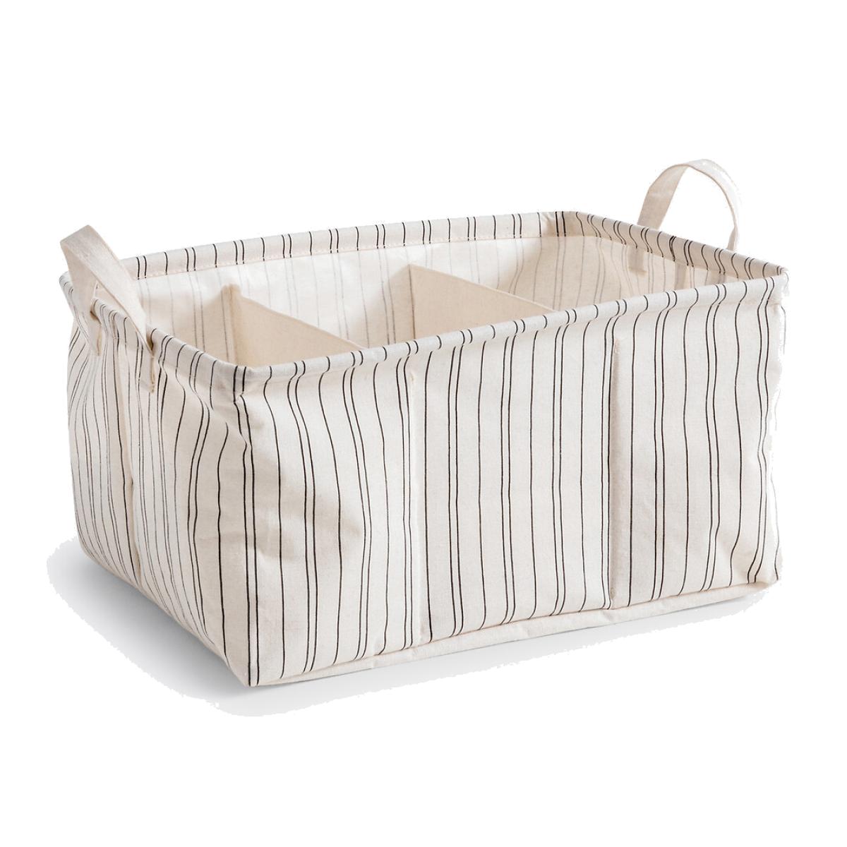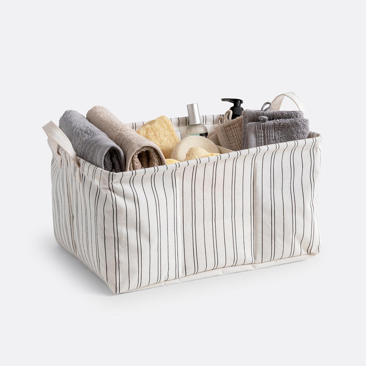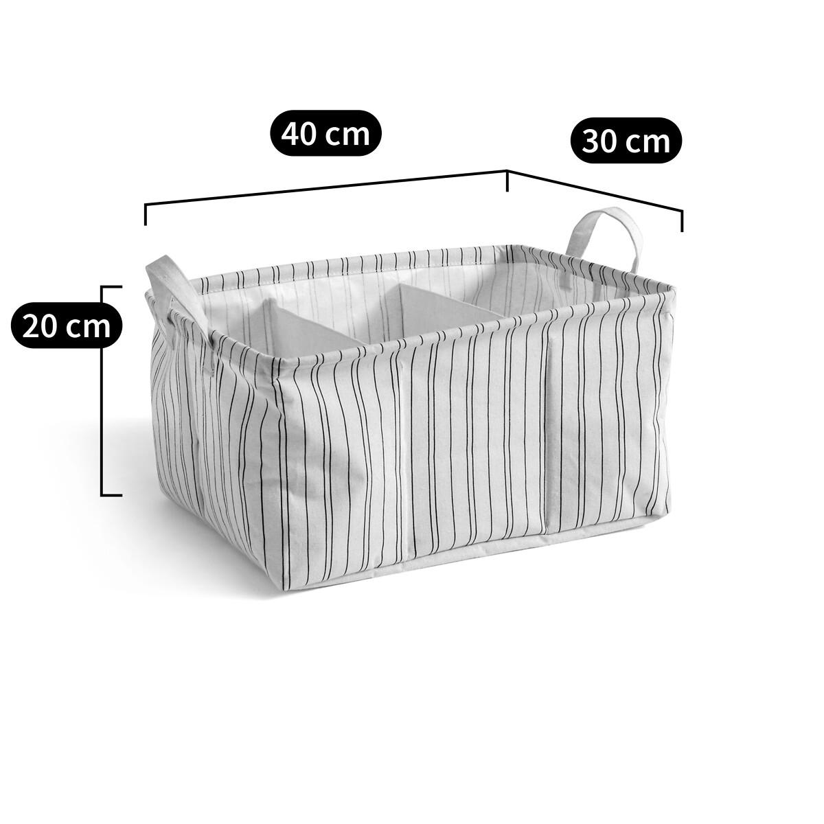 Introducing Uzès : a storage basket that's practical and good looking at the same time. Enriched with fine stripes, it brings a little decorative touch to the bedroom or bathroom. Product Details • 100% polycotton • Coated interior (washable). • 3 compartments. • 2 handles. Care Advice • Hand wash. Sizes • Width: 40cm • Height: 20cm • Depth : 30cm