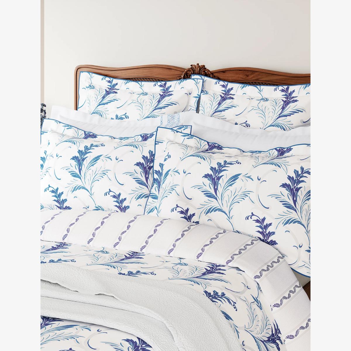 This Baroque duvet cover from the V&A collection is crafted from 200-thread count cotton percale, and is embellished with a twining design of acanthus leaves. The motif comes from a French textile print created by J.D. Cornuaud in the 1860s. It is complemented by an elegant stripe and leaf pattern on the reverse side. The matching pillowcases are sold separately