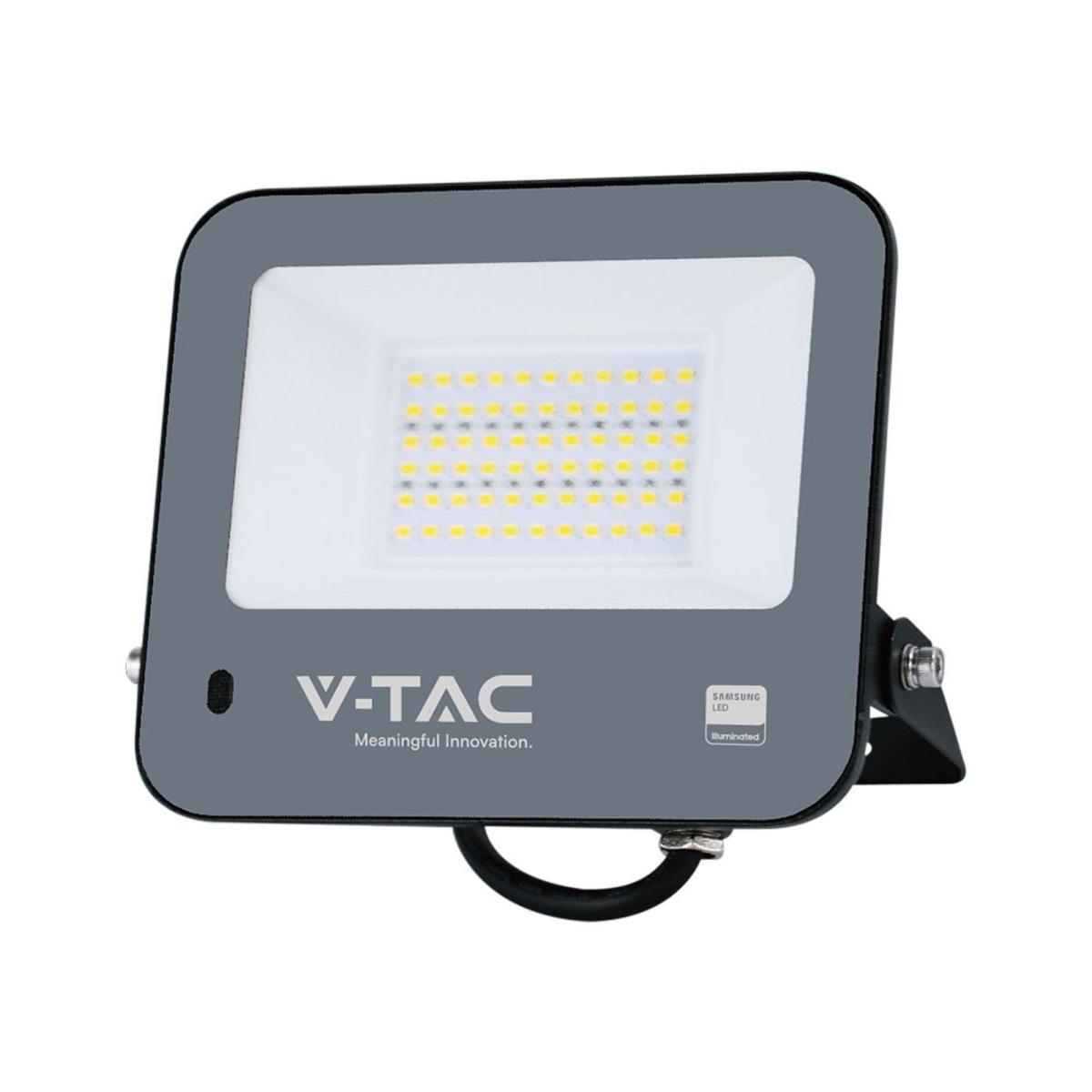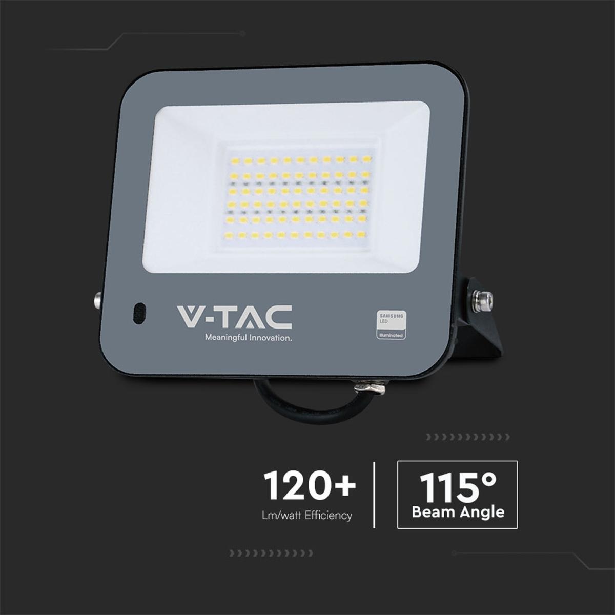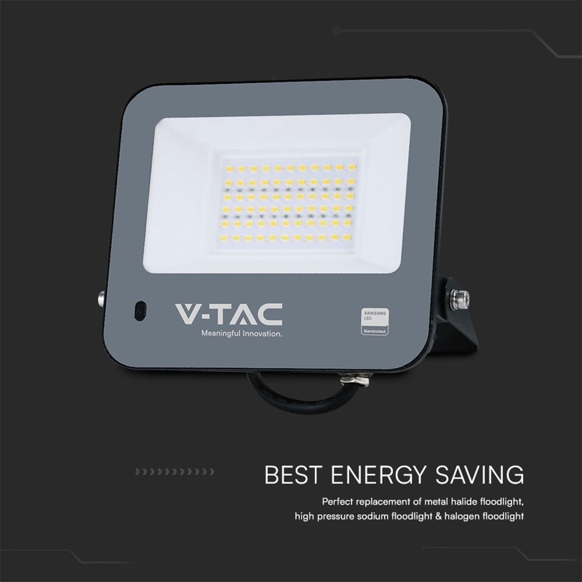 * 50W Floodlight with Samsung LED – High lumen efficiency of 120 LM/W* Dusk to Dawn Sensor – Automatically adjusts based on ambient light levels* Photocell Sensor Function – Activates when natural light is below 70 Lux and deactivates when above 70 Lux* Strong and Sturdy Aluminium Construction – Built to withstand outdoor conditions* IP65 Rating – Dust-tight and water-resistant, ideal for outdoor use* 5-Year Warranty* Versatile Applications – Perfect for facade lighting, garages, passages, parking, and more Illuminate your outdoor spaces efficiently with the V-TAC 50W Floodlight, featuring advanced Samsung LE Ds and a built-in Dusk to Dawn sensor. This high-quality floodlight offers a lumen output of 120 LM/W and provides bright lighting. The integrated photocell sensor automatically adjusts the light based on ambient natural light: the floodlight turns off when natural light exceeds 70 Lux and activates when it falls below 70 Lux. Constructed from robust, sturdy aluminium, this floodlight is built to endure harsh conditions and is protected by an IP65 rating, making it ideal for outdoor use. Perfect for applications such as facade lighting, garages, passages, parking and more.