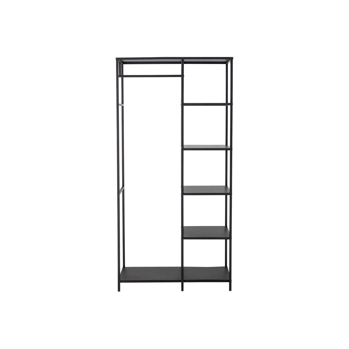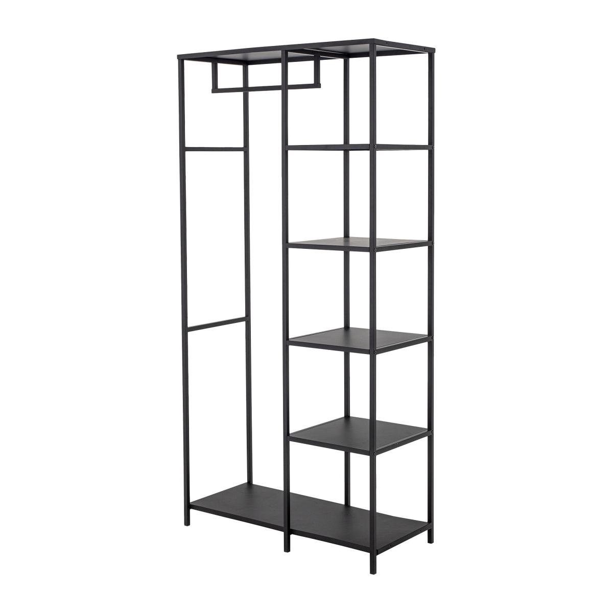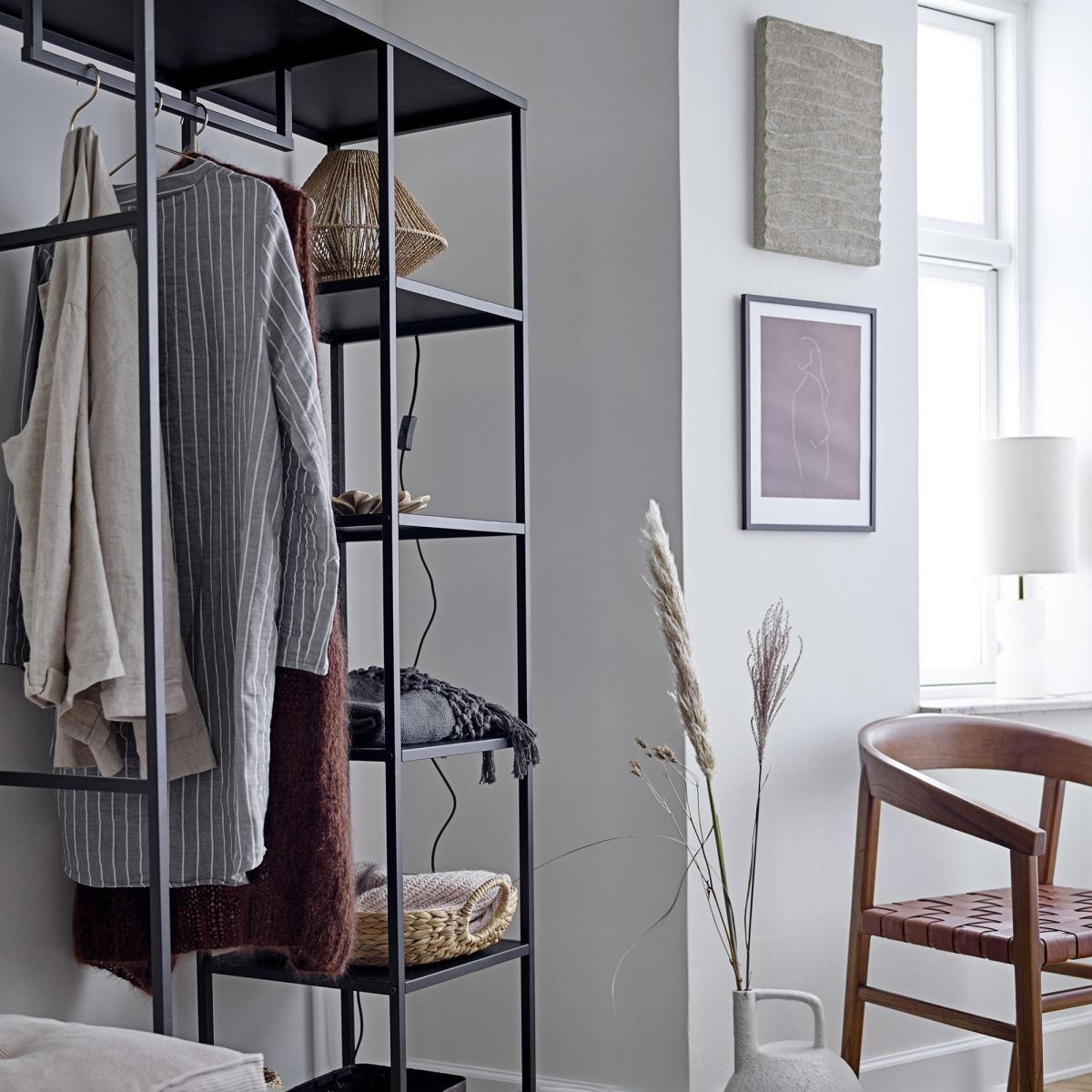 The Valde Closet in black metal offers a sleek, industrial aesthetic that works well in contemporary and minimalist interiors, as well as loft or urban spaces. Its open design makes it quite versatile; you can optimise storage by adding baskets or boxes on the shelves, and hang clothes on the spacious rod. Because of its clean lines and monochrome finish, it pairs beautifully with both rugged and refined decor schemes. Practical styling tips include using it as a statement piece in a bedroom or dressing area, layering with textured textiles or colour pops on the shelves for visual interest, or pairing it with softer materials to soften the overall look. Its open structure encourages organisation but also requires tidy styling, so consider integrating decorative storage solutions to keep the space looking neat.