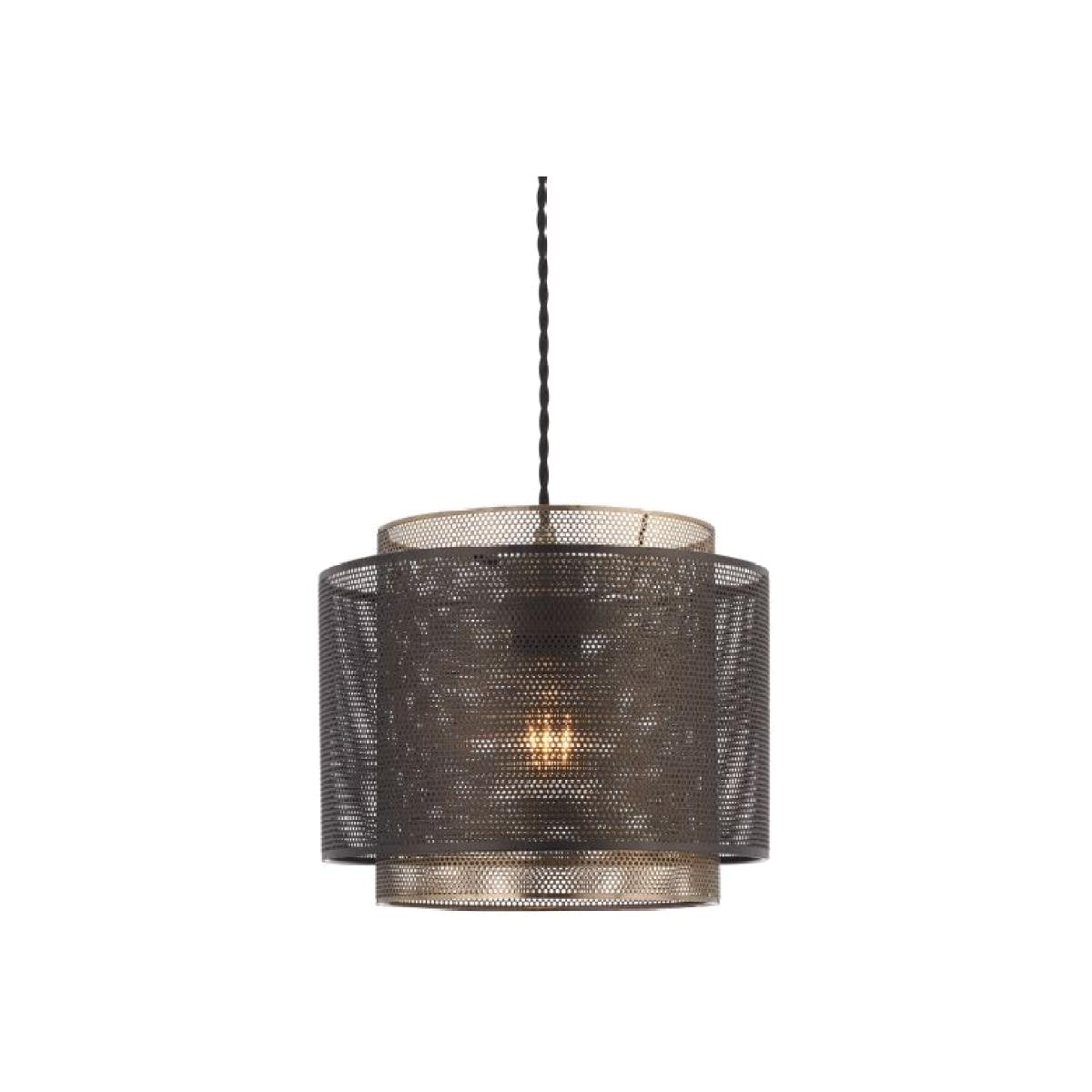 A modern pendant light formed from 2 metal etched cylinder shades, one finished in antique brass effect plate and the outer one in matt black. The mesh style shades create an interesting light effect. Compatible with LED lamps. Team with one of our cable sets for a complete fit.