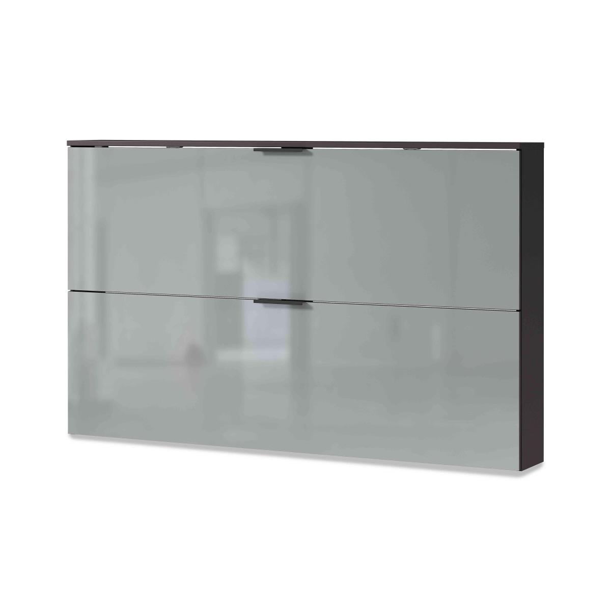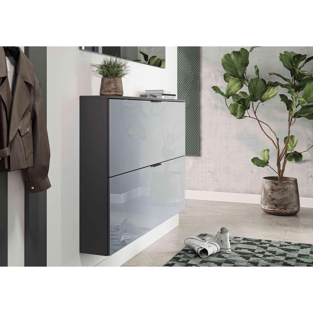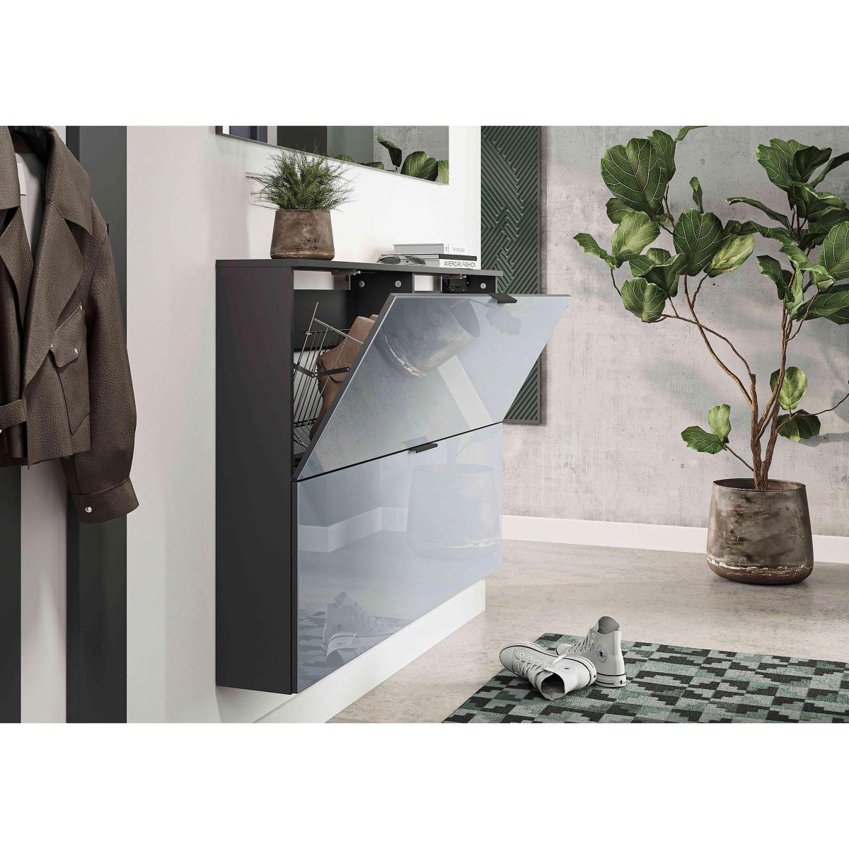 Bring clean contemporary style to your hallway and turn it into a functional and very family-friendly space with our Valega range of ergonomic hallway furniture and matching light-enhancing wall mirror. The range comprises two clever clutter-busting items designed for smaller spaces – a slimline shoe cabinet that can hide away 12 pairs of shoes, and a vertical coat rack that sits almost flush to the wall. The graphite grey finish is right on trend and is made of a super-durable scratch-resistant melamine. The Valega range is designed and made in Germany, and is a Furniture Village online exclusive. This stylish and slim modern shoe cabinet makes it easy to keep your entryway neat and tidy. There’s space for 12 pairs of shoes behind its two glass pull-down doors. Why you'll love it This slim shoe cabinet has space-saving pull-down doors. Clean modern style in silver and graphite grey. Ideal for everyday use with shock-resistant edges and durable melamine finish. Opaque glass door fronts, slim metal handles. Smooth and silent soft-close doors. Made in Germany. A Furniture Village online exclusive. This shoe cabinet is part of the Valega range. What you need to know Easy self-assembly required, full instructions included. Holds up to 12 pairs of shoes. Finished with a durable melamine resin coating. Designed to be wall-mounted. Fixtures included. Screws and dowels may be required, depending on the condition of the wall. WARNING!Furniture can tip over unexpectedly and cause injury. This item must be fixed to a wall using the anti-tip kit provided. Be sure to use the correct wall fixings suitable for the walls in your home. Furniture Village is not able to fix anti-tip devices for you. Seek professional advice if you are unsure.