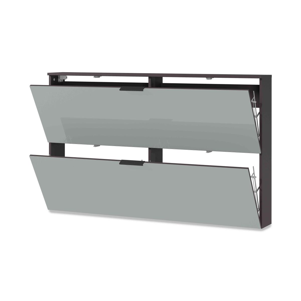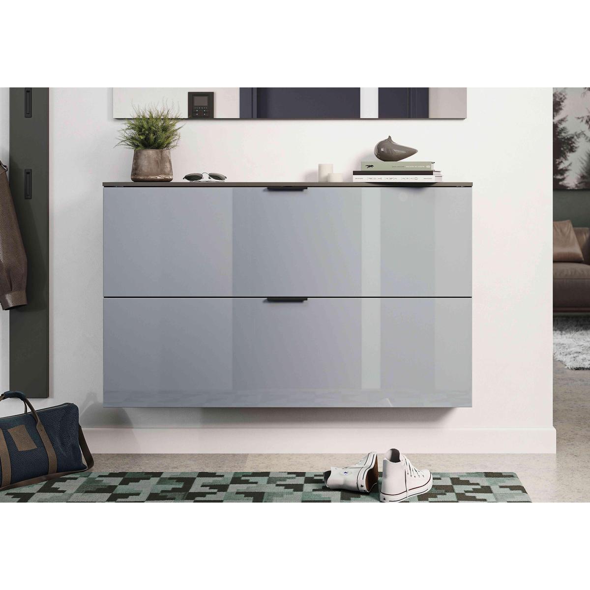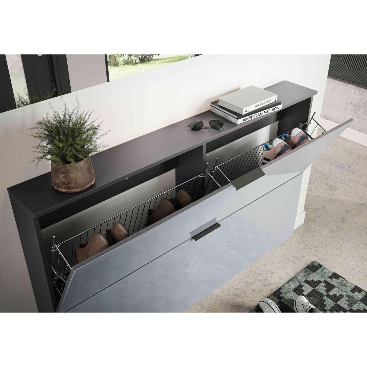 Bring clean contemporary style to your hallway and turn it into a functional and very family-friendly space with our Valega range of ergonomic hallway furniture and matching light-enhancing wall mirror. The range comprises two clever clutter-busting items designed for smaller spaces – a slimline shoe cabinet that can hide away 12 pairs of shoes, and a vertical coat rack that sits almost flush to the wall. The graphite grey finish is right on trend and is made of a super-durable scratch-resistant melamine. The Valega range is designed and made in Germany, and is a Furniture Village online exclusive. This stylish and slim modern shoe cabinet makes it easy to keep your entryway neat and tidy. There’s space for 12 pairs of shoes behind its two glass pull-down doors. Why you'll love it This slim shoe cabinet has space-saving pull-down doors. Clean modern style in silver and graphite grey. Ideal for everyday use with shock-resistant edges and durable melamine finish. Opaque glass door fronts, slim metal handles. Smooth and silent soft-close doors. Made in Germany. A Furniture Village online exclusive. This shoe cabinet is part of the Valega range. What you need to know Easy self-assembly required, full instructions included. Holds up to 12 pairs of shoes. Finished with a durable melamine resin coating. Designed to be wall-mounted. Fixtures included. Screws and dowels may be required, depending on the condition of the wall. WARNING!Furniture can tip over unexpectedly and cause injury. This item must be fixed to a wall using the anti-tip kit provided. Be sure to use the correct wall fixings suitable for the walls in your home. Furniture Village is not able to fix anti-tip devices for you. Seek professional advice if you are unsure.