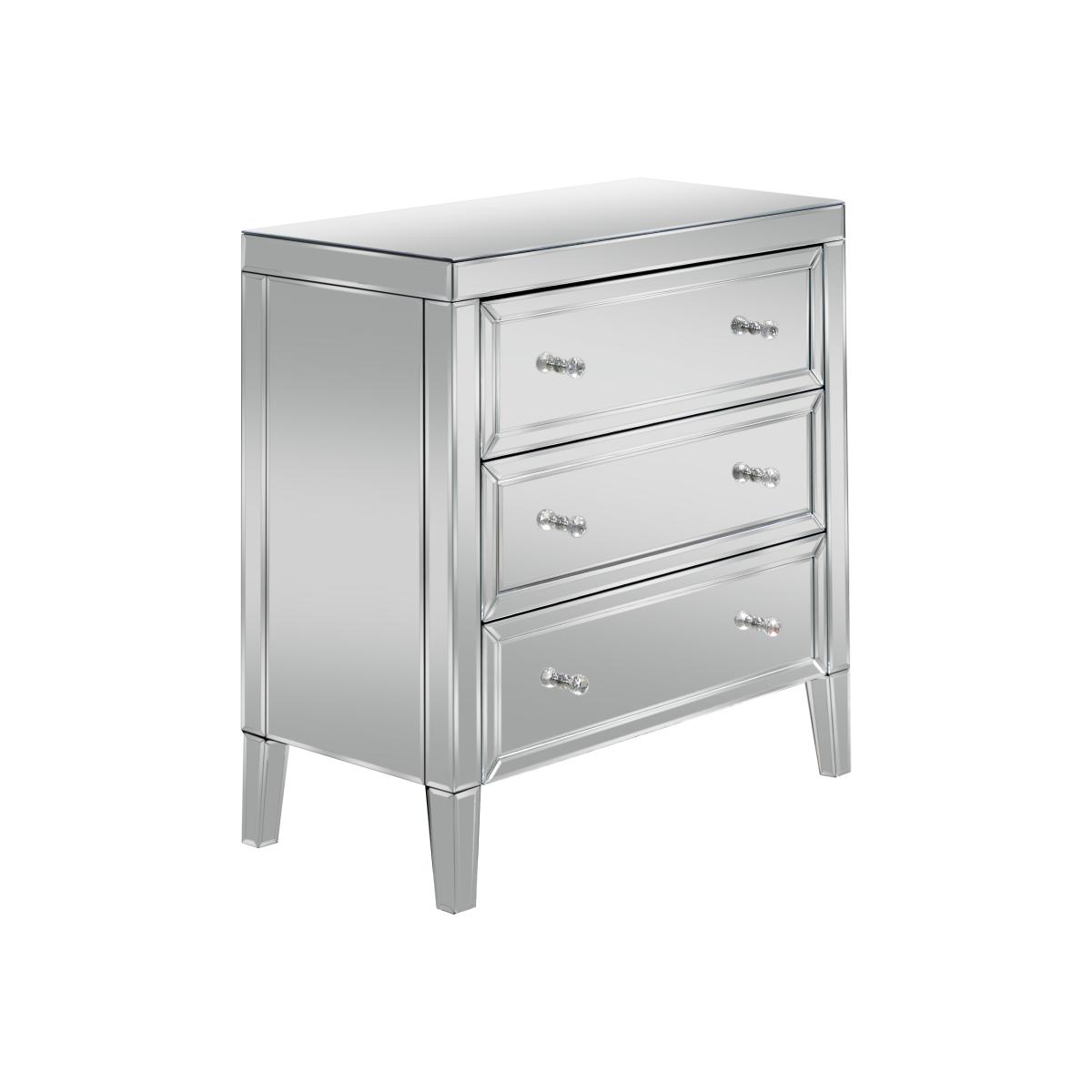 The beautiful and glamorous Valencia 3 drawer chest will be a stylish addition to any bedroom. Constructed from a MDF frame this stunning range features a mirrored finish with bevelled edges and elegant mock crystal handles. This item comes pre-assembled for additional convenience and is part of a complete bedroom collection. Cleaning and Care Wipe with dry cloth