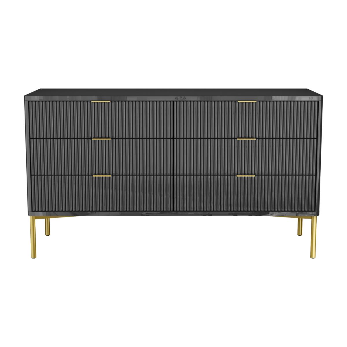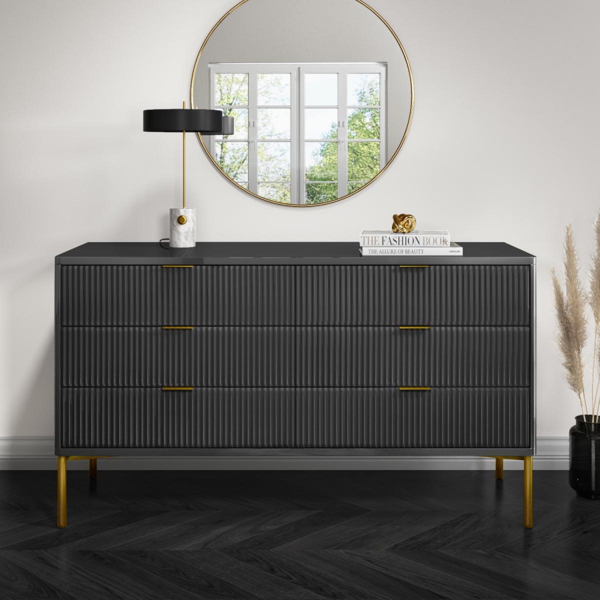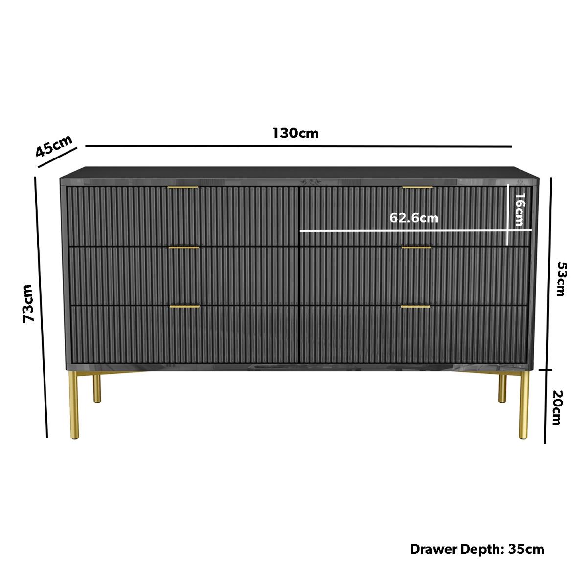 Grey high gloss finish with brushed gold accents Features contemporary ridged detail 6 Drawers provide ample storage for any folded items Grey and gold colours add a touch of glamour to your bedroom Valencia range of furniture is also available in white Easy to assemble Need to know Number of drawers: 6 Colour: High gloss grey and gold Cabinet finish: Lacquered Leg finish: Gold polished stainless steel Material: MDF and metal Weight: 28kg Assembly required: Yes