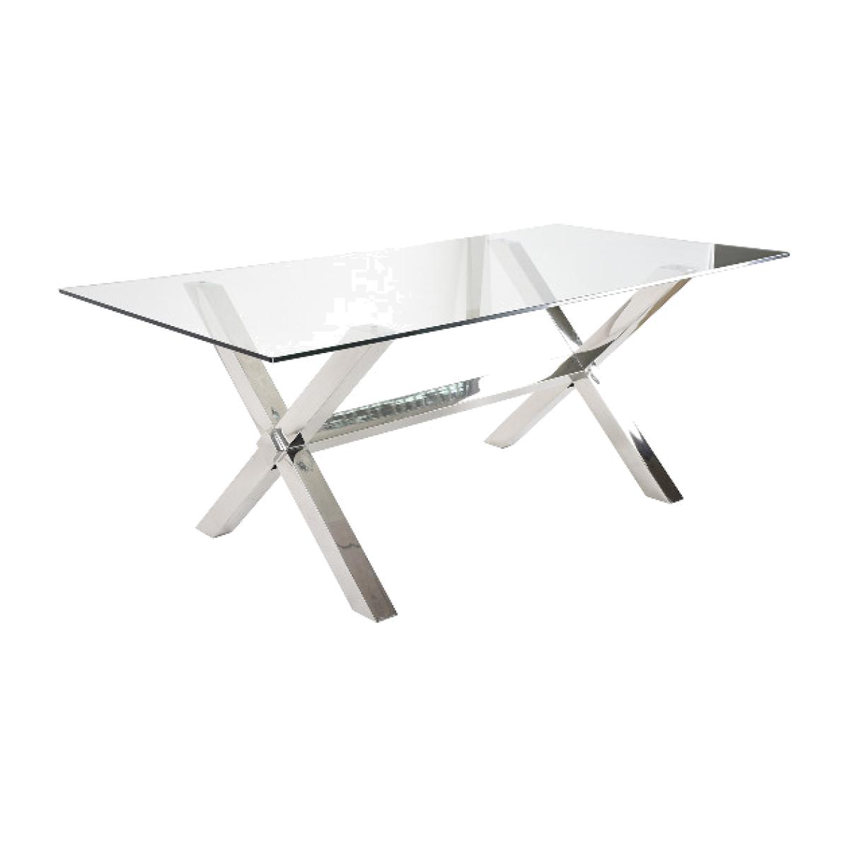 I love this glass dining table because of its sleek, modern look and how it effortlessly enhances contemporary interiors. Its clear glass top creates a sense of space, making it ideal for smaller rooms or open-plan areas. The striking metal base adds an architectural touch that works well in minimalist or industrial styles, but also pairs nicely with softer textures like upholstered chairs or natural wood accents for a more balanced look. For styling tips, pair it with simple, elegant tableware and add a statement centrepiece such as a green plant or stylish candle arrangement. To keep the overall aesthetic uncluttered and airy, avoid overcrowding the surface and opt for streamlined accessories. This table is versatile enough to suit both casual family dinners and more formal entertaining settings.