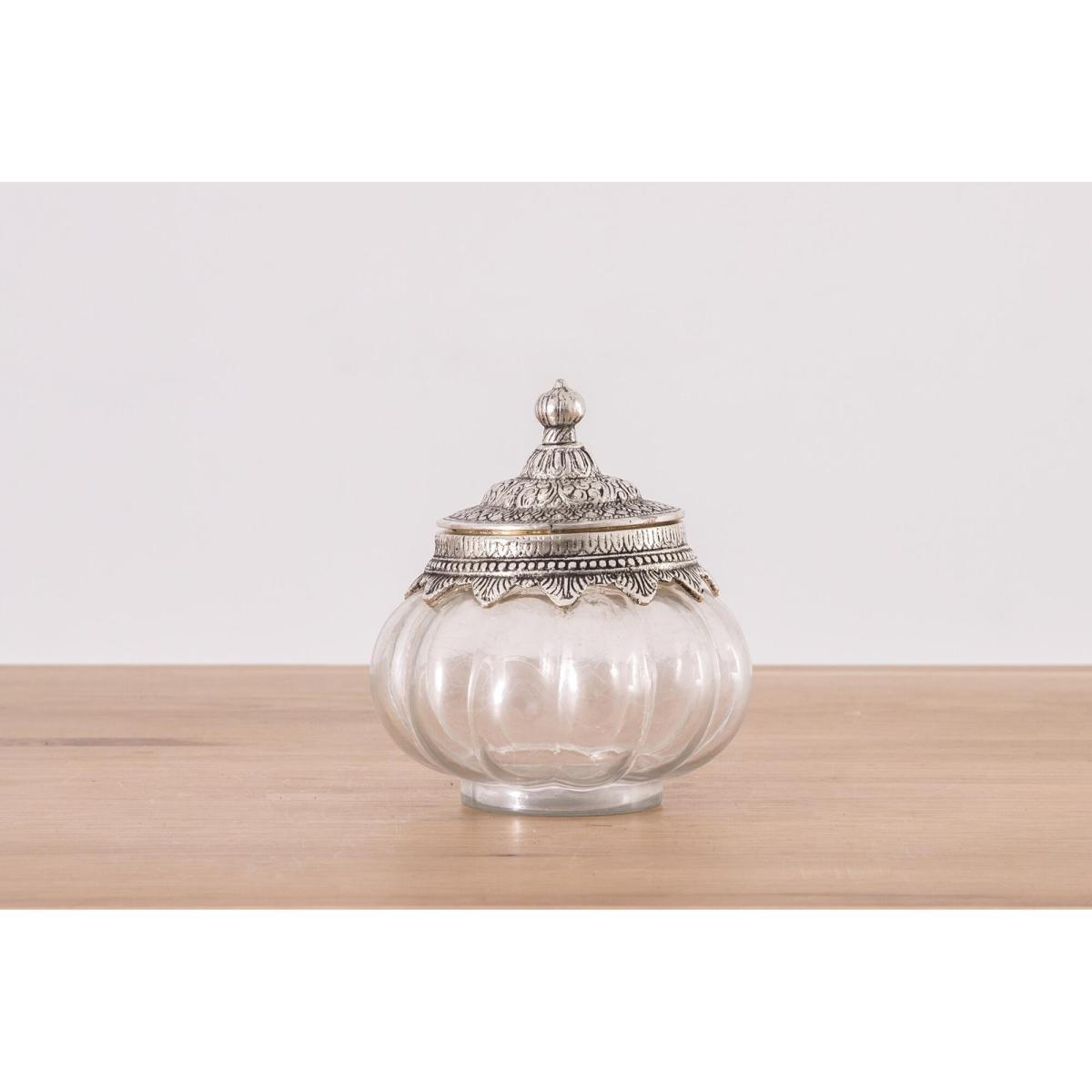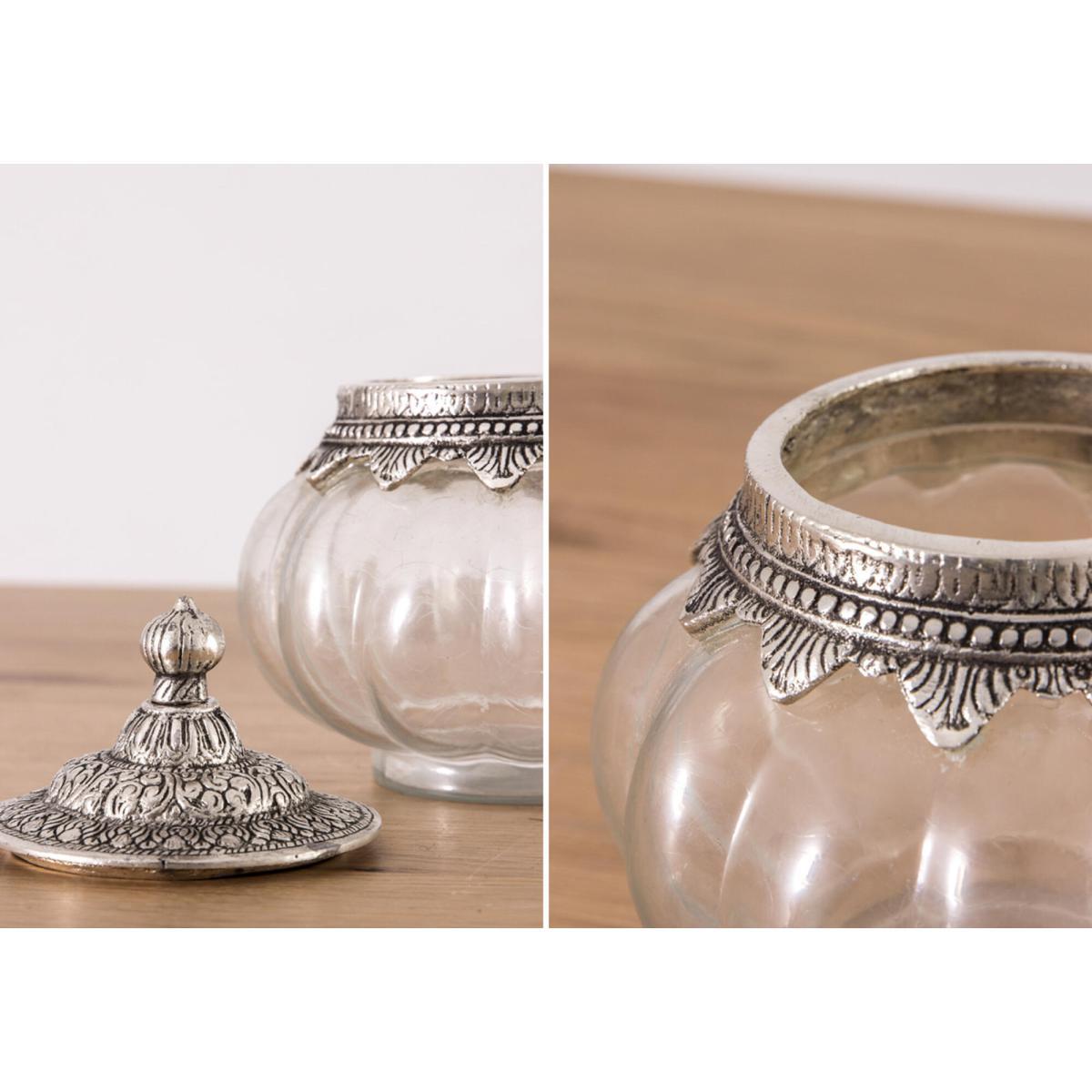 Echoing the glamour of a bygone era, the Valencia Small Lidded Jar is a real beauty! The rounded and textured Glass body is beautifully finished with a beautifully detailed ornate Silver Metal lid. This will look simply stunning wherever you choose to use it.