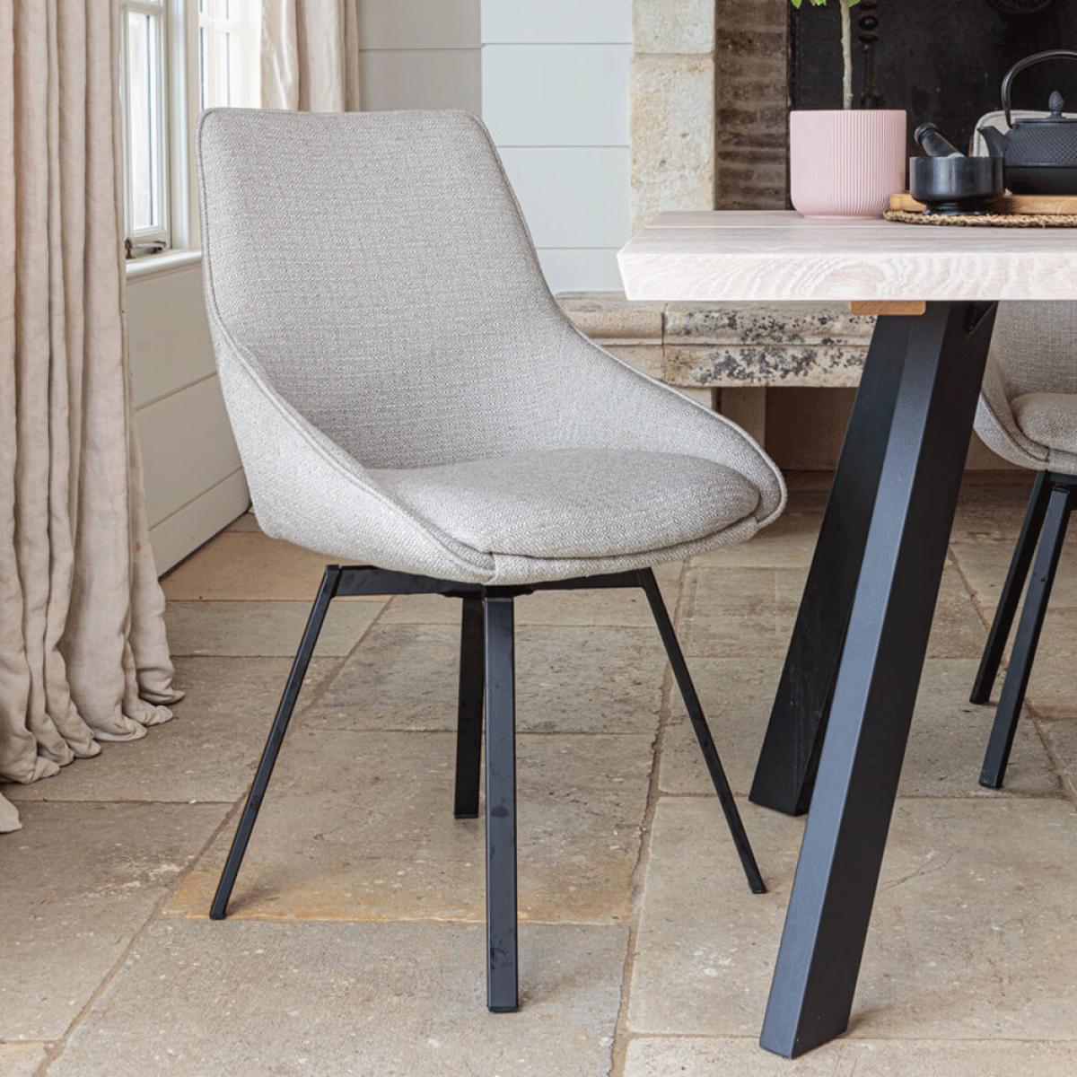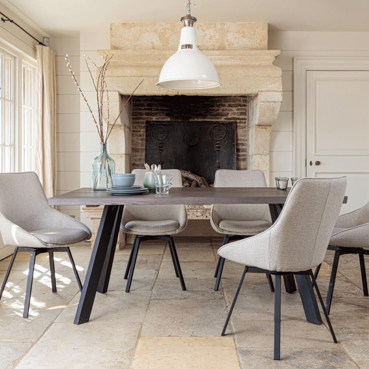 Represents a 5% saving when purchased as a set!. 1. 7 metre table set consists of:. 2. 4 metre table set consists of:. The Valencia oak dining set will add an air of contemporary chic to any home. This modern dining table is constructed from two chunky pieces of solid oak in a smokey dark shade, and has undergone a lacquering process to achieve the beautiful matte finish. A stylistic central divide runs between the length of both pieces. The versatile moody colour of this chunky oak dining table will fit into home spaces with plenty of browns, greys or creams. The table legs are fashionably splayed, and powder coated to protect the sturdy black metal. These legs can be attached to the table at three different points, meaning you can move them further towards the centre of the table for more leg room for those seated at the ends, or they can simply be adjusted to best suit a personal visual preference. With this set we’ve paired the broody colour of the oak top with light grey Gaudi Chairs, the 1. 7 metre table set comes with 4 of these, whereas the 2. 4 metre table set comes with 6 chairs. However, there are 2 other chair set combinations to consider for this table. The Gaudi chair in light grey is a fine modern dining chair with several features to savour. With a swivel design and a comfy seat pad, this chair offers excellent plump cushioning for hours of wining and dining. A cupped shape offers ample support with padding sculpted around this design. The black splayed metal legs have the same powder coating as the table. We see this solid oak furniture becoming the much loved focal point of the home for many.