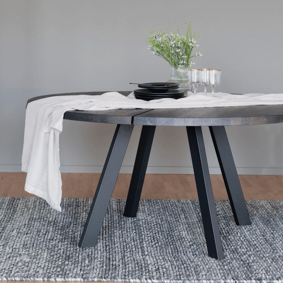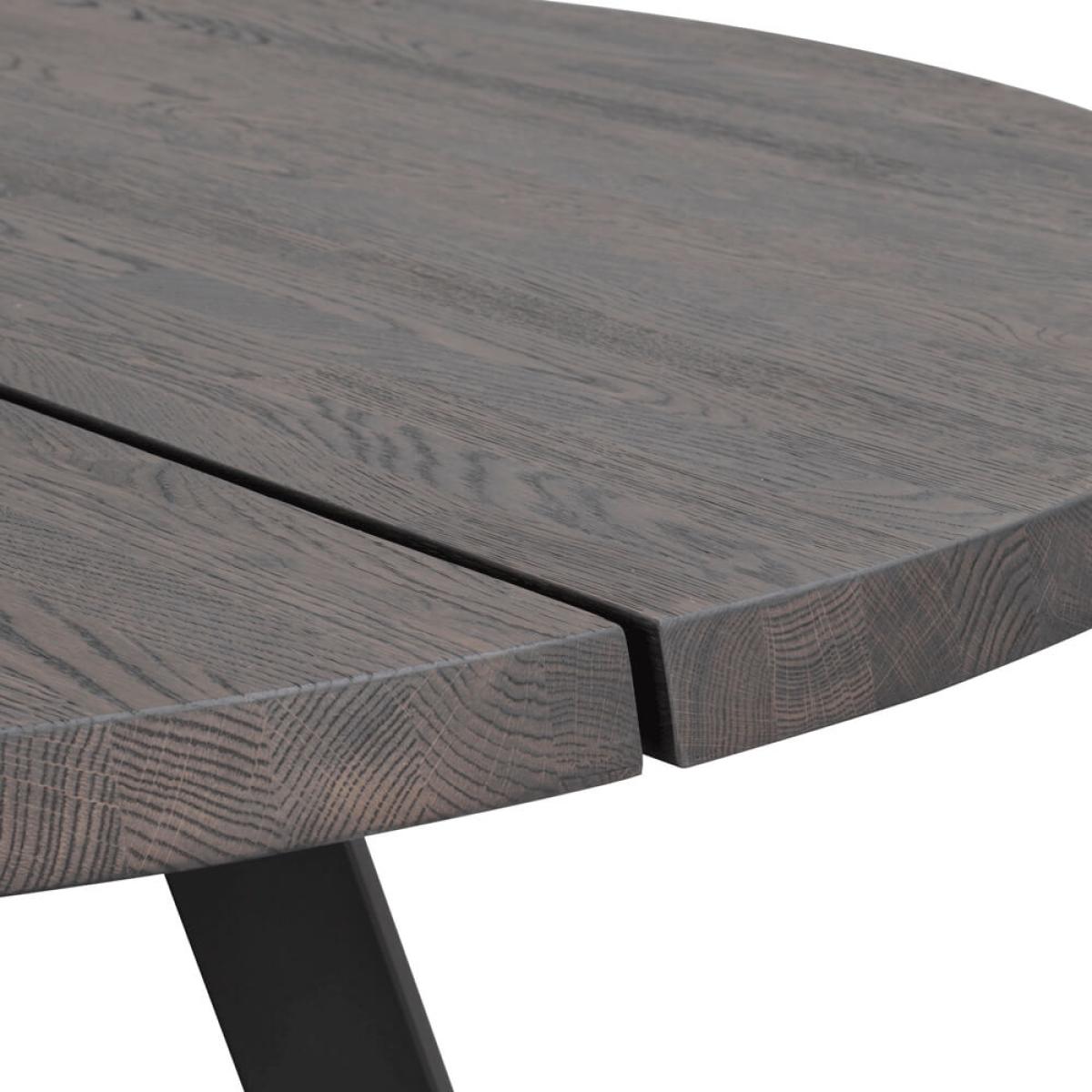 The Valencia Solid Oak Round Dining Table will suit many homes with its combination of a practical round shape and its sophisticated materials. A solid oak table top construction, which comes as a two piece, benefits from a lacquered finish offering added protection. The dark oak takes on an appealing smokey matte finish because of this process, which only adds to the chic style of this modern dining table. This is a pleasingly chunky oak dining table able to fit up to 8 people around it, whilst the round shape means it can fit into more challenging spaces and home layouts. The cut of the table edge is at a stylish oblique angle whilst the artistically splayed legs come in a powder coated black metal, offering an exceptionally sturdy base. We tend to think the. Gaudi. Or. Dali. Chairs best complement this solid oak dining table but you can mix and match with any of our chairs. This table also comes in a light and breezy. Natural Oak. Shade.
