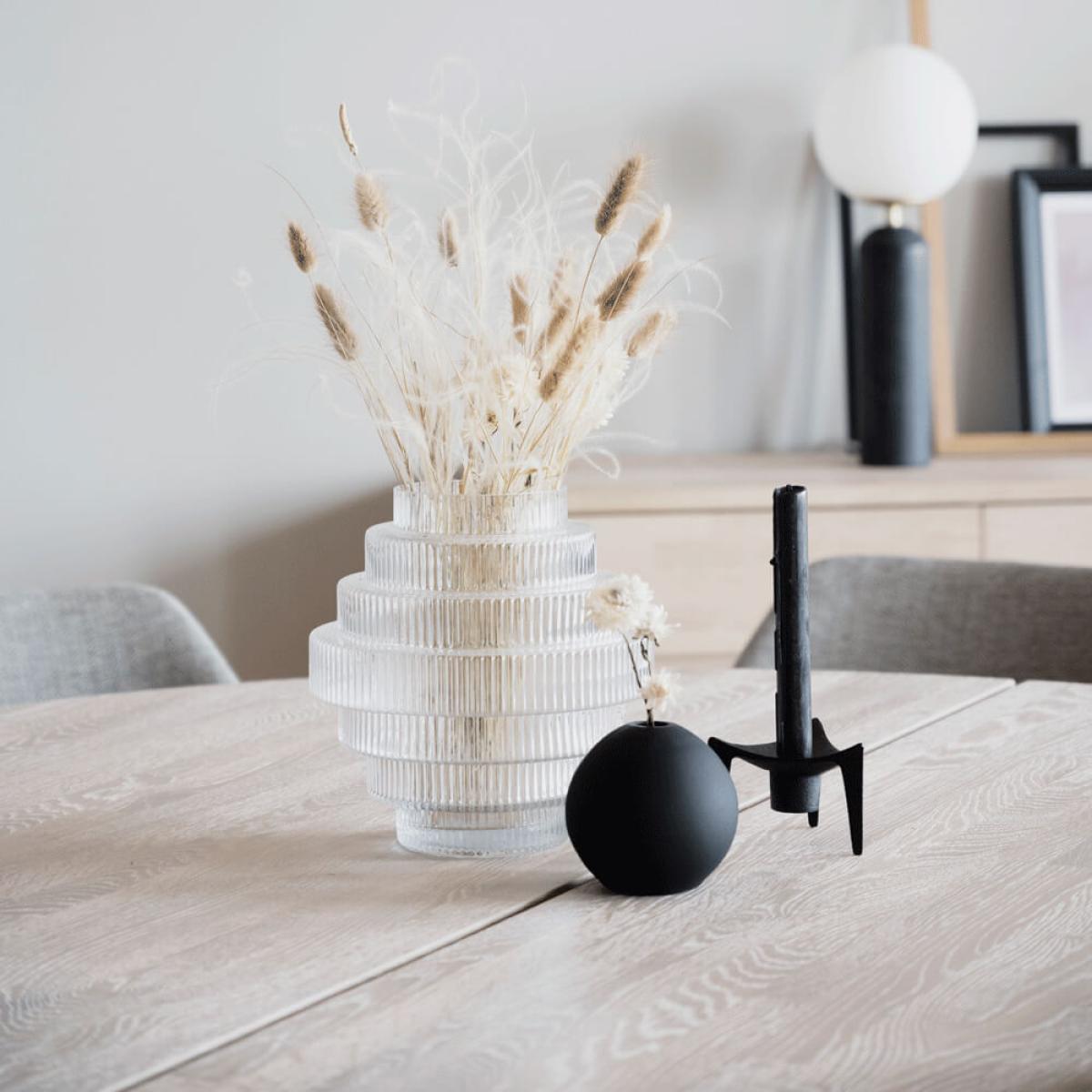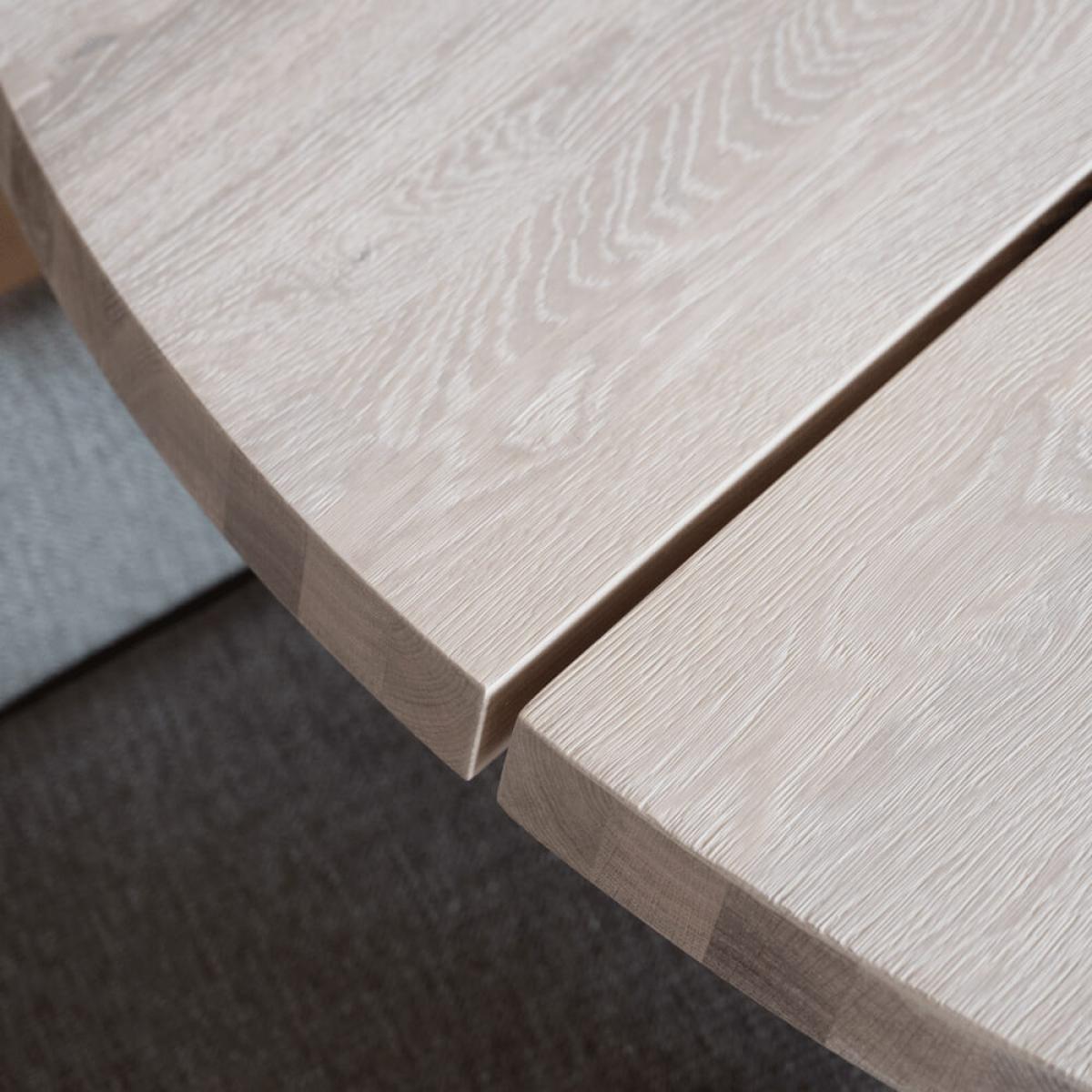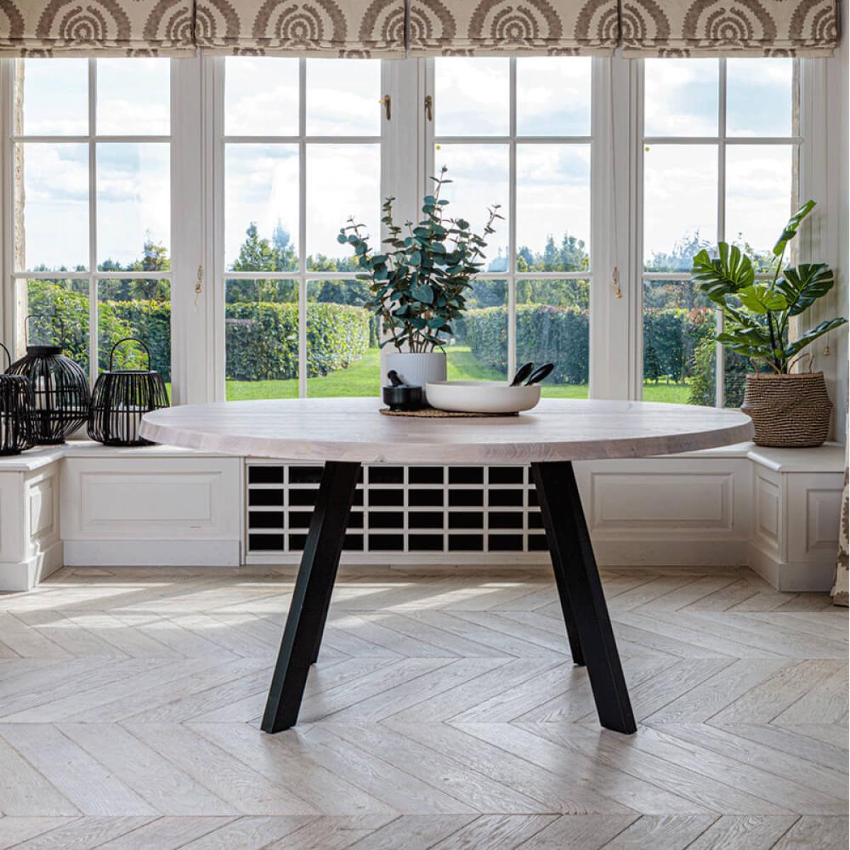 Insert some contemporary chic into the home with this light and bright, large solid oak dining table. The new Valencia furniture range boasts fine quality, with chunky dining tables at the heart of this collection. The solid oak surfaces have been lacquered for added protection and stylish appearance. In this case having undergone a white pigmenting process to achieve the lovely neutral oak shade. A tone we think will comfortably slot into many homes with ease. Modern splayed table legs support the sizeable solid oak table top, a design constructed from powder coated metal to ensure a longer life and little needed in the way of maintenance, just a wipe clean now and again. The round shape of this solid oak furniture gives a level of versatility too – place into irregular shaped spaces, this table will happily seat 8 people. We think it’s best paired with the. Gaudi Dark Grey Chair. , also. Available as a set. With inbuilt 5% discount.