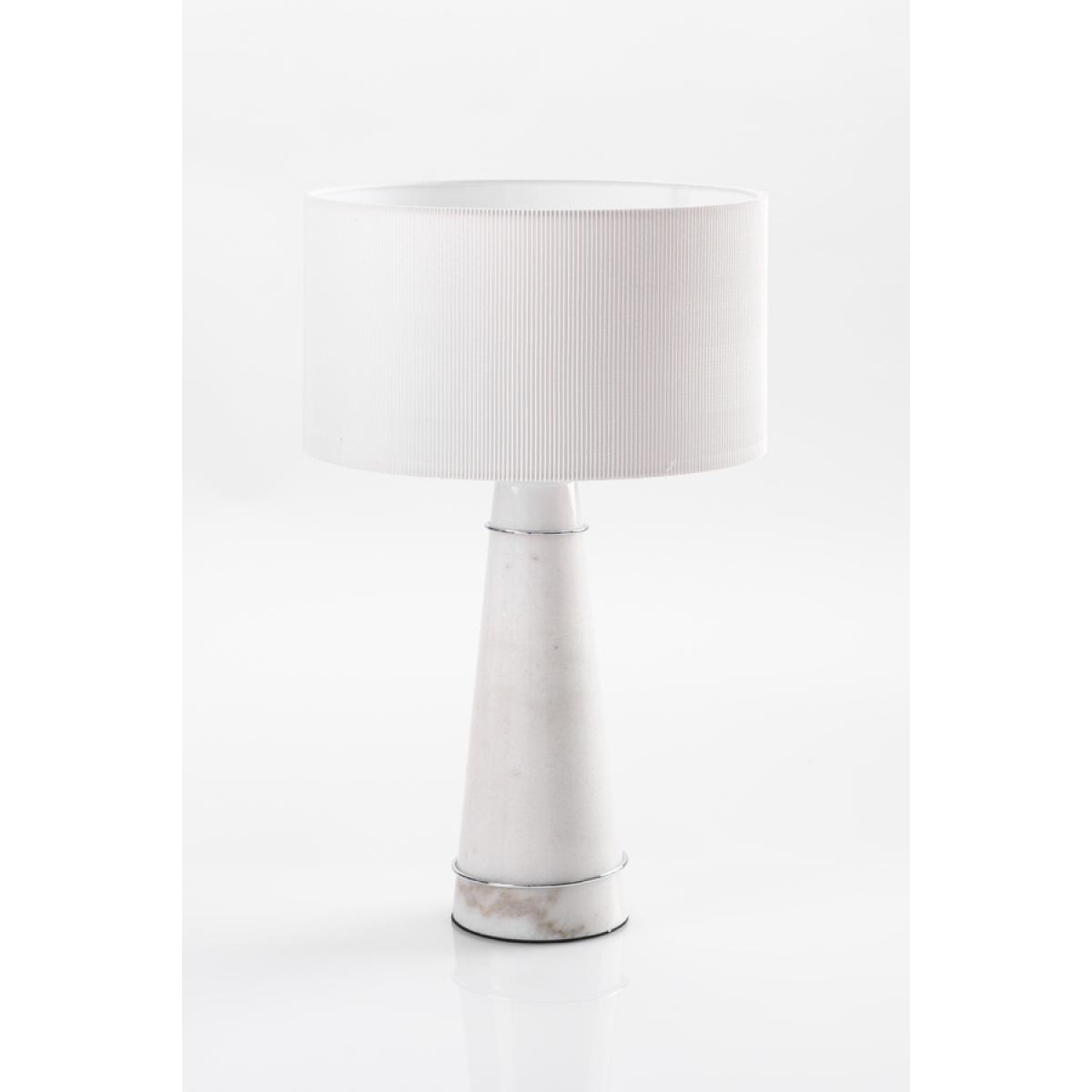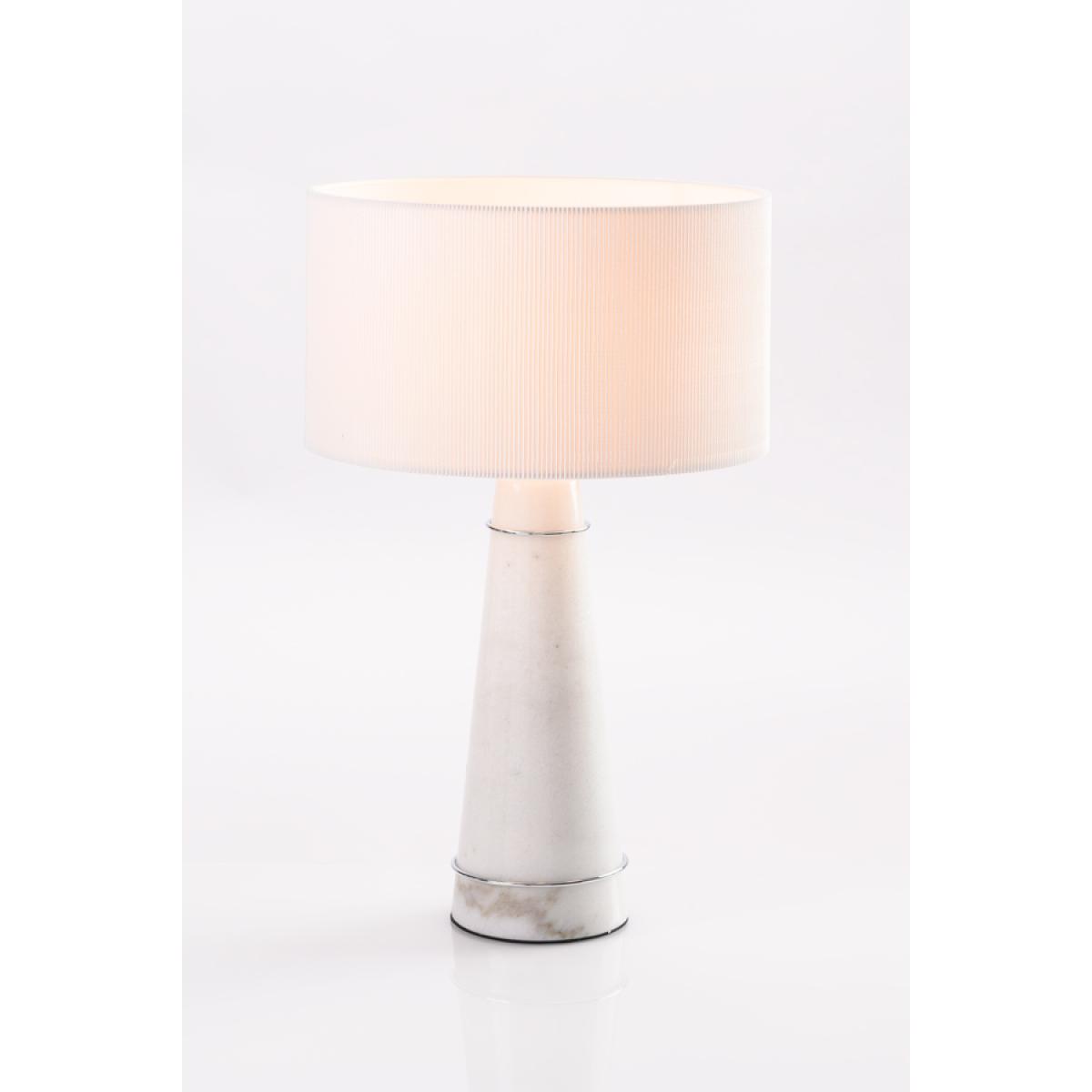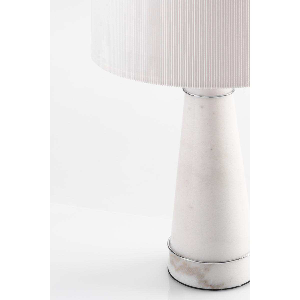 An elegant, contemporary table light Polished white marble base A charming pleated light shade in white Stainless steel metal ring detailing in a polished chrome finish Supplied with a G50 E27 non dimmable bulb Due to its natural formation every piece of marble is unique. There may be subtle differences in colour, tone and composition from the image shown. On occasions fissures may be present, these are natural characteristics and do not compromise the marble’s structural integrity. Wipe with a soft, dry cloth. Avoid using chemical-based cleaners as these could damage the finish.