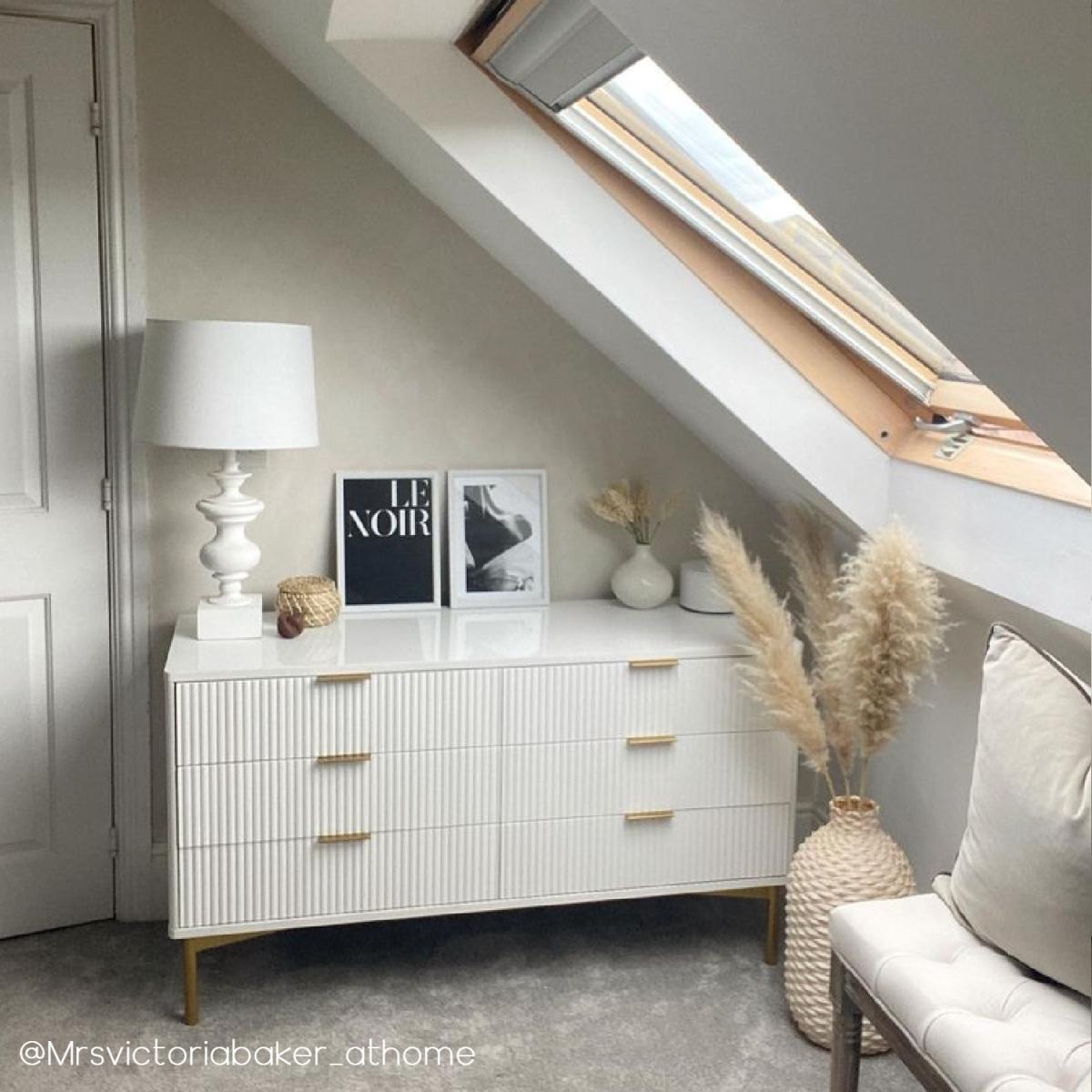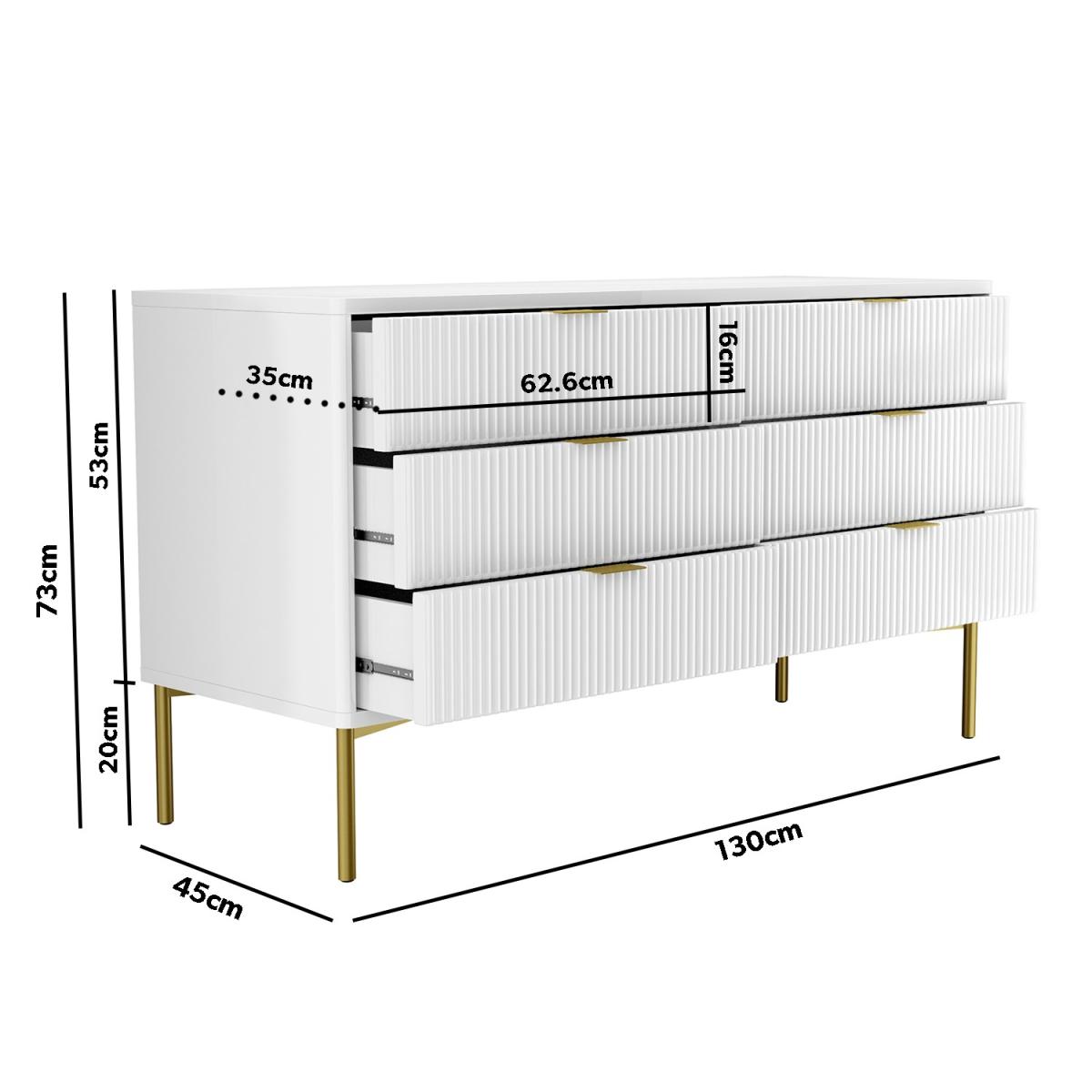 Features we love White high gloss finish with brushed gold accents. Features contemporary ridged detail for added texture6 Drawers provide ample storage for any folded items. The on-trend white and gold adds a touch of glamour to your bedroom. Valencia range of furniture is also available in grey Easy to assemble. Need to know. Dimensions. W130 x D45 x H73 cm Drawer dimensions. W62.6 x D36.8 x H16 cm Number of drawers. 6 Colour. High gloss white and gold Cabinet finish. Lacquered Leg finish. Gold polished stainless steel Material. MDF and metal Weight. 28kg Assembly required. Yes..