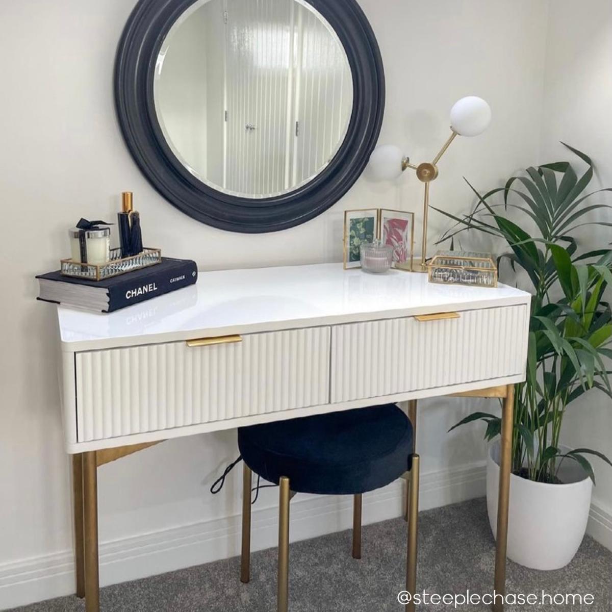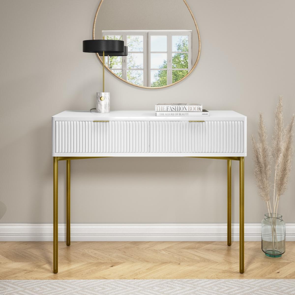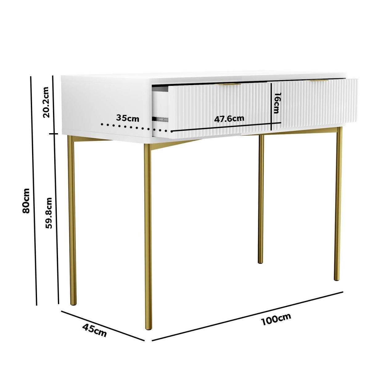 White high gloss finish with brushed gold accents Features contemporary ridged detail Two spacious drawers, perfect for storing make-up The on-trend white and gold adds a touch of glamour to your bedroom Valencia range of furniture is also available in grey Easy to assemble Need to know Number of drawers: 2 Colour: High gloss white and gold Cabinet finish: Lacquered Leg finish: Gold polished stainless steel Material: MDF and metal Weight: 25kg Assembly required: Yes