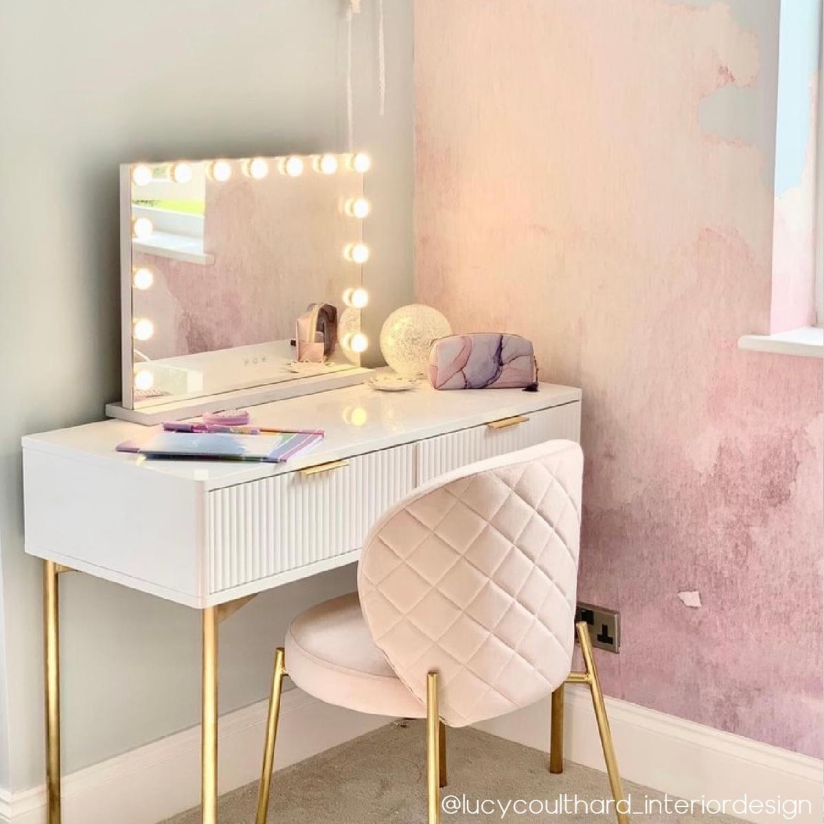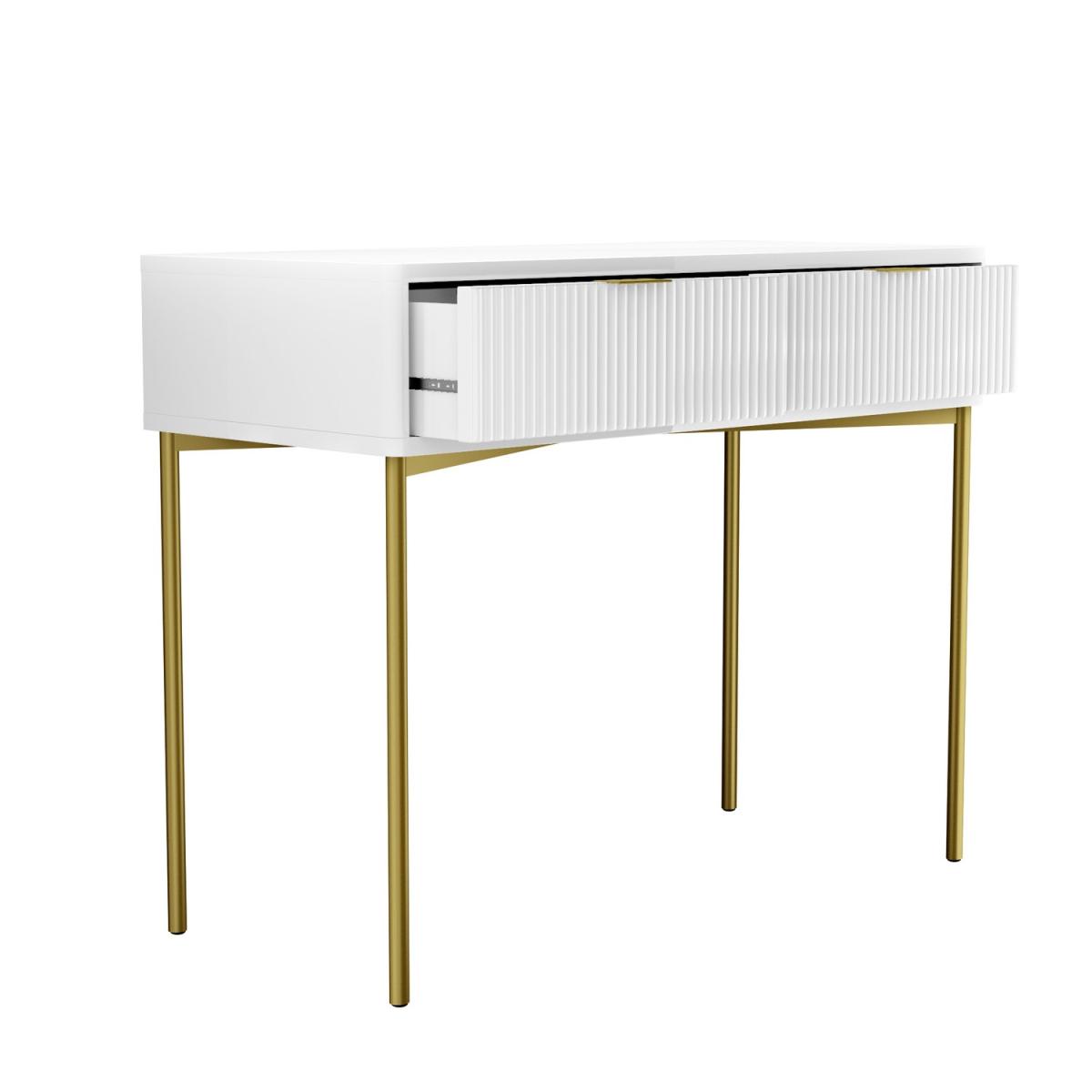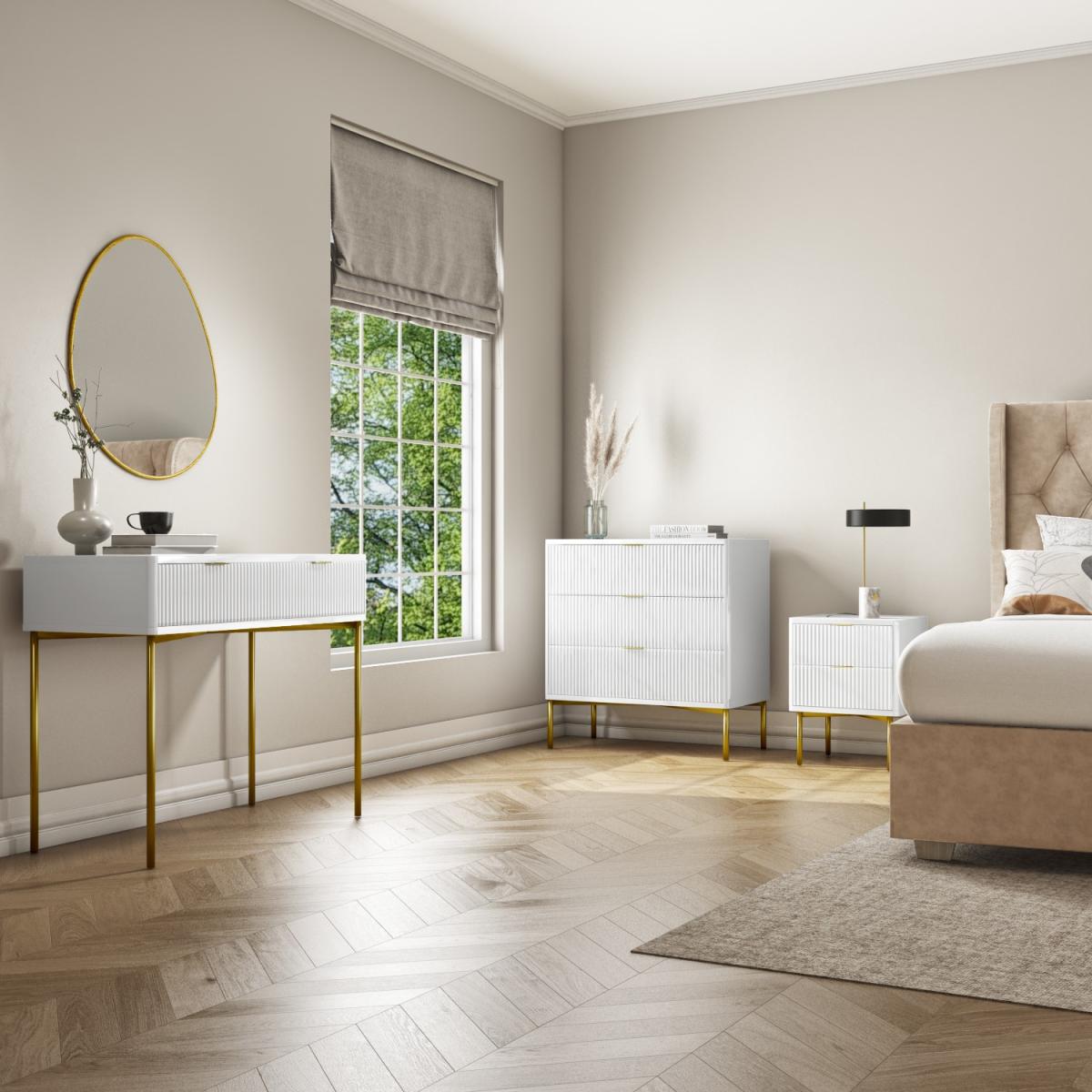 White high gloss finish with brushed gold accents Features contemporary ridged detail Two spacious drawers, perfect for storing make-up The on-trend white and gold adds a touch of glamour to your bedroom Valencia range of furniture is also available in grey Easy to assemble Need to know Number of drawers: 2 Colour: High gloss white and gold Cabinet finish: Lacquered Leg finish: Gold polished stainless steel Material: MDF and metal Weight: 25kg Assembly required: Yes