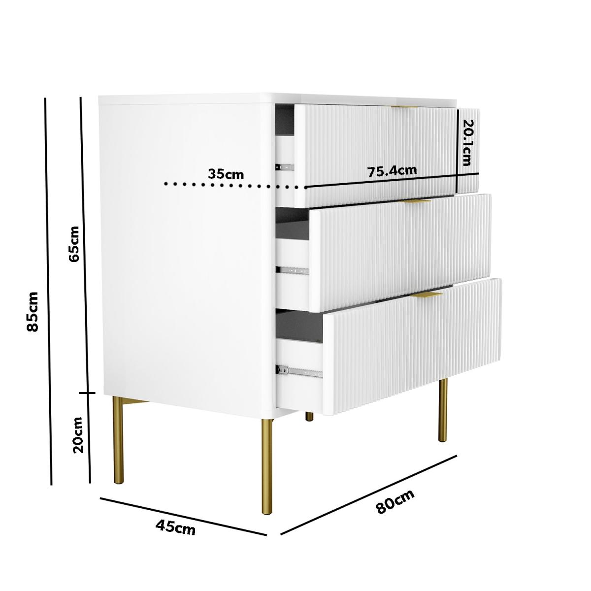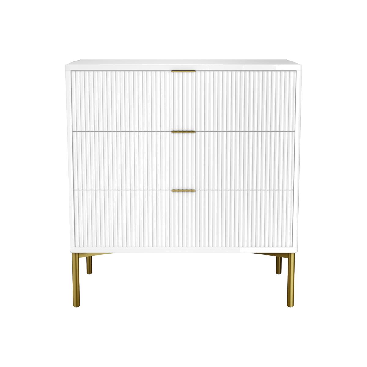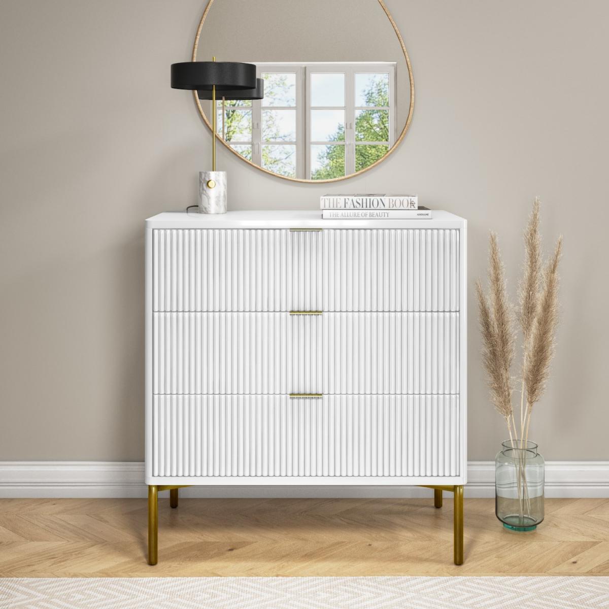 White high gloss finish with brushed gold accents Features contemporary ridged detail 3 Drawers provide ample storage for any folded items The on-trend white and gold adds a touch of glamour to your bedroom Valencia range of furniture is also available in grey Easy to assemble Need to know Number of drawers: 3 Colour: High gloss white and gold Cabinet finish: Lacquered Leg finish: Gold polished stainless steel Material: MDF and metal Assembly required: Yes