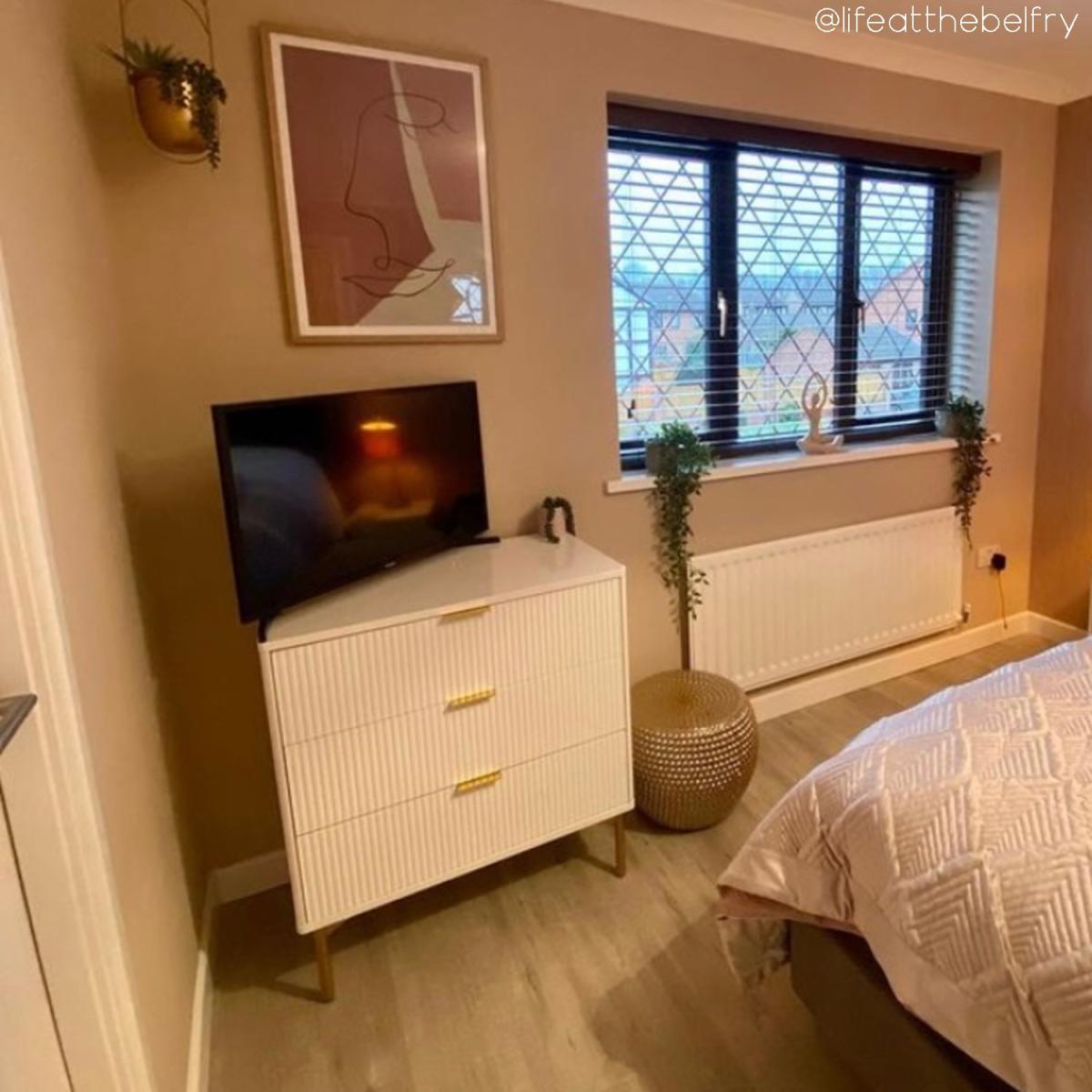 I’m a fan of this groove-front white chest for its clean lines and high-gloss finish, which adds brightness without feeling clinical. The slim brass legs and subtle handles give it a modern-luxury edge, making it a great fit for Scandi, contemporary or minimalist schemes. Styling-wise, top it with a round mirror or an asymmetrical wall shelf, a small ceramic lamp and a couple of sculptural vases to break up the gloss. In a bedroom it works well as bedside storage or in an entrance hall with a tray for keys and post.