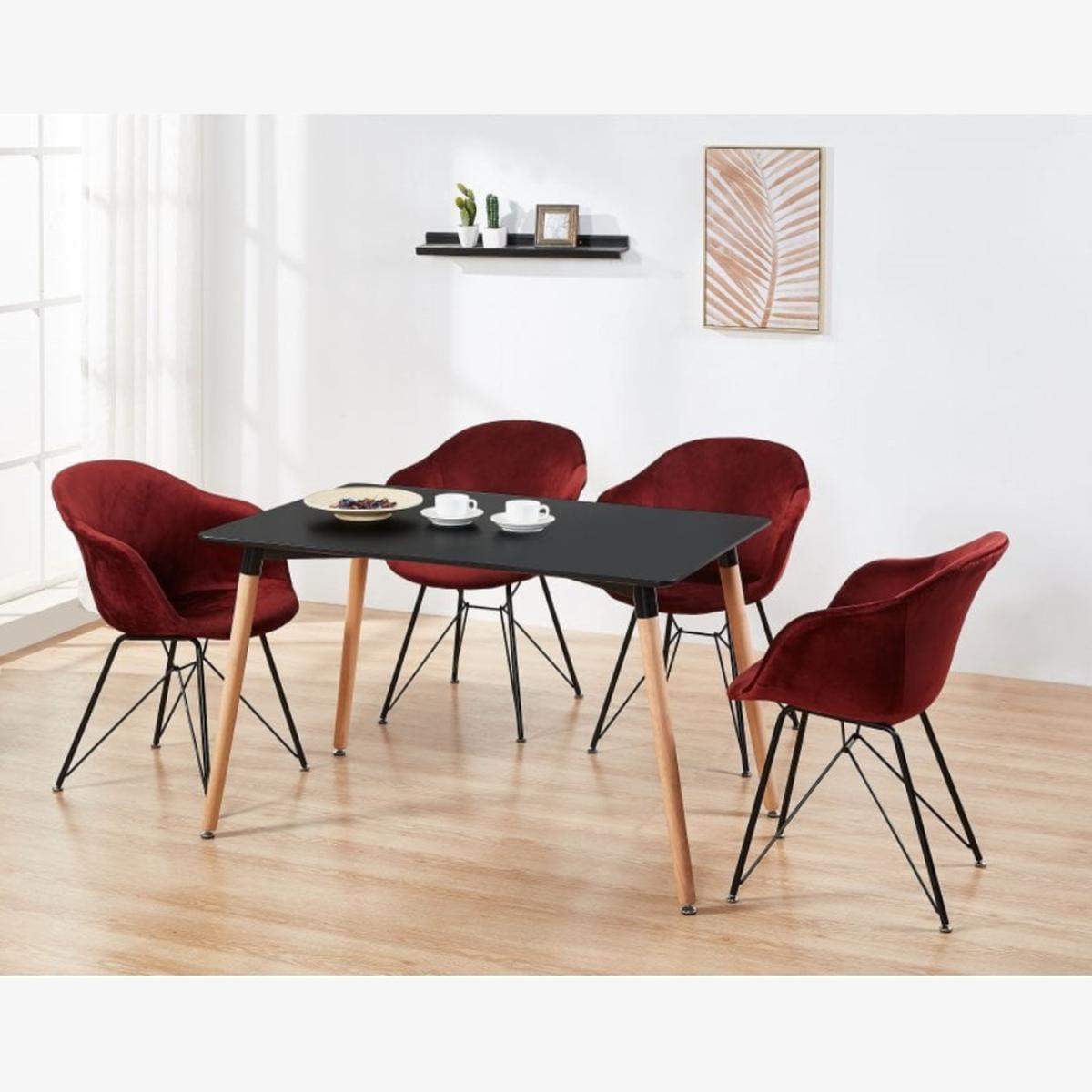 The dining set includes the Halo table that is simplistic and has a versatile design which, as well as a dining table, could also work as a desk. The solid wooden legs feature floor protectors to avoid scratching your floors, and the laminated tabletop is wipe-clean with a subtle satin sheen. The table comes with Valentina velvet chairs. The velvet body and sturdy legs will keep your guests comfy, while your home stays cosy. The quality materials used will ensure these chairs looks fantastic for years to come. Despite having a wonderful, smooth velvet finish to an already fantastic chair, additional care has gone into making the metal powder-coated black legs.