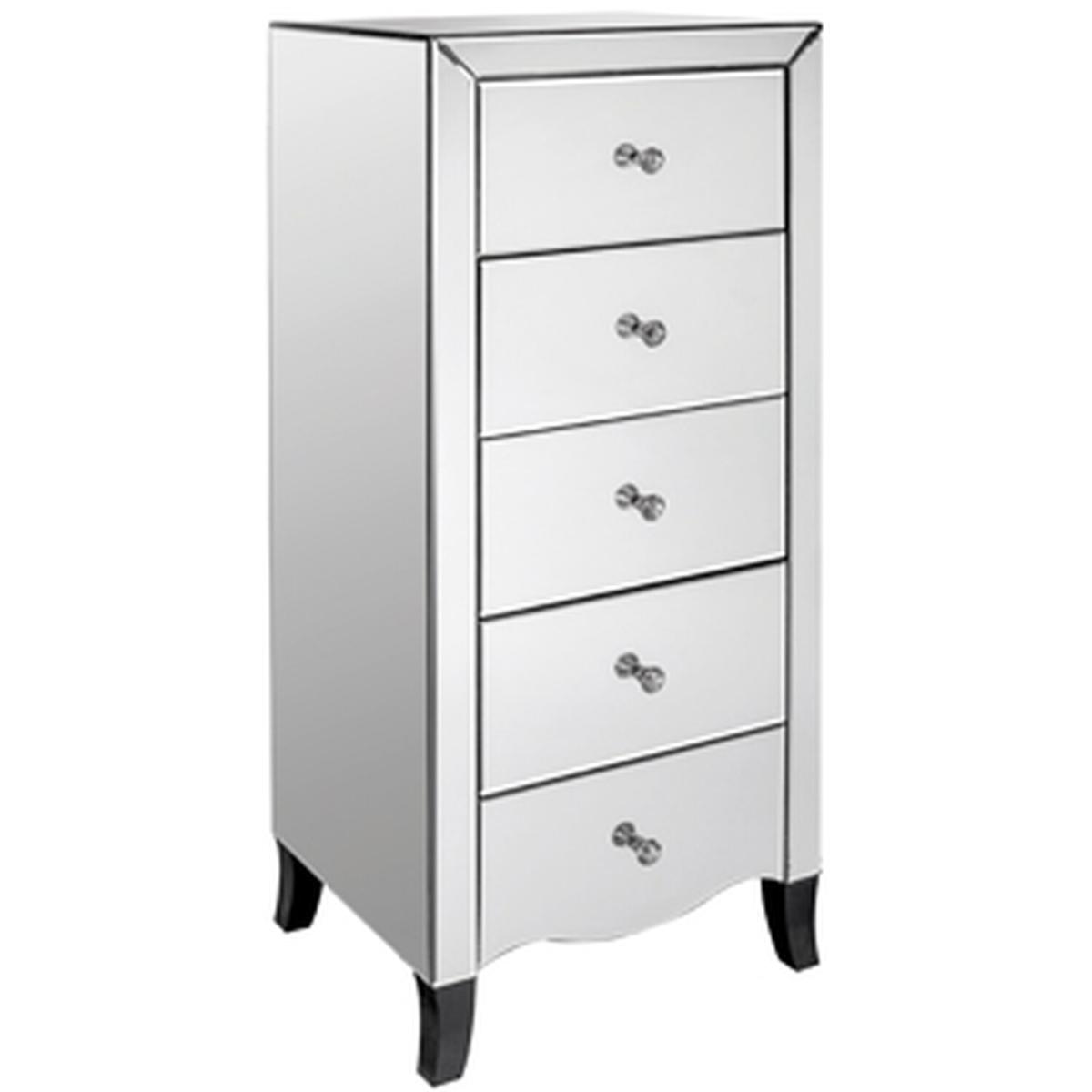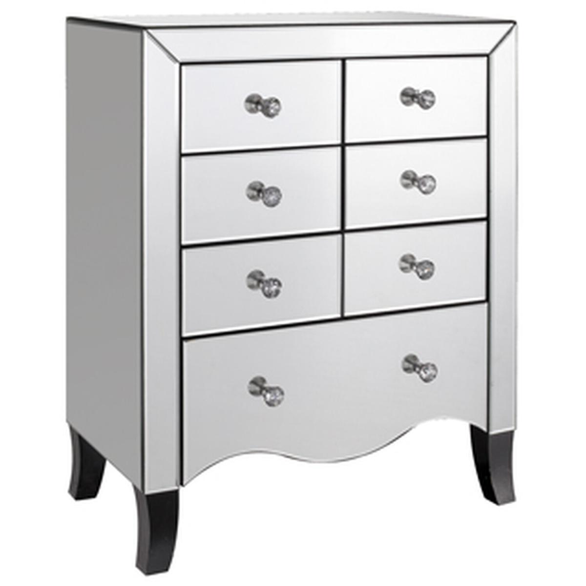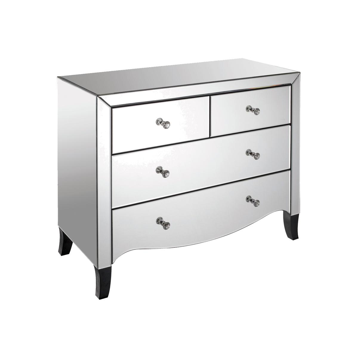 Adding light and whimsical beauty has never been easier with the introduction of the Valentina Mirrored Chest. Comprised of spacious drawers with crystal effect handles and matching mirrored carcass and top, the piece rests elegantly on black bowed legs. Reflecting light around any space this classically shaped piece of furniture is perfect for bringing on-trend glamour into your living space.