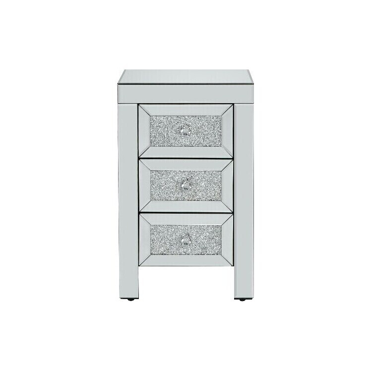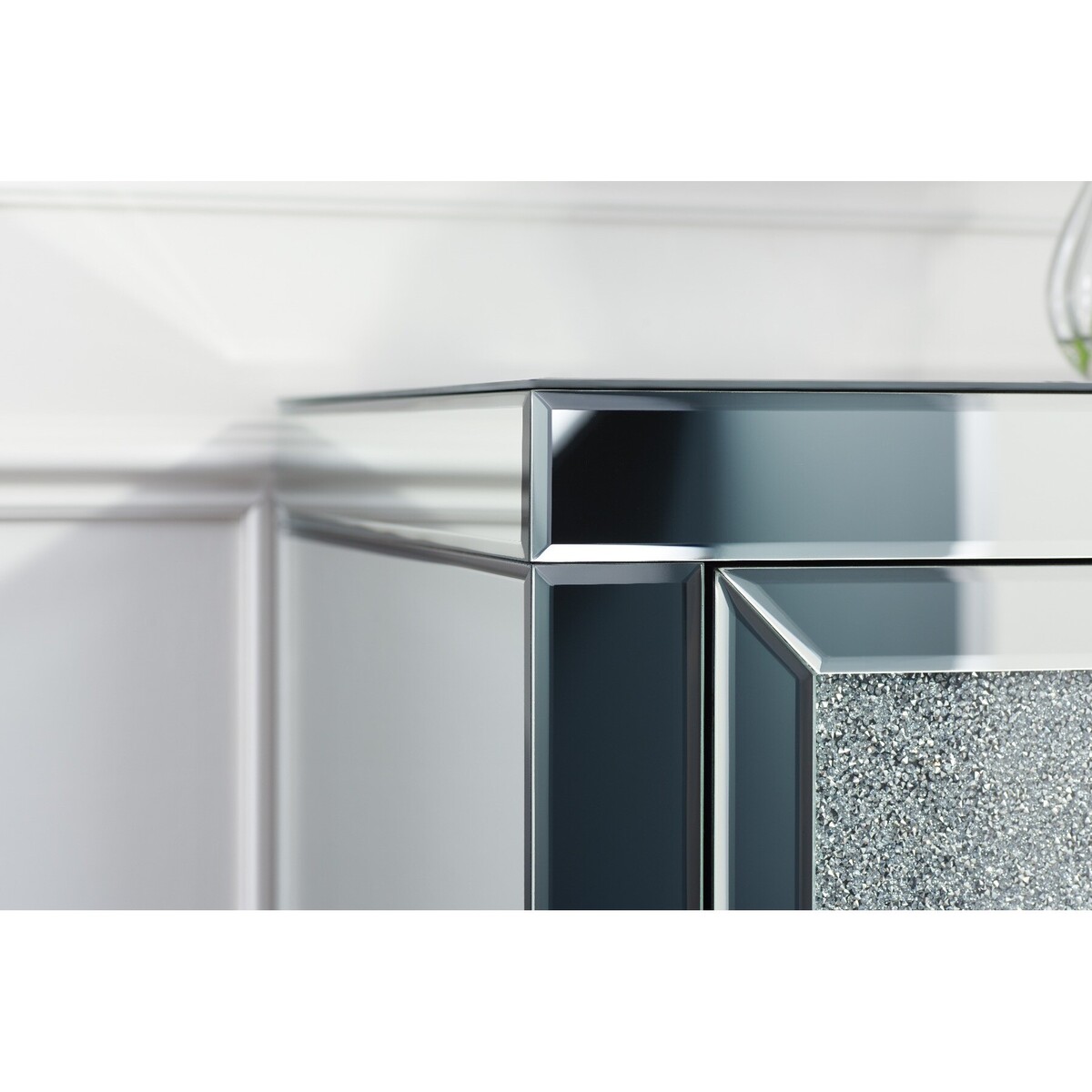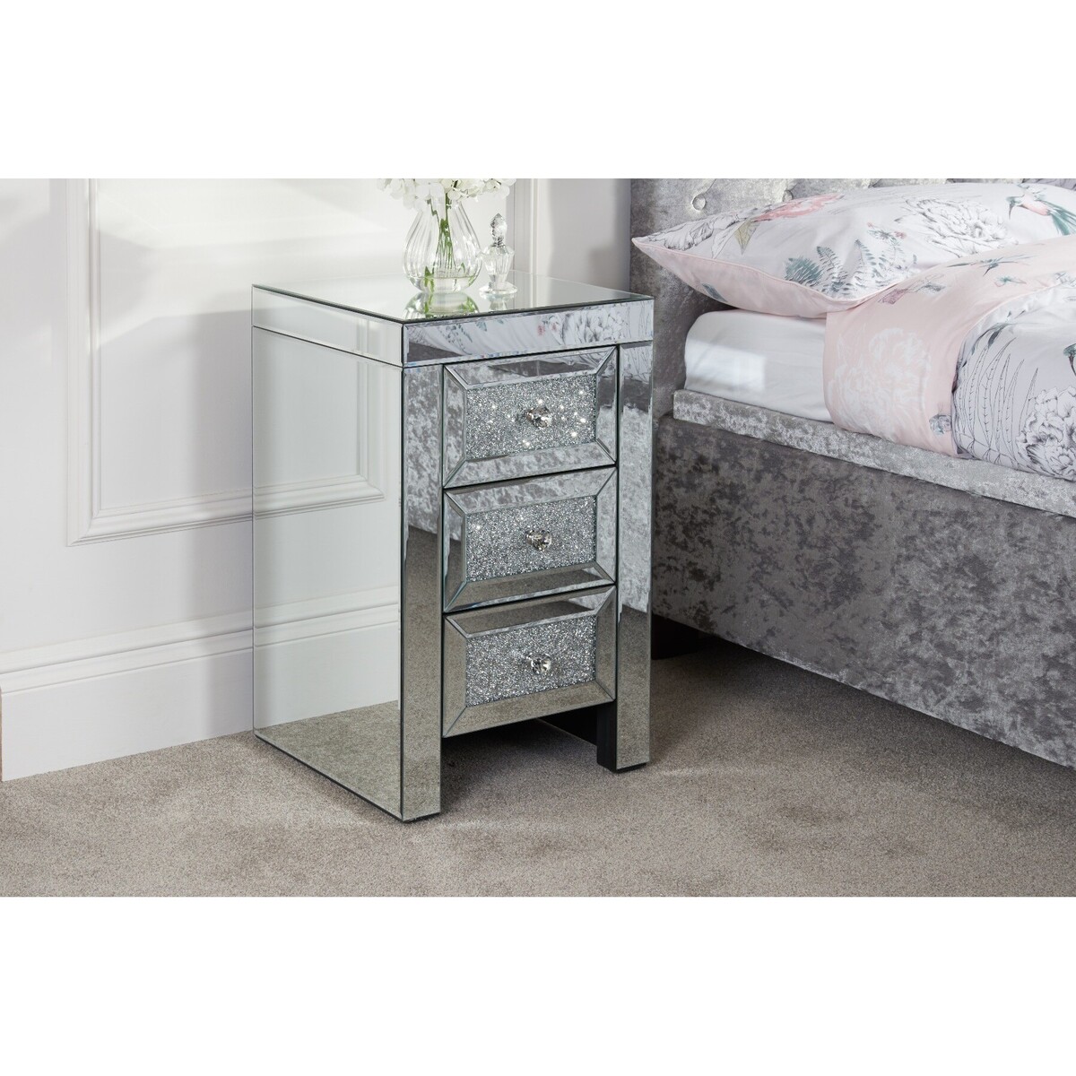 The three drawer bedside table from the beautiful Birlea range is the perfect piece for a feminine and glamourous bedroom. Crafted from clear cut glass and incorporating stunning crystal decoration, bevelled edges and a mirrored crystal finish - this is certainly a luxe range! Stunning crystal handles High mirror shine and crystal detailing Three generous drawers Matching items available