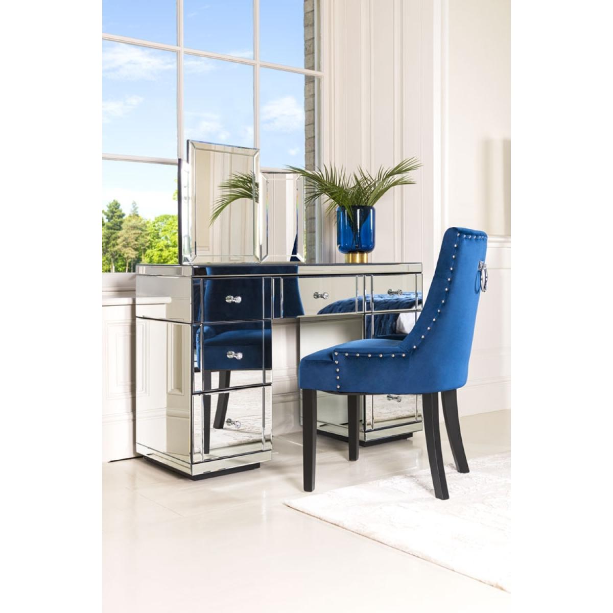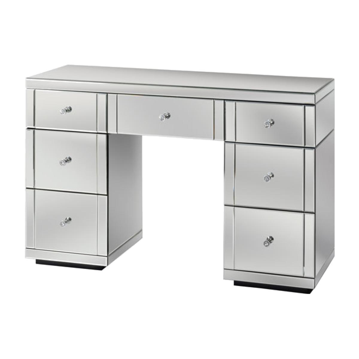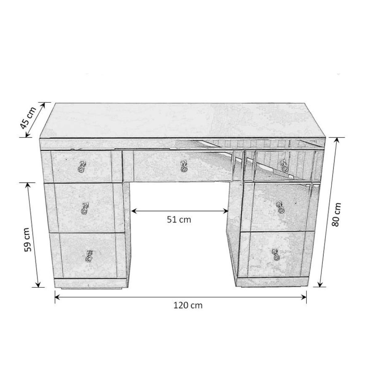 The VALERIA mirrored desk / console is the latest addition to our mirrored furniture range. Constructed with especially treated toughened mirror - nearly unbreakable. It is the largest of our mirrored consoles and the ultimate focal point in any room. It features 7 spacious drawers that will accommodate your items of clothing, accessories - make up and everything else in between. It will add glamour and luxury to your hallway, bedroom or living room for an affordable price. This console table is part of our Chelsea range - In this range you will also find a matching dressing console (MADISON) , a bedside table - (LUCIA) ,a low chest of drawers (FLAVIA) and a tall boy (JULIANA). Height To Kneehole 59cm. Middle drawer: W45. 5 cm x D 34cm x H 10 cm. Left / right top drawers: W 27cm x D 34cm x H 10cm. Left/ right bottom drawers: W 26 cm x D 33cm x H 15cm. Weight: 55Kg after assembly. Mirror and Chair Not Included. This item arrives in 3 different parts that require simple assembly (2 persons required).