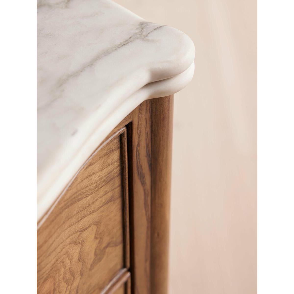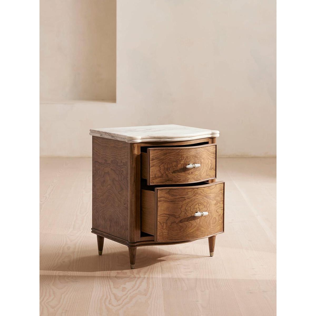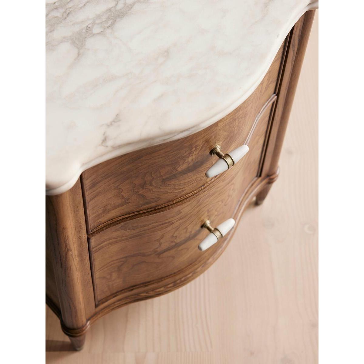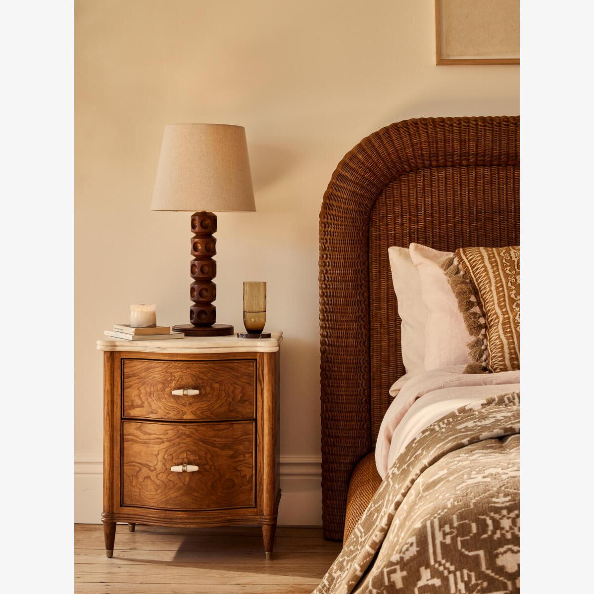 Mirroring the 1940s-inspired glamour of Soho House Paris, our Valerie bedside table is ideal for recreating the House's set-up in your own home. The classic front swoop silhouette has been created with a solid ash frame and an olive ash burl finish. Arabescato Corchia marble on the top elevates the wood exterior, complemented with Carrara marble handles. • Solid ash frame • Olive ash burl wood finish • Arabescato honed marble • Two drawers for storage • Honed Carrara marble and antique brass handles • Double bullnose marble edge detail • Classic front swoop silhouette • Inspired by Soho House Paris