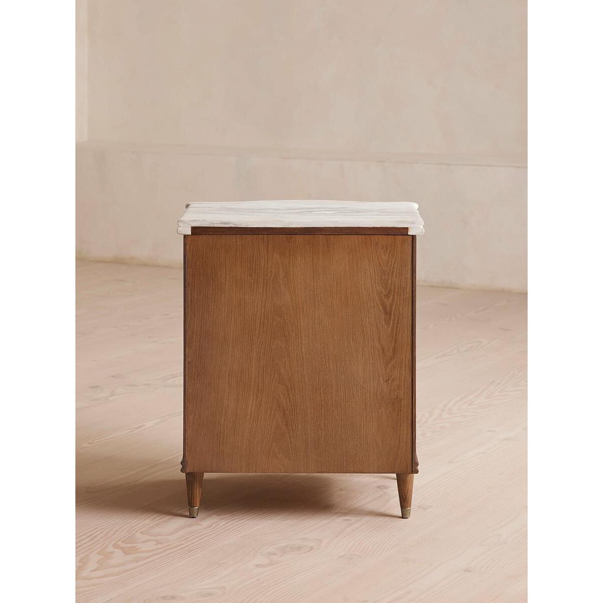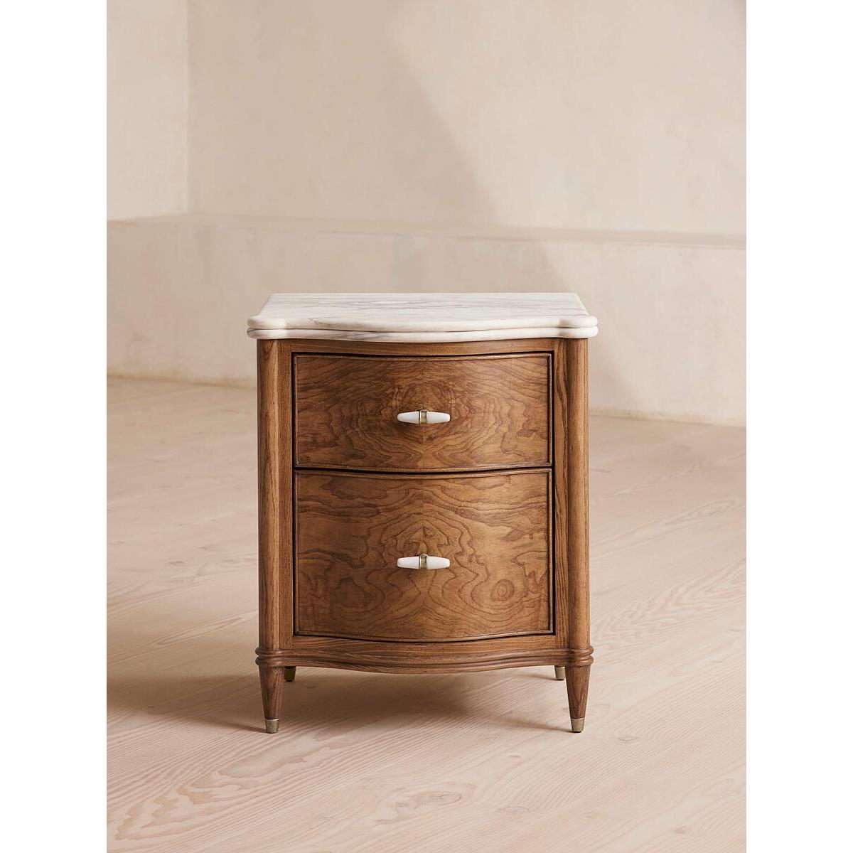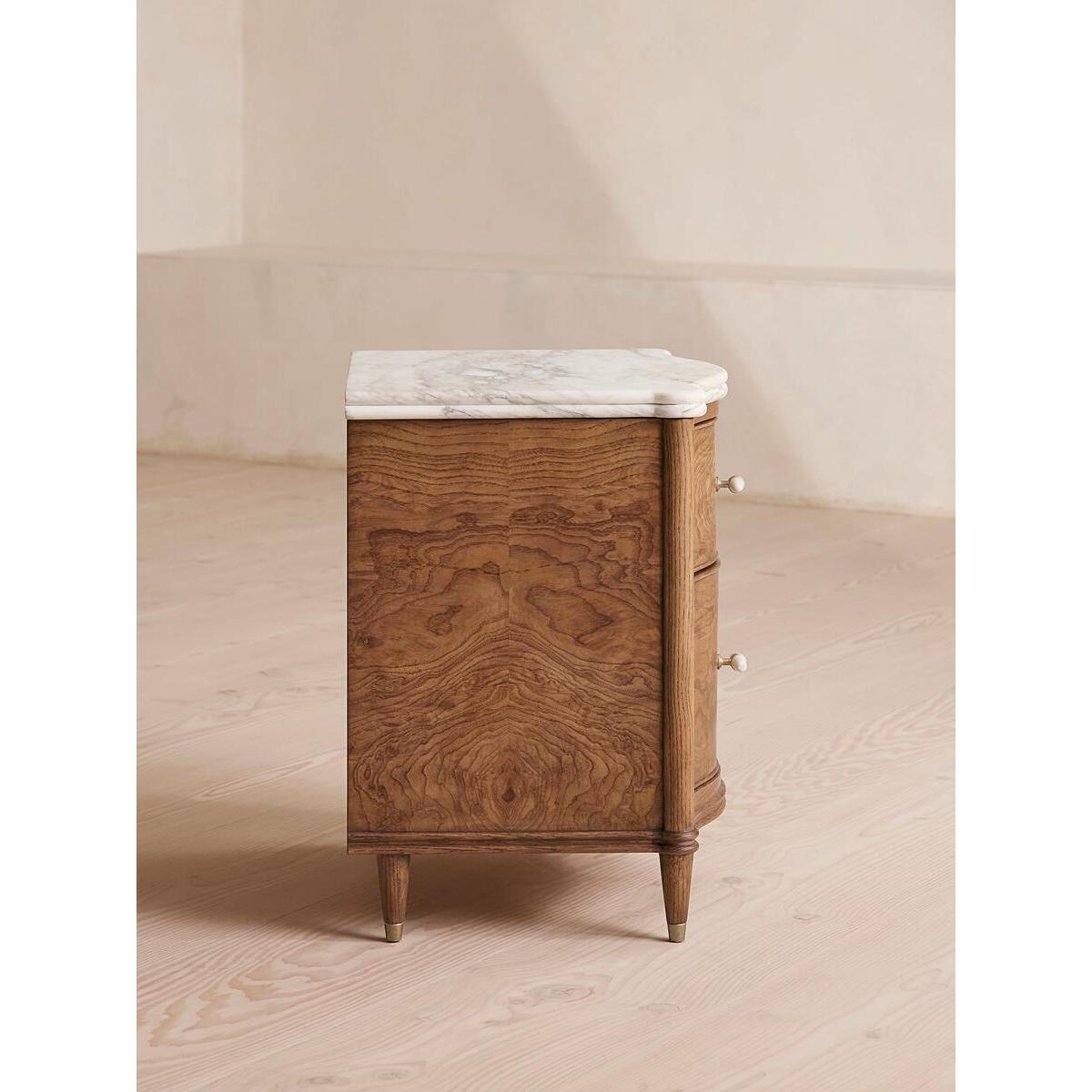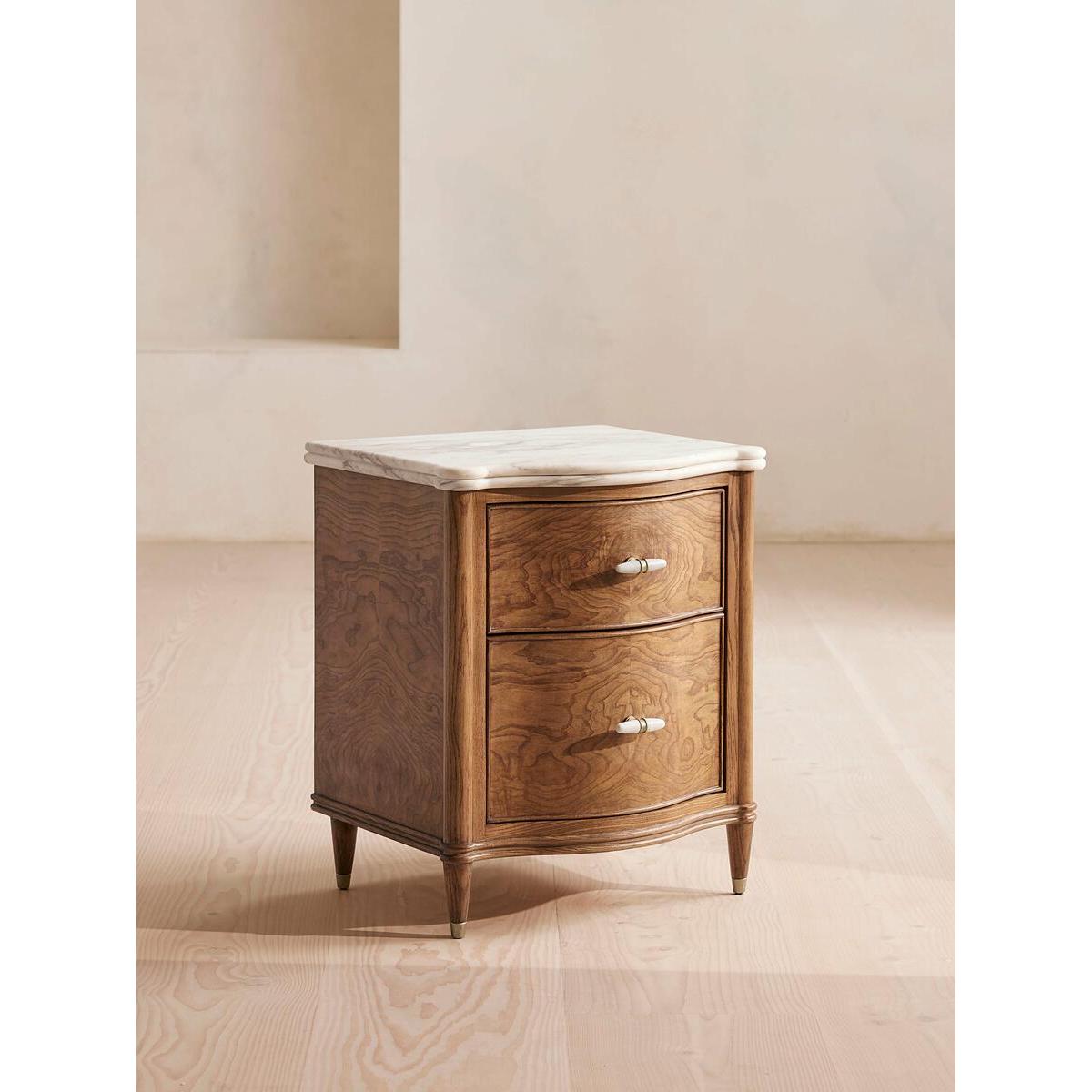 Mirroring the 1940s-inspired glamour of Soho House Paris, our Valerie bedside table is ideal for recreating the House's set-up in your own home. The classic front swoop silhouette has been created with a solid ash frame and an olive ash burl finish. Arabescato Corchia marble on the top elevates the wood exterior, complemented with Carrara marble handles. • Solid ash frame • Olive ash burl wood finish • Arabescato honed marble • Two drawers for storage • Honed Carrara marble and antique brass handles • Double bullnose marble edge detail • Classic front swoop silhouette • Inspired by Soho House Paris