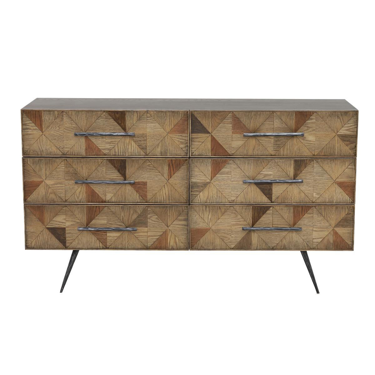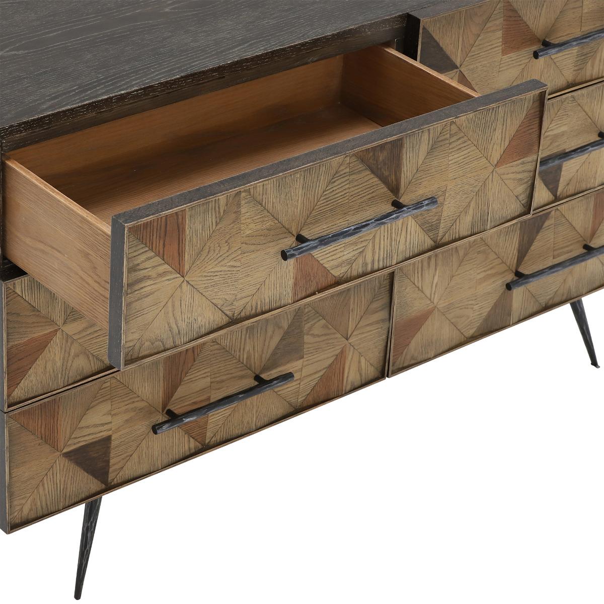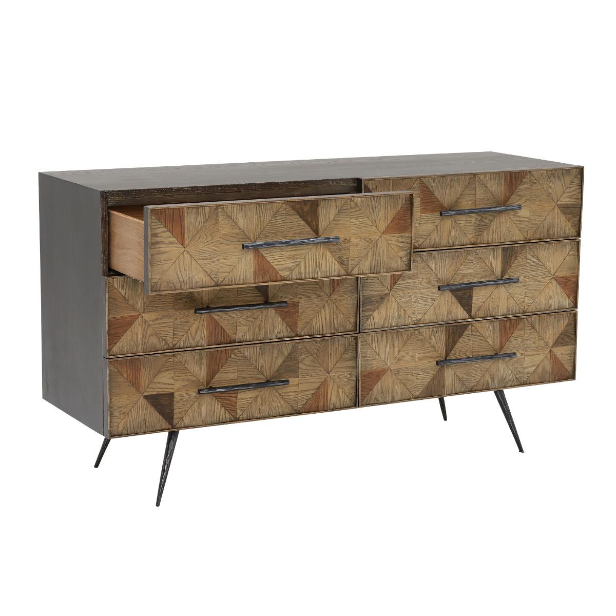 I really like this six-drawer chest for its warm, natural oak finish combined with the subtle geometric pattern on the drawers, which adds visual interest without overwhelming a space. It works particularly well in Scandi, mid-century, or modern interiors where the wood's natural texture can be showcased. Practical styling tips include pairing it with minimalist accessories like sleek lamps or simple decorative objects on top, and adding soft textiles nearby for contrast. Its versatile design also allows it to slot seamlessly into bedrooms, living rooms, or even hallways, making it a functional statement piece that balances style and practicality.