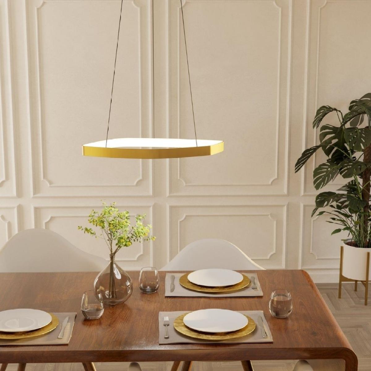 Vallerosa integrated LED pendant ceiling light, made from metal in brushed brass and featuring an organically shaped LED profile, a warm white light and a dimmable function (when used with a suitable rotating dimmer on the wall). A perfect fusion of modern innovation and elegant design, this ceiling light showcases an organically shaped LED profile that adds a touch of sophistication to any space. The sleek and contemporary design makes it a standout piece, enhancing both modern and transitional interiors. The Vallerosa ceiling light emits a warm white light, creating a cosy and inviting atmosphere in your home. Additionally, it features a dimmable function, allowing you to adjust the brightness to suit your mood or activity when used with a suitable rotating dimmer on the wall. This versatility makes it ideal for various settings, from relaxed evenings to lively gatherings. The brushed brass finish adds a touch of luxury, making it a stylish addition to living rooms, dining rooms or hallways. Vallerosa integrated LED pendant ceiling light, made from metal in brushed brass and featuring an organically shaped LED profile, a warm white light and a dimmable function (when used with a suitable rotating dimmer on the wall). A perfect fusion of modern innovation and elegant design, this ceiling light showcases an organically shaped LED profile that adds a touch of sophistication to any space. The sleek and contemporary design makes it a standout piece, enhancing both modern and transitional interiors. The Vallerosa ceiling light emits a warm white light, creating a cosy and inviting atmosphere in your home. Additionally, it features a dimmable function, allowing you to adjust the brightness to suit your mood or activity when used with a suitable rotating dimmer on the wall. This versatility makes it ideal for various settings, from relaxed evenings to lively gatherings. The brushed brass finish adds a touch of luxury, making it a stylish addition to living rooms, dining rooms or hallways.