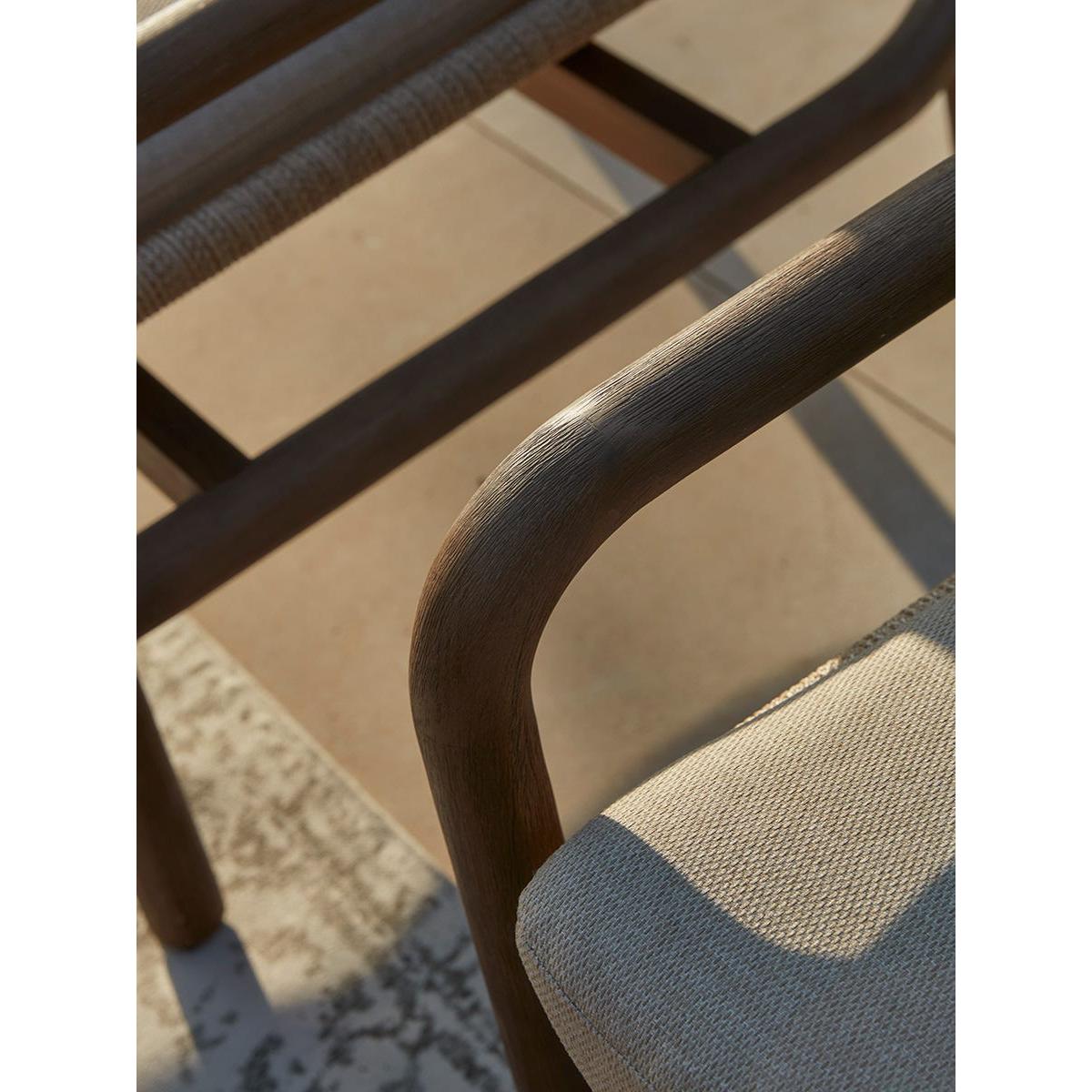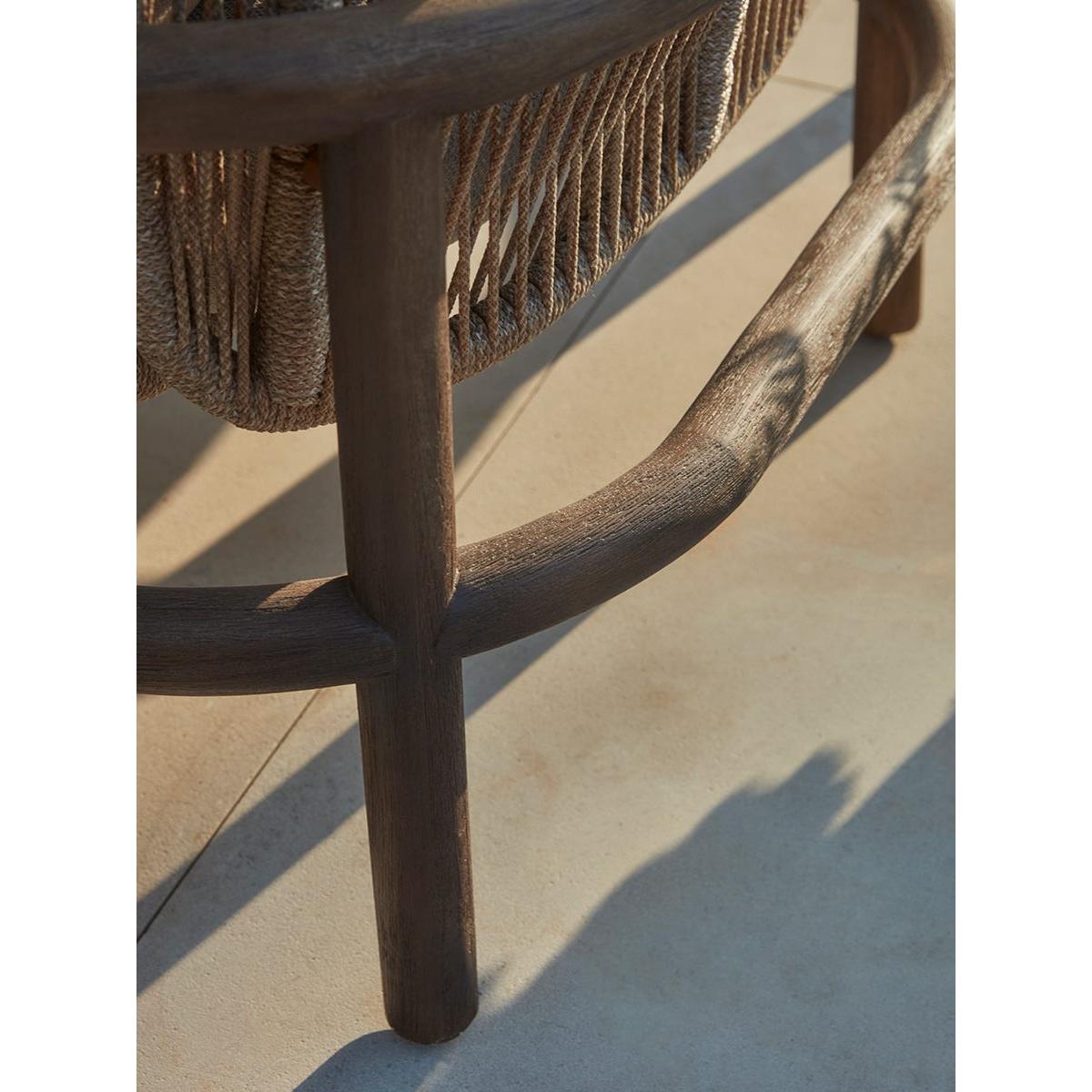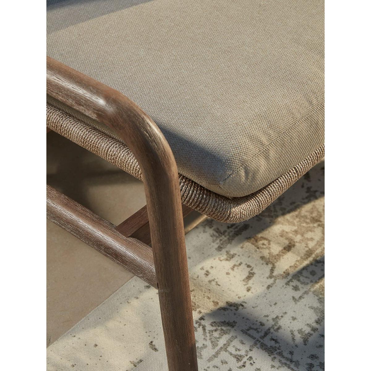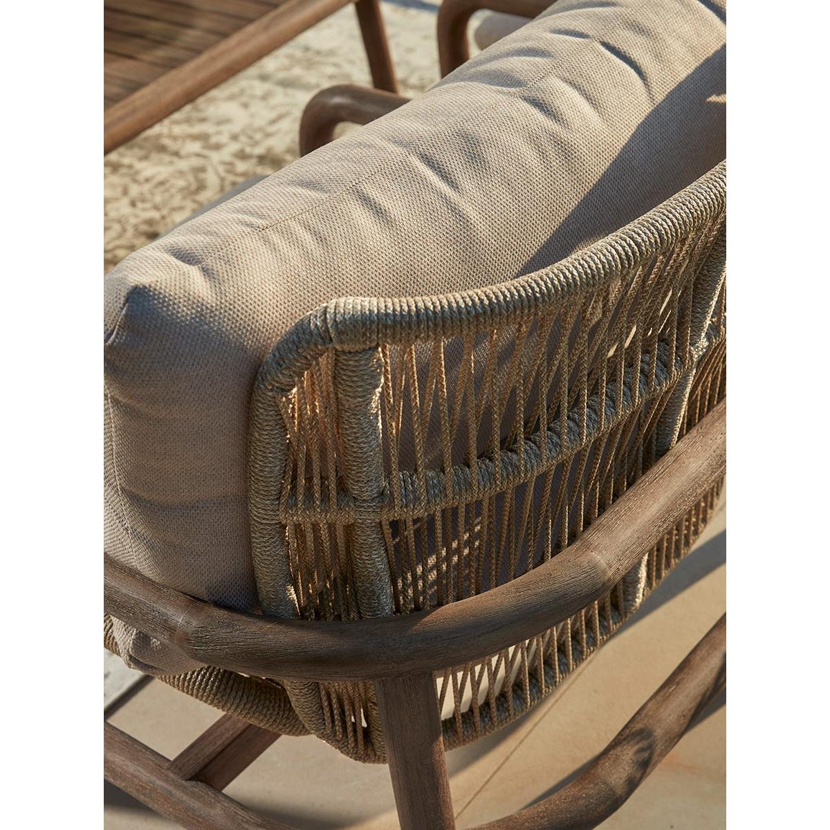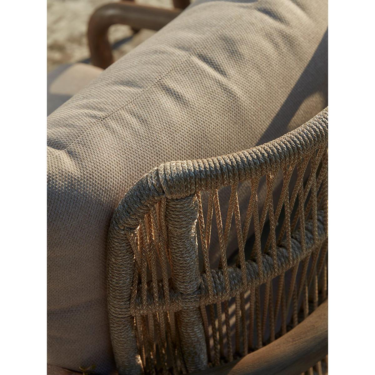 In warmer walnut tones, this lounge set brings a resort-style luxury vibe to our outdoor offering.  Bentwood style wooden frames and seats wrapped in hessian tones align with taupe cushion covers to provide a laid back and comfortable seating arrangement. The lounge set comprises an outdoor sofa, two low armed single seats and coffee table with a slatted top and rounded ends.