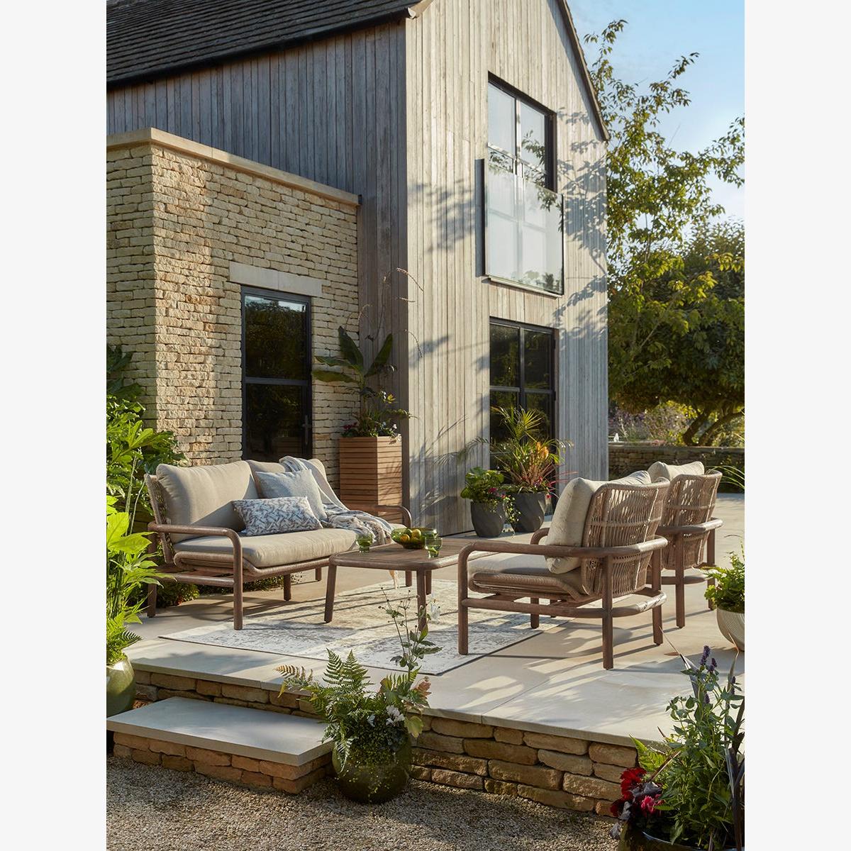 I’m a fan of the Valletta lounge for its smart combination of slim, powder-coated frames and woven rope detailing - it feels both contemporary and relaxed. The neutral cushions work well against timber decks or pale paving, making it equally suited to modern city terraces or more rustic garden patios. For styling, layer in textured cushions in muted blues or greens, add a weatherproof rug to define the seating area and position low side tables for drinks. A mix of potted palms and sculptural planters will soften the look, while throws in natural fibres keep things cosy as the evenings cool.