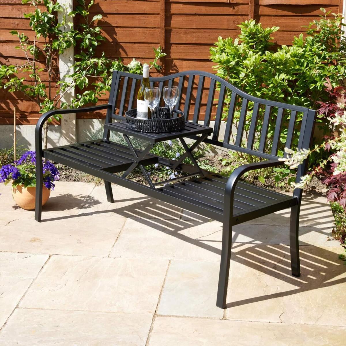 Our Valletta classic designed bench is made from real metal with a hardwearing black powder coated finish. The gently sloping back and arms provide comfort and the built in, easy to use centre table is ideal for drinks and snacks so you can make the most of a sunny afternoon.