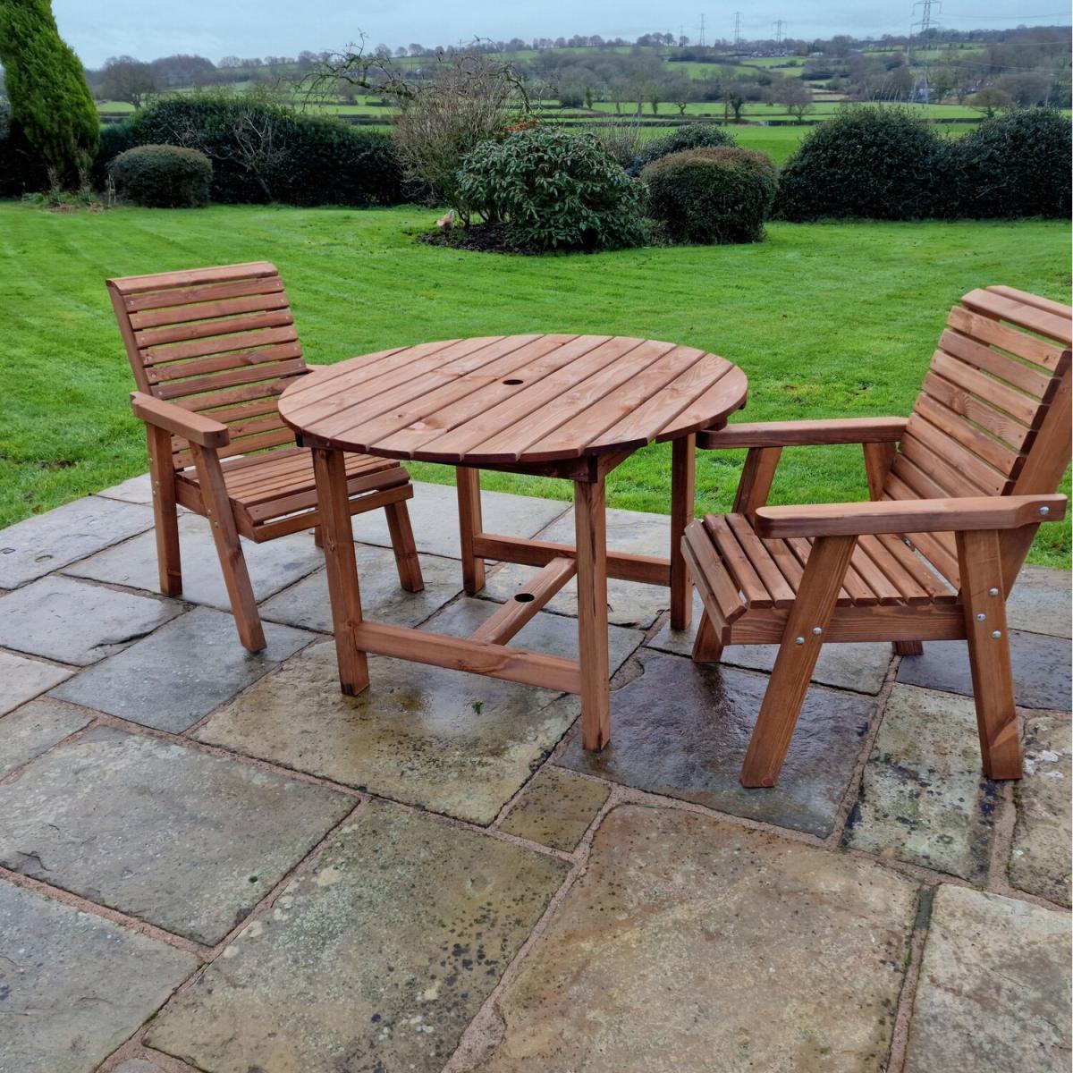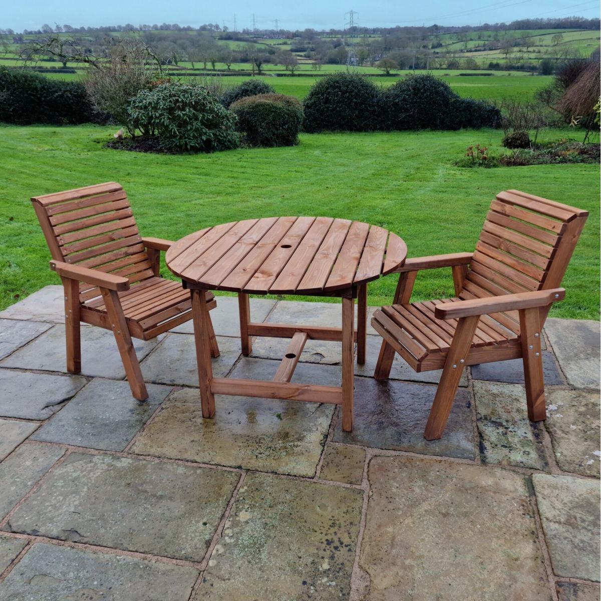 I’m a fan of this little round wood two-seater for its straightforward design and natural finish - it slips easily into both contemporary patios and more traditional garden spaces. The warm timber tones work especially well against slate or cream paving, and the compact shape means it won’t overwhelm a small courtyard or balcony. For styling, layer on weather-resistant seat pads in muted stripes or plain linen, then add a low-profile plant stand beside it with herbs or succulents. A simple parasol in a neutral canvas can lift the look and bring extra shade without hiding the table’s clean lines.