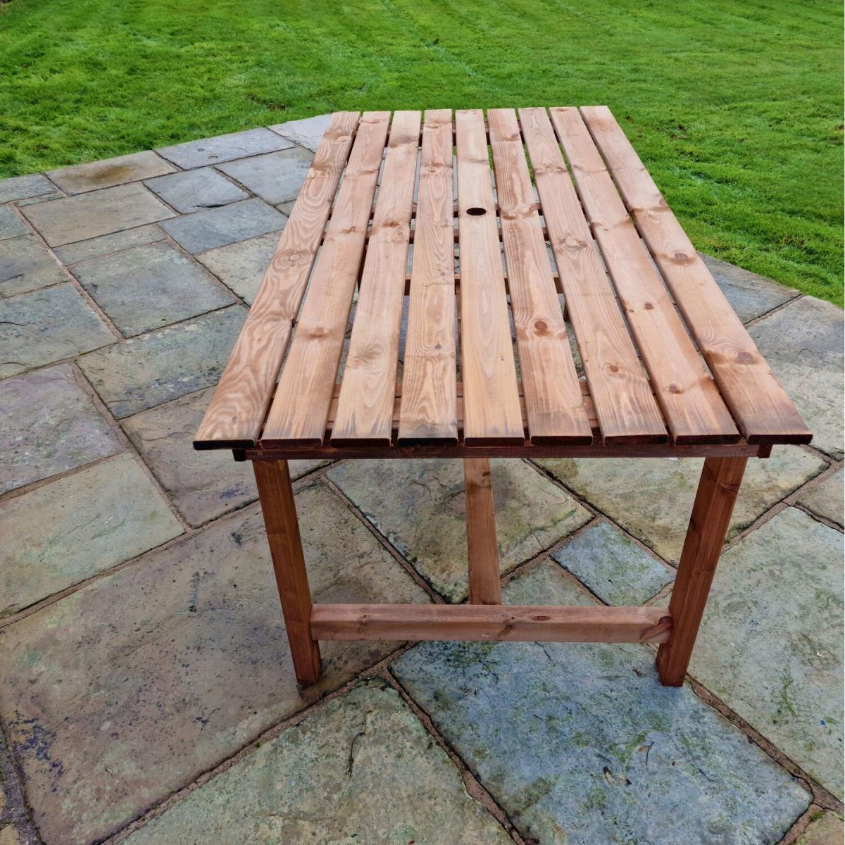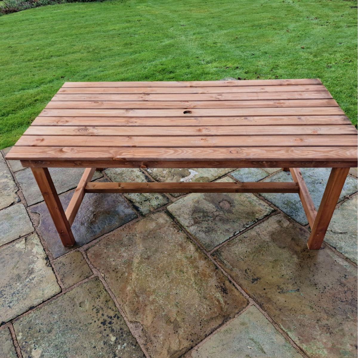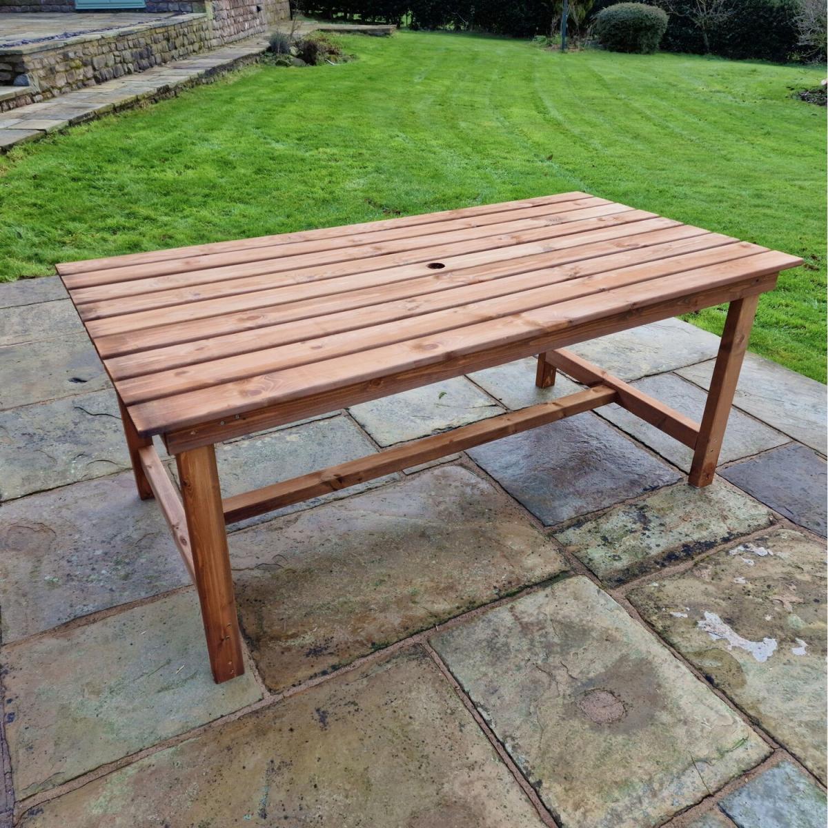 I’m really taken with this wooden garden table for its straightforward, sturdy design and warm tone - it slots easily into both contemporary and more traditional outdoor settings. The slatted top and central parasol hole make it practical for al fresco dining, while its neutral colour pairs well with painted chairs or woven seating. Styling tip: dress it out with a simple linen runner and a mix of terracotta pots or glass lanterns down the middle. Add scatter cushions in muted greens or blues to tie in surrounding planting, and treat the wood annually with a clear oil to keep it looking fresh.