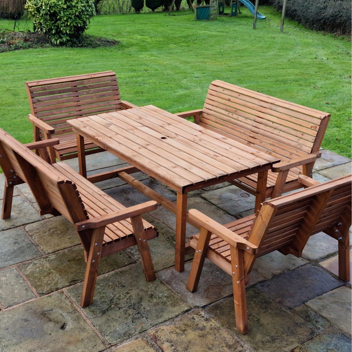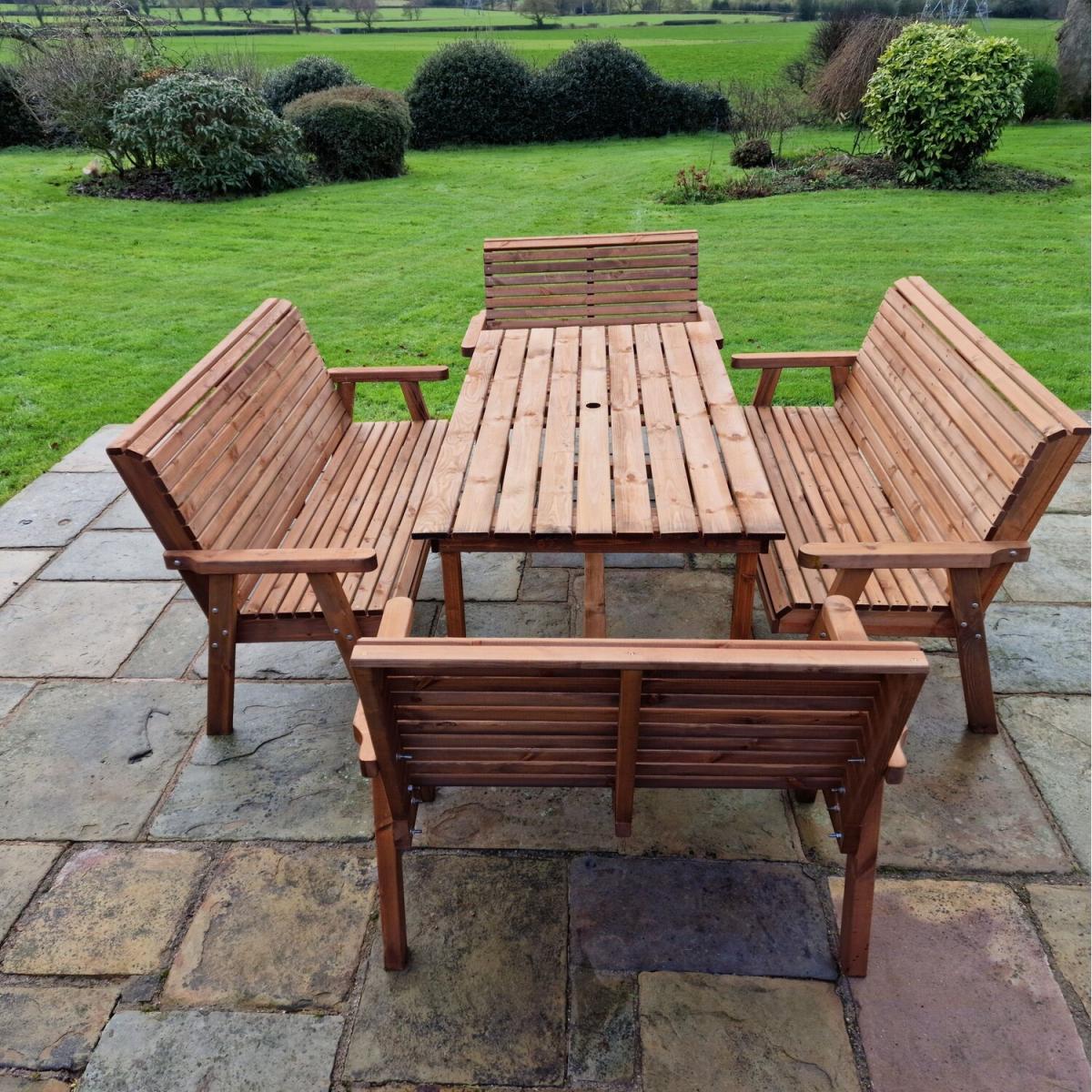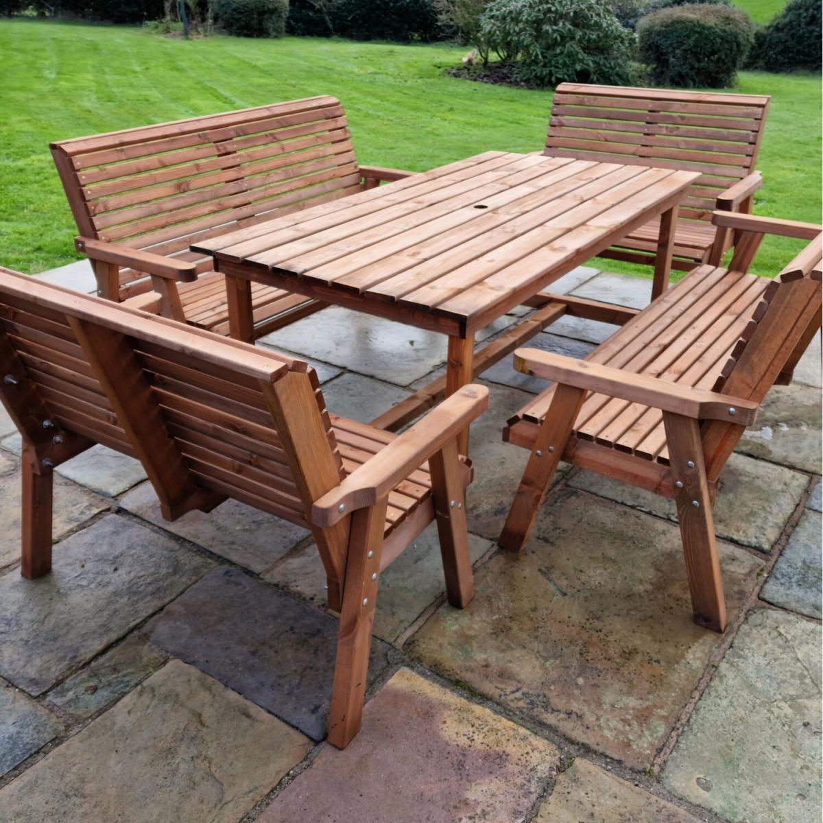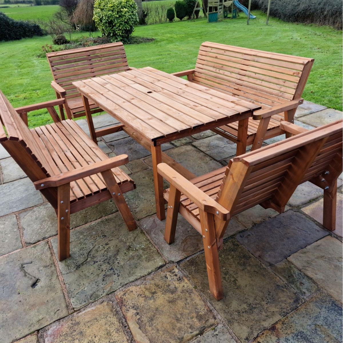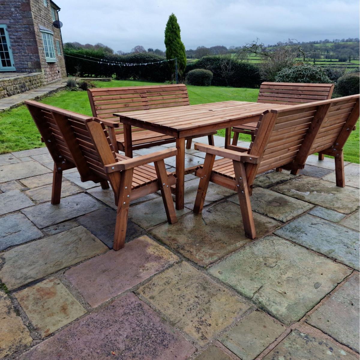 I love this set because it offers a practical yet classic design that works well both in traditional and contemporary outdoor spaces. The all-wood construction adds warmth and natural charm, making it an ideal choice for garden dining areas or patio spaces. It's versatile enough to complement anything from rustic rural settings to modern minimalist gardens. Style-wise, work it into a laid-back, family-friendly setting by pairing it with colourful cushions or outdoor tableware, and consider adding some potted plants or lanterns for extra character during evening gatherings. Its sturdy build makes it a reliable choice for everyday use, and its natural wood finish promises to age gracefully over time with a little maintenance.