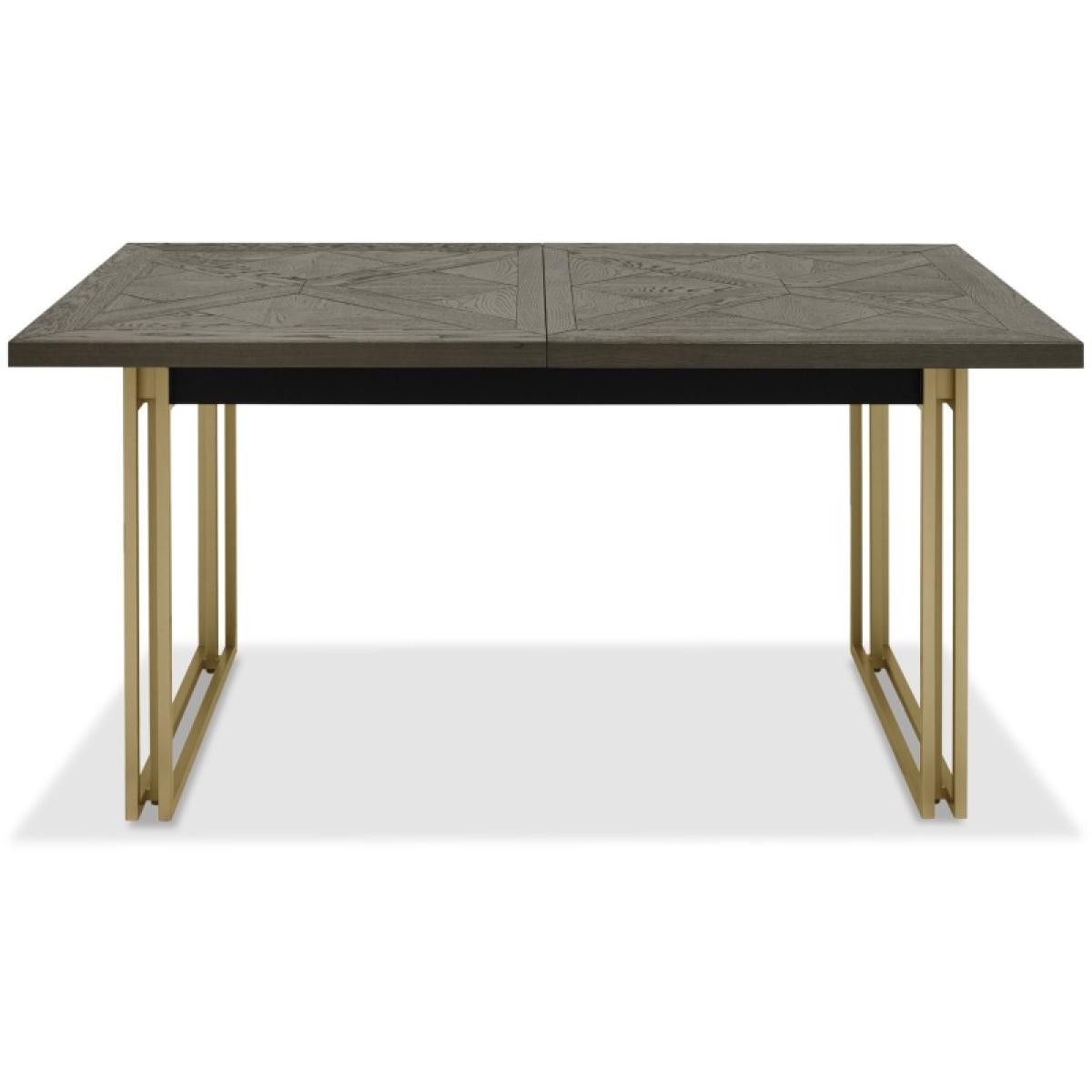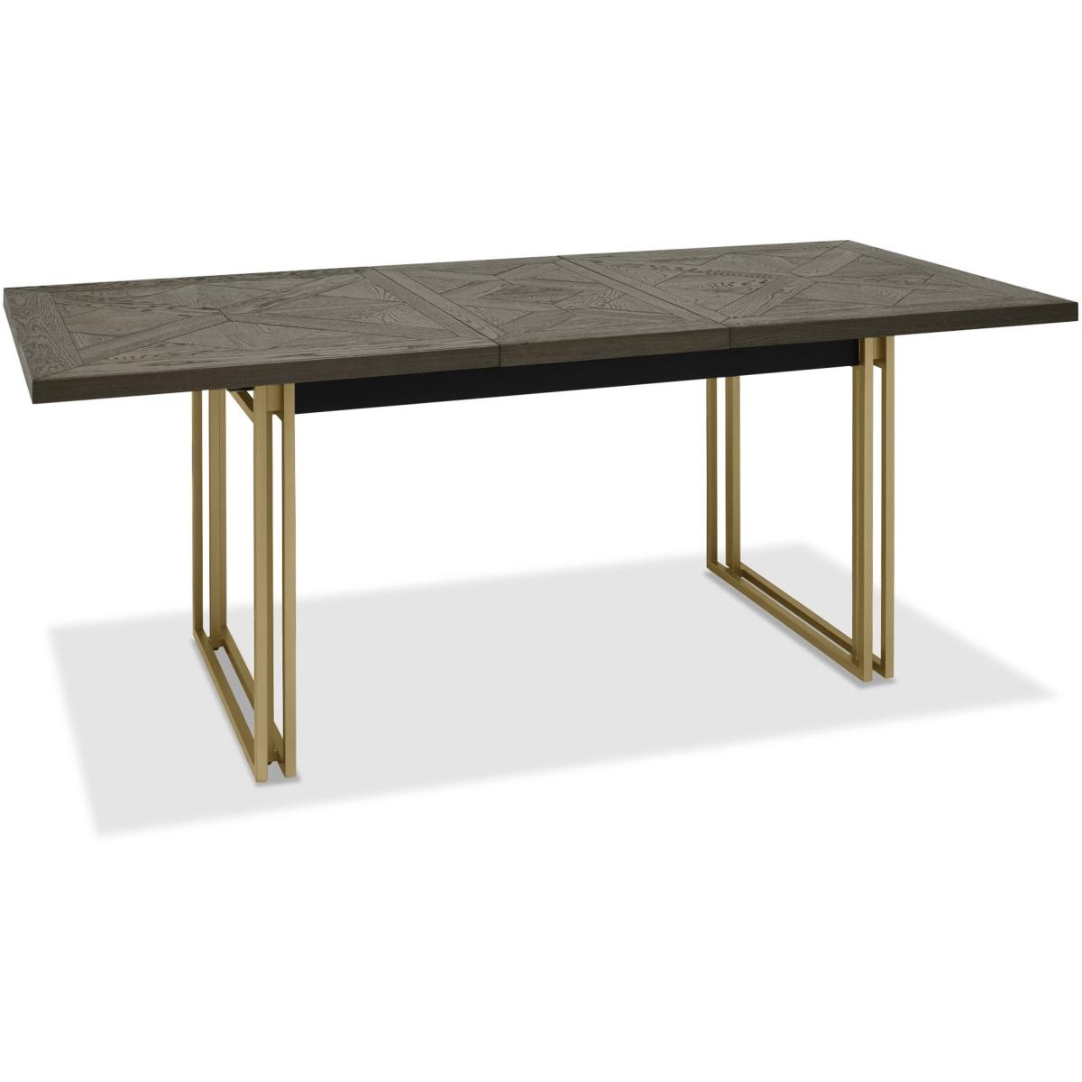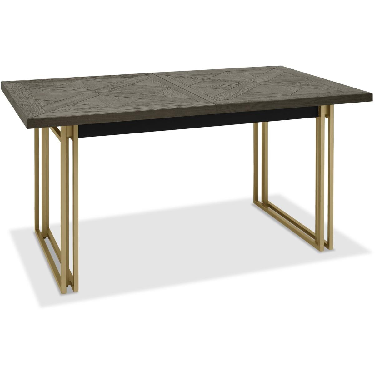 This dining table, crafted in Vietnam, features a sophisticated fumed oak and peppercorn finish with elegant satin brass accents. It includes one extension leaf, allowing the table to extend from 158cm to 203cm in width. Assembly required - assembly requires two people and takes approximately 30 minutes. The table measures 90cm in depth and stands 77cm tall. The product is backed by a 2-year manufacturer's guarantee, ensuring its quality and durability. Features: Wood Finish: Fumed Oak & Peppercorn Metal Finish: Satin Brass 2 Year Manufacturer's Guarantee  Seating Capacity: 4 to 6 Seater Dimensions: Width: 158-203cm Depth: 90cm Height: 77cm All screens vary in colour reproduction and whilst every effort has been made to display the colour as accurately as possible it is for guidance only.