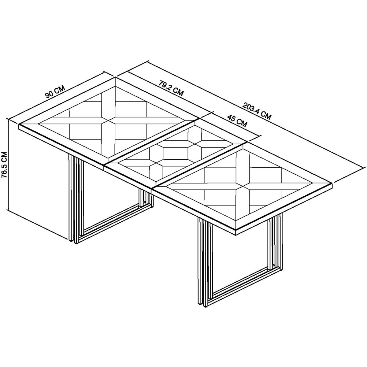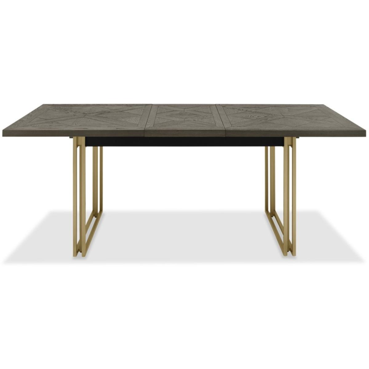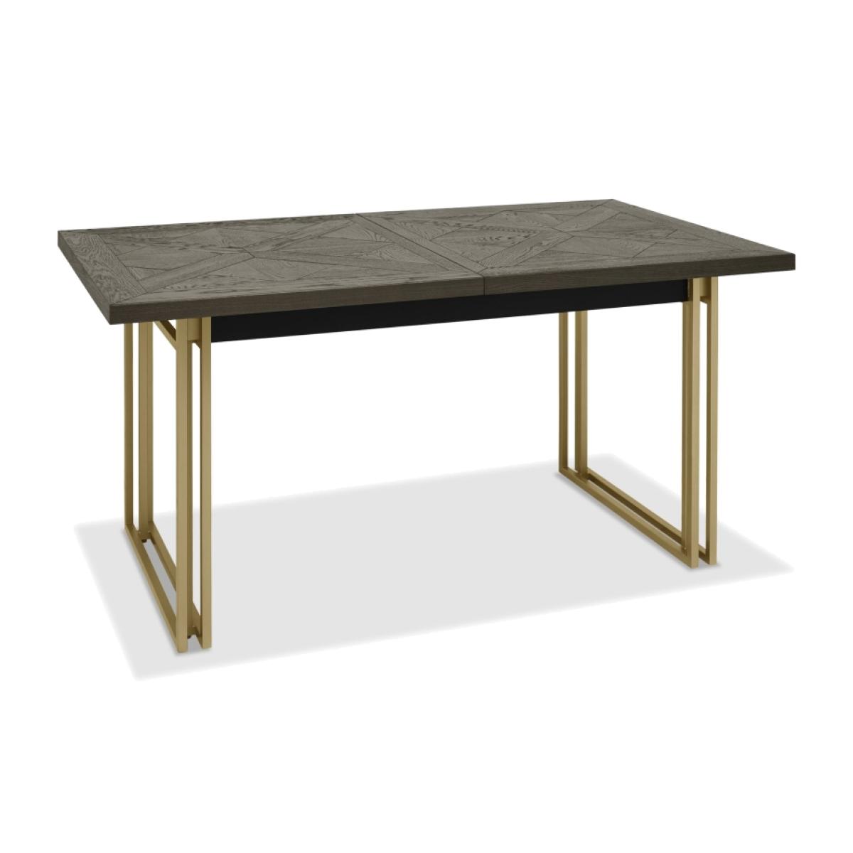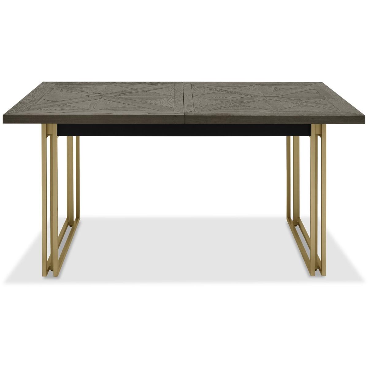 This dining table, crafted in Vietnam, features a sophisticated fumed oak and peppercorn finish with elegant satin brass accents. It includes one extension leaf, allowing the table to extend from 158cm to 203cm in width. Assembly required - assembly requires two people and takes approximately 30 minutes. The table measures 90cm in depth and stands 77cm tall. The product is backed by a 2-year manufacturer's guarantee, ensuring its quality and durability. Features: Wood Finish: Fumed Oak & Peppercorn Metal Finish: Satin Brass 2 Year Manufacturer's Guarantee  Seating Capacity: 4 to 6 Seater Dimensions: Width: 158-203cm Depth: 90cm Height: 77cm All screens vary in colour reproduction and whilst every effort has been made to display the colour as accurately as possible it is for guidance only.