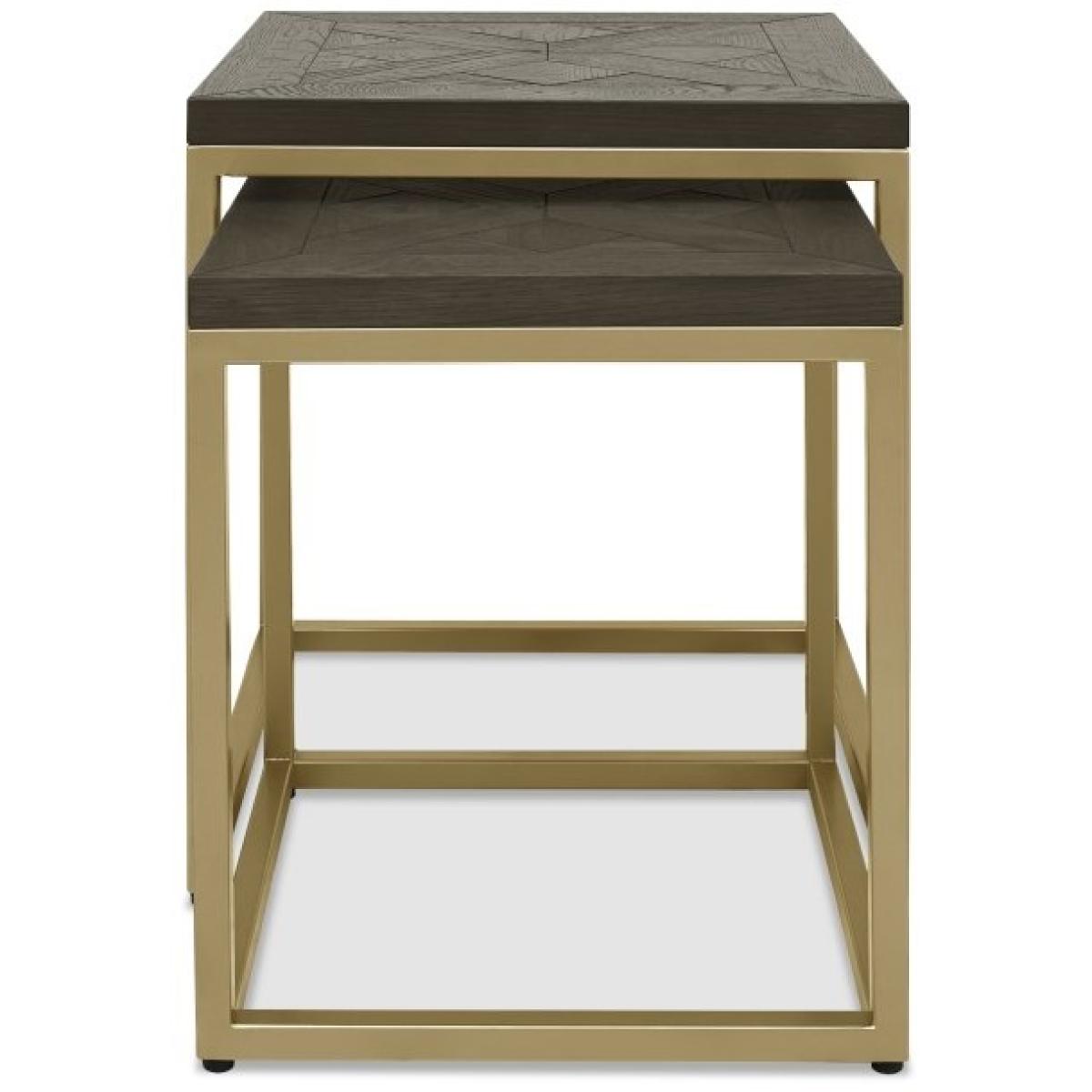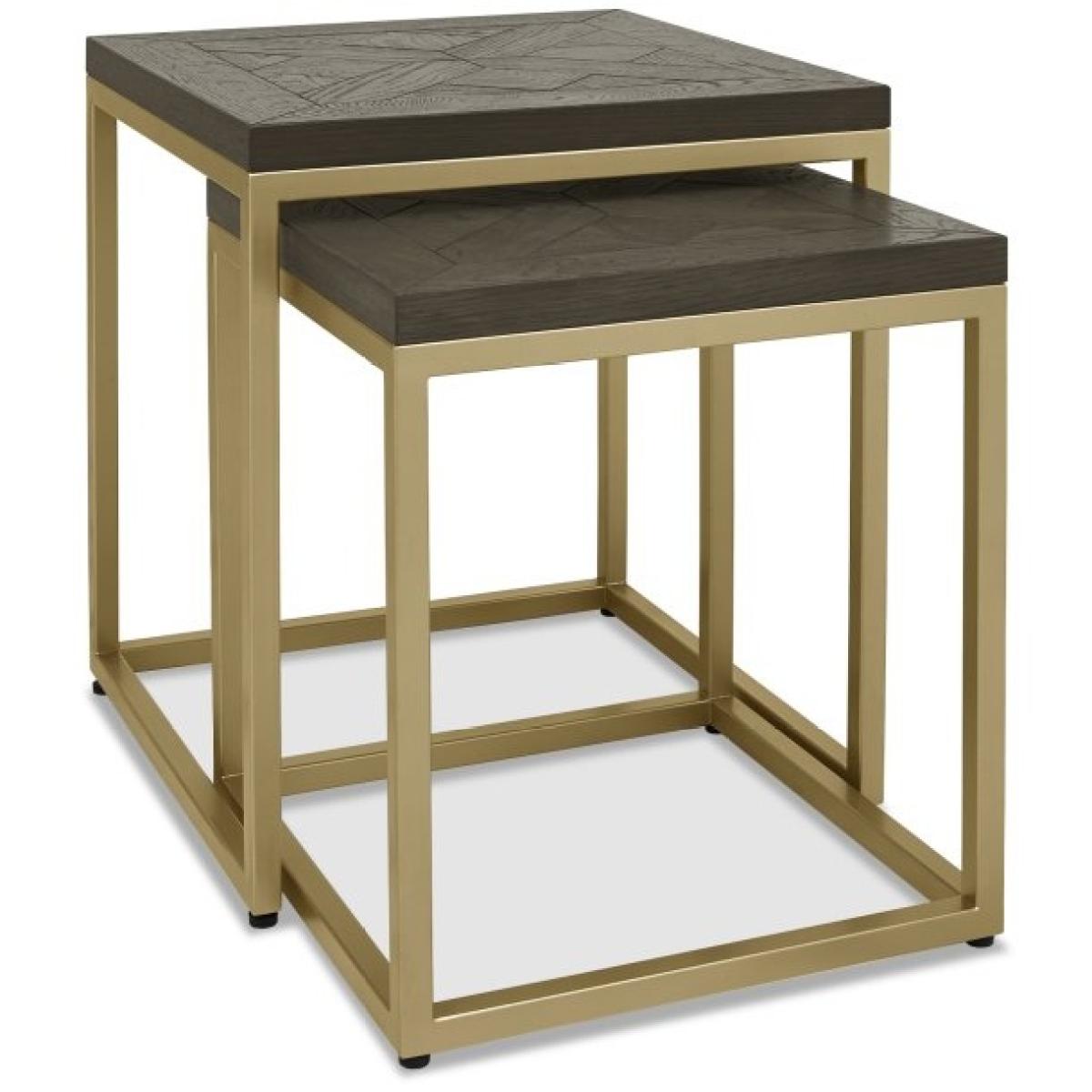 These Vancouver Fumed Oak Nest Of Lamp Tables crafted in Vietnam, feature a refined fumed oak finish with elegant satin brass accents. The set arrives fully assembled and includes two tables with dimensions of 45 x 45cm and 39 x 39cm, standing 50cm and 43cm tall respectively. The product is backed by a 2-year manufacturer's guarantee, ensuring its quality and durability. Features: Wood Finish: Fumed Oak & Peppercorn Metal Finish: Satin Brass Fully Assembled Set of 2 Lamp Tables Matching Furniture Available 2 Year Manufacturer's Guarantee  Dimensions: Table 1: H 50cm x W 45cm x D 45cm Table 2: H 43cm x W 39cm x D 39cm All screens vary in colour reproduction and whilst every effort has been made to display the colour as accurately as possible it is for guidance only.