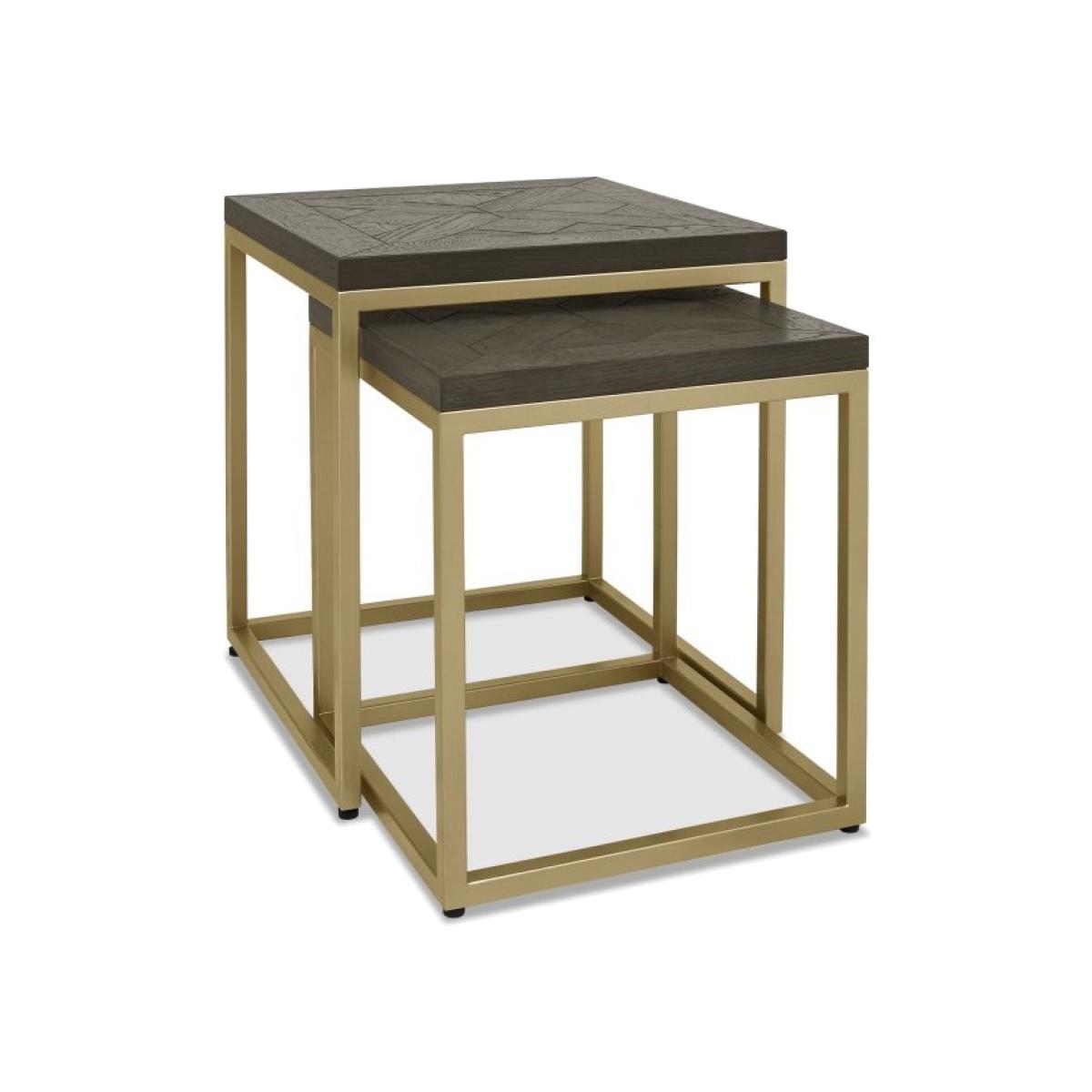 I often reach for the Vancouver nest tables when I need flexible side surfaces with a twist of warmth. The fumed oak tops sit nicely against the slim brass frames, so they slip into both contemporary and mid-century-inspired schemes without feeling fussy. Try positioning the smaller table tucked under the larger by your sofa, then pull it out when you need extra room for drinks or a lamp. Keep styling simple - a low stack of books, a small plant in a ceramic pot and a sculptural candleholder will all sit comfortably on those square tops.