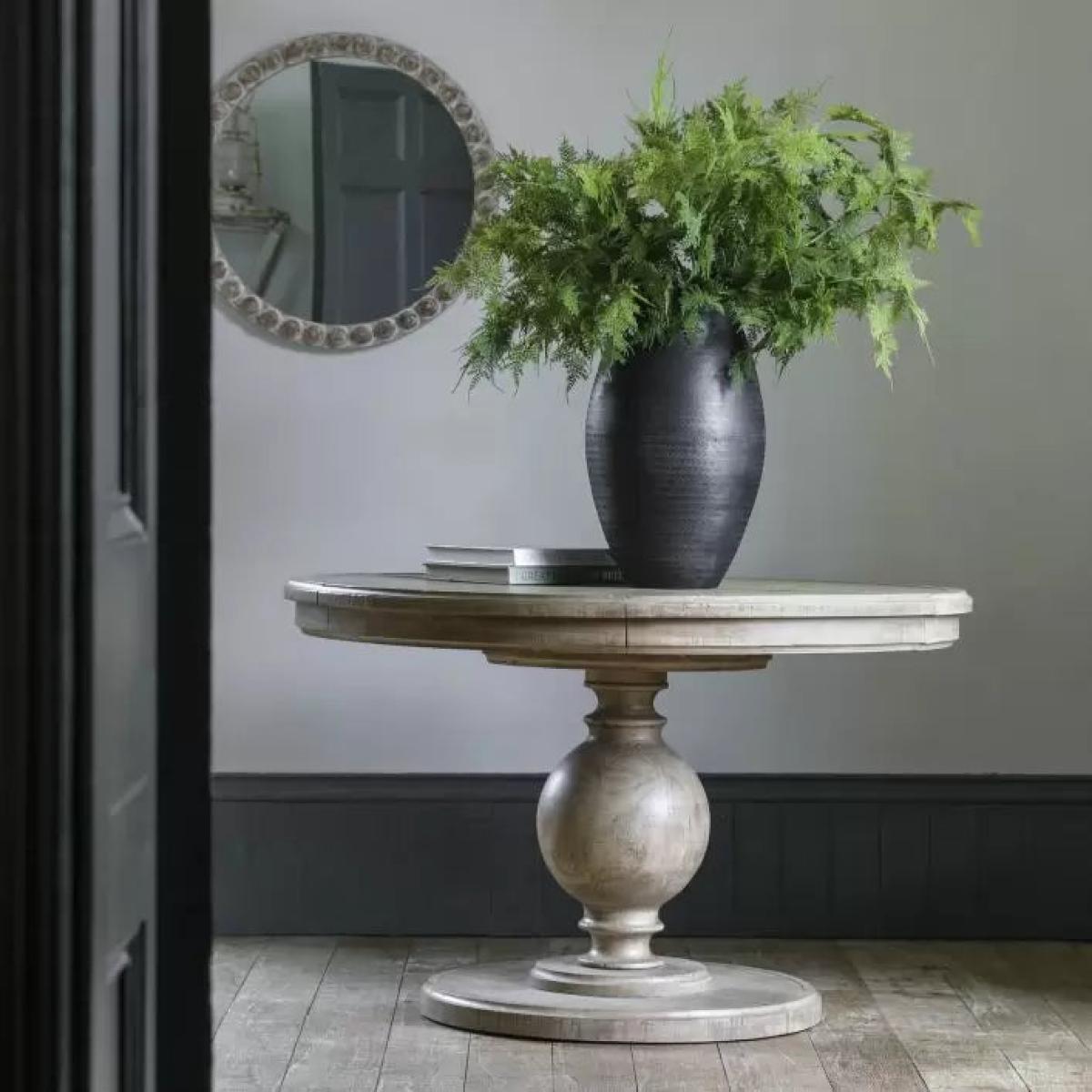 This lovely round dining table is extendable to seat extra guests for added practicality. It is crafted from North American pine solids and veneers where practical, with the clever use of a mill saw giving characteristic features of cross sawn timber to create a tactile, dramatic finish. Matching pieces are available.