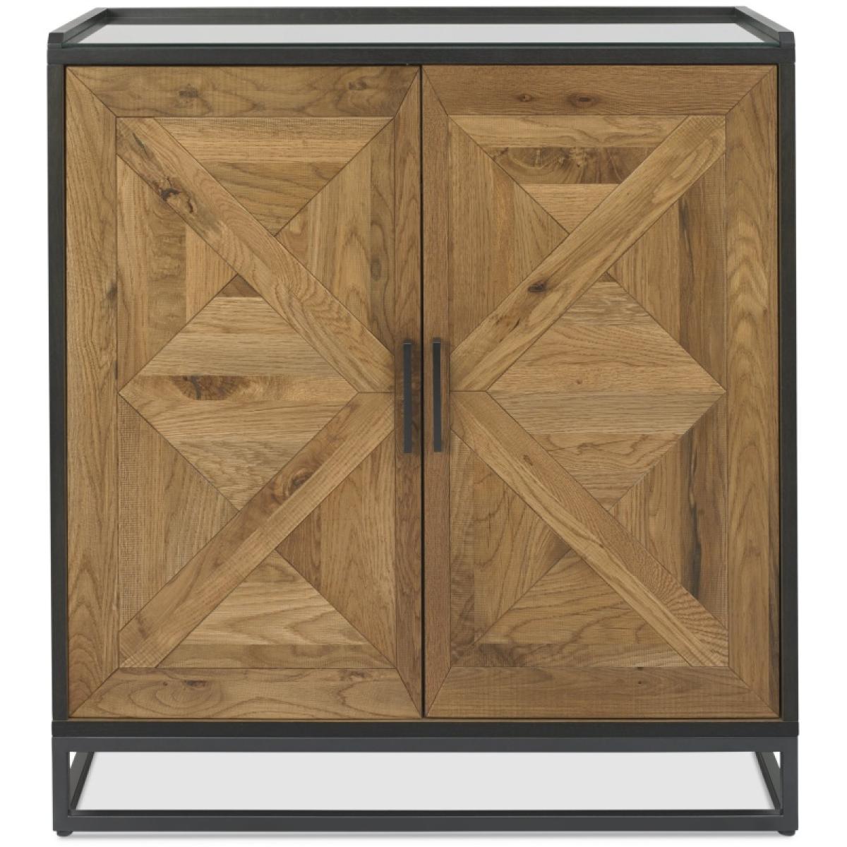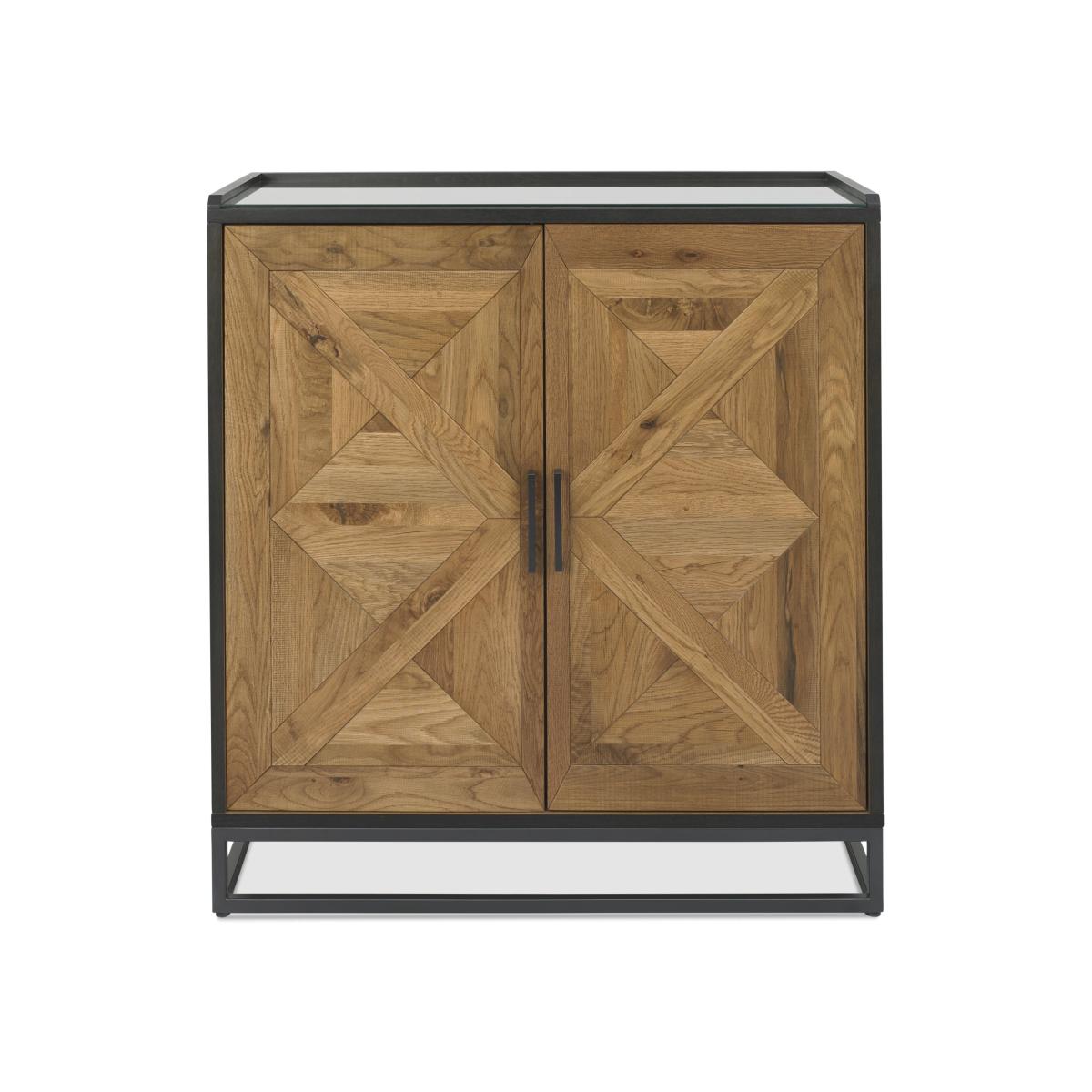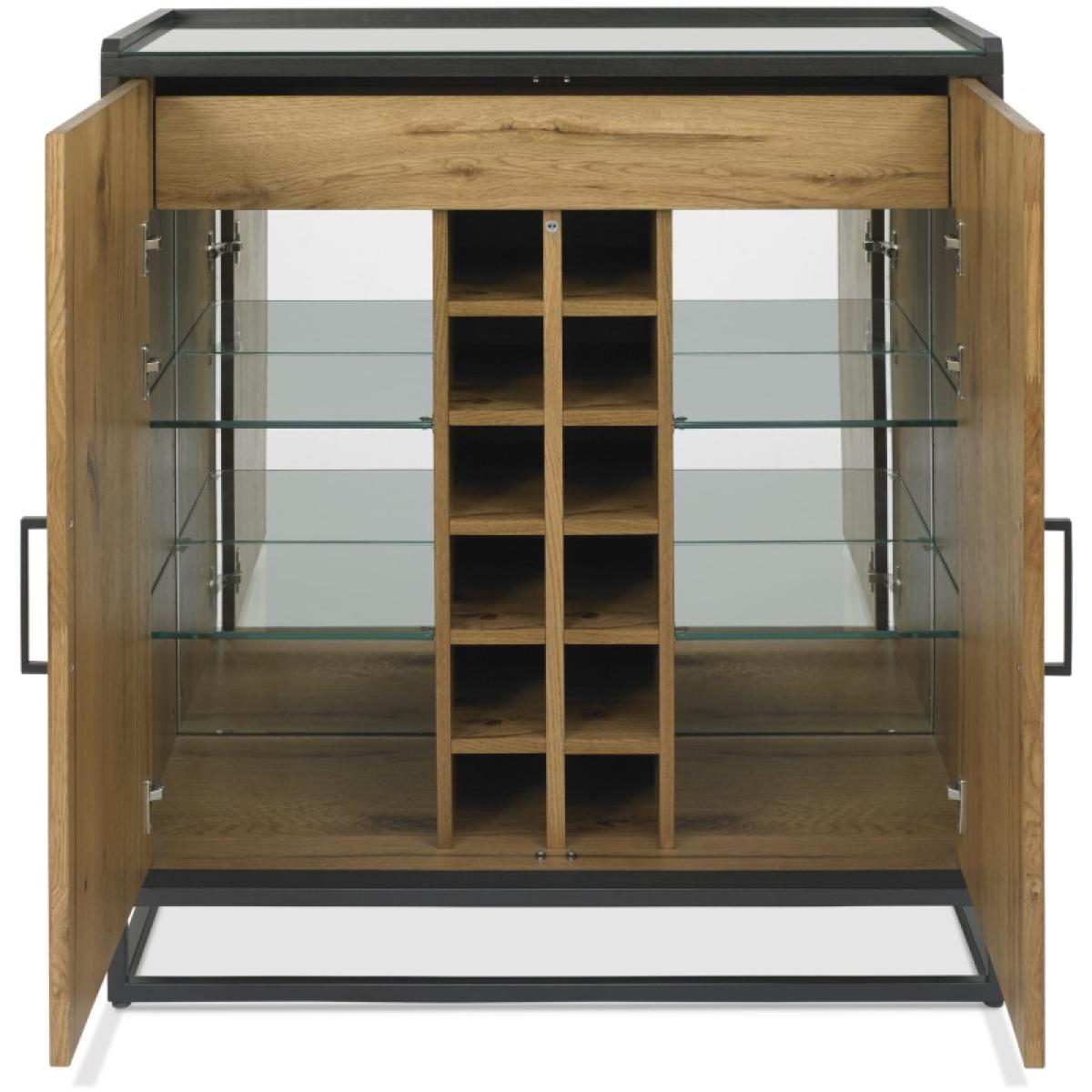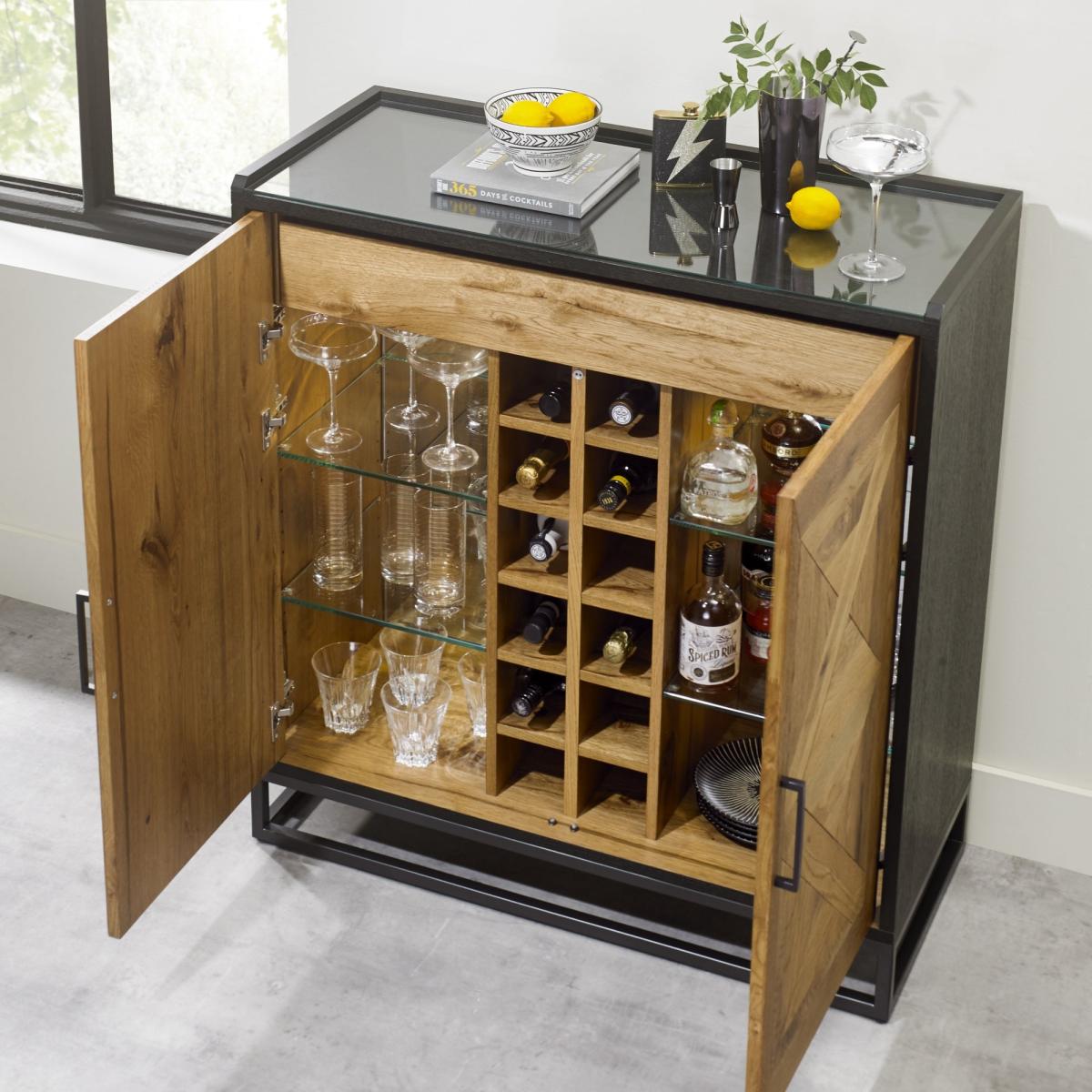 This Vancouver Rustic Oak Drinks Cabinet, manufactured in Vietnam, features a rustic oak and peppercorn finish. It includes one soft-close drawer and four shelves, providing ample storage and display space. The Vancouver range features is a striking design combining saw cut oak marquetry tops with a 'peppercorn' finished wire brushed oak veneered frame and a welded black powder coated metal base, giving it an on trend industrial edge. Each of the hand-crafted pattern tops are wire brushed and distressed to give a rustic look and tactile feel, making the most of the beautiful and varied grain of oak. Assembly required - assembly requires two people and takes approximately 20 minutes. It measures 93cm in width, 40cm in depth, and stands 100cm tall. The product is backed by a 2-year manufacturer's guarantee, ensuring its quality and durability. Features: Rustic Oak Tops & Black Gun Metal Frames Matching Furniture Available 2 Year Manufactuer's Guarantee Dimensions: Width: 93cm Depth: 40cm Height: 100cm All screens vary in colour reproduction and whilst every effort has been made to display the colour as accurately as possible it is for guidance only.