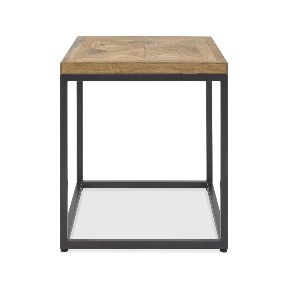 Vancouver is a striking design combining saw cut oak marquetry tops with a 'peppercorn' finished wire brushed oak veneered frame and a welded black powder coated metal base, giving it an on trend industrial edge. Each of the hand-crafted pattern tops are wire brushed and distressed to give a rustic look and tactile feel, making the most of the beautiful and varied grain of oak. Choose from generously proportioned oak upholstered chairs in four velvet options or a mottled grey fabric or cantilever chairs that feature this same fabric in a bold square pattern stitch detail with a handle in the back and superior glides on the base for ease of manoeuvre. BLUM soft closing hidden drawers within the sideboard cabinets add that extra refinement to the range in what will create a stunning focal point in any dining room. Rustic Oak Finish and Gun Metal Frame Dimensions - 45cm (W) x 45cm (D) x 50cm (H) Wood - Thin Saw Rustic Oak Veneer Metal Base - Powder Coated Fully Assembled Country of Origin - Veitnam