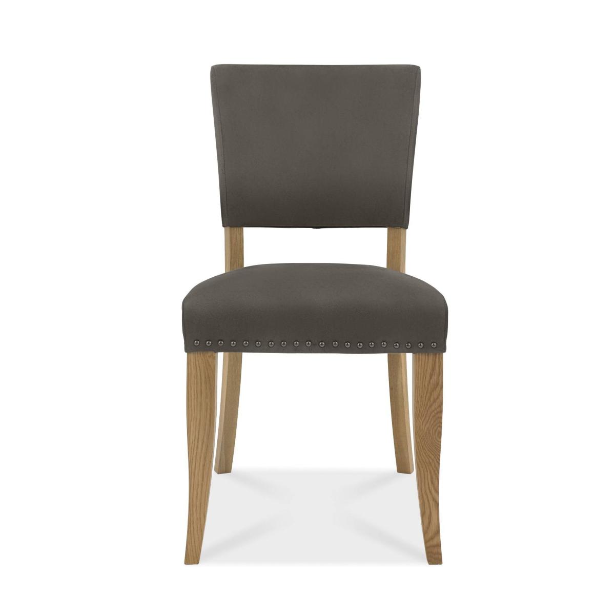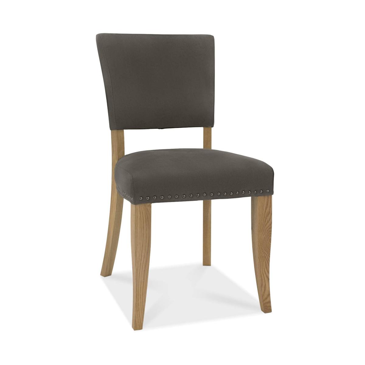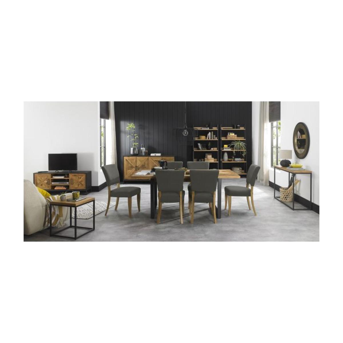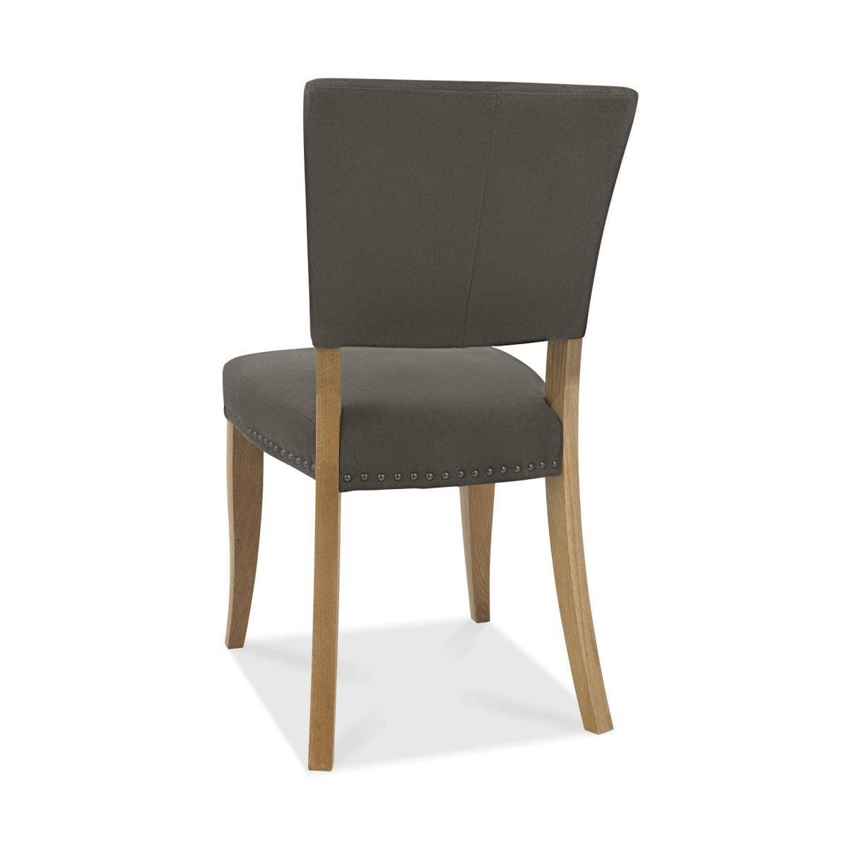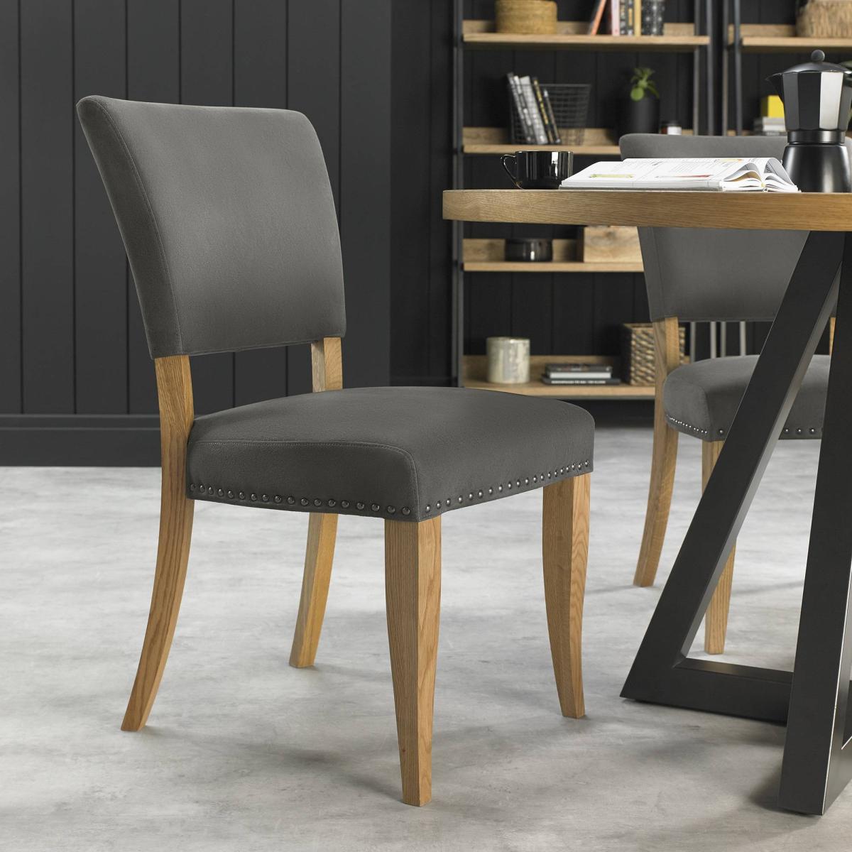 Vancouver is a striking design combining saw cut oak marquetry tops with a 'peppercorn' finished wire brushed oak veneered frame and a welded black powder coated metal base, giving it an on trend industrial edge. Each of the hand-crafted pattern tops are wire brushed and distressed to give a rustic look and tactile feel, making the most of the beautiful and varied grain of oak. Choose from generously proportioned oak upholstered chairs in four velvet options or a mottled grey fabric or cantilever chairs that feature this same fabric in a bold square pattern stitch detail with a handle in the back and superior glides on the base for ease of manoeuvre. BLUM soft closing hidden drawers within the sideboard cabinets add that extra refinement to the range in what will create a stunning focal point in any dining room. Dark Grey and Rustic Oak Finish Supplied in Pairs Dimensions - 65cm (D) x 48cm (W) x 91cm (H) Fabric - 100% Polyester Wood - White Solid Oak Fully Assembeld Country of Origin - Veitnam