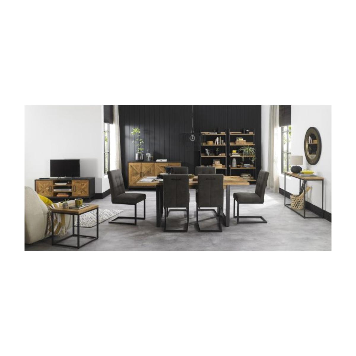 Vancouver is a striking design combining saw cut oak marquetry tops with a 'peppercorn' finished wire brushed oak veneered frame and a welded black powder coated metal base, giving it an on trend industrial edge. Each of the hand-crafted pattern tops are wire brushed and distressed to give a rustic look and tactile feel, making the most of the beautiful and varied grain of oak. Choose from generously proportioned oak upholstered chairs in four velvet options or a mottled grey fabric or cantilever chairs that feature this same fabric in a bold square pattern stitch detail with a handle in the back and superior glides on the base for ease of manoeuvre. BLUM soft closing hidden drawers within the sideboard cabinets add that extra refinement to the range in what will create a stunning focal point in any dining room. Dark Grey Fabric and Gun Metal Frame Supplied in Pairs Dimensions - 58cm (D) x 46cm (W) x 93cm (H) Fabric - 100% Polyester Fully Assembeld Country of Origin - Veitnam
