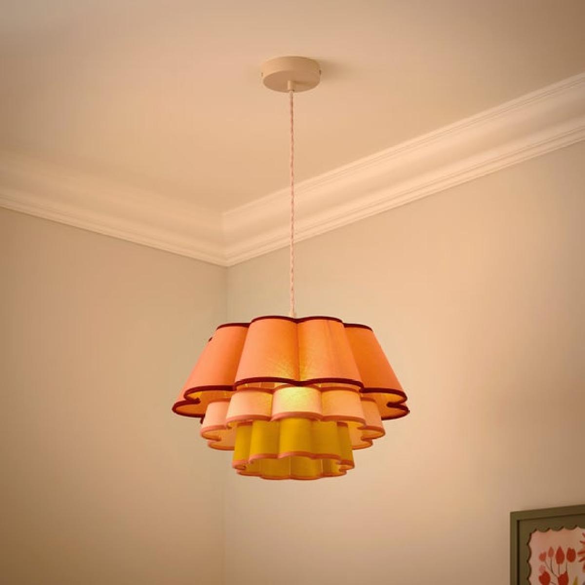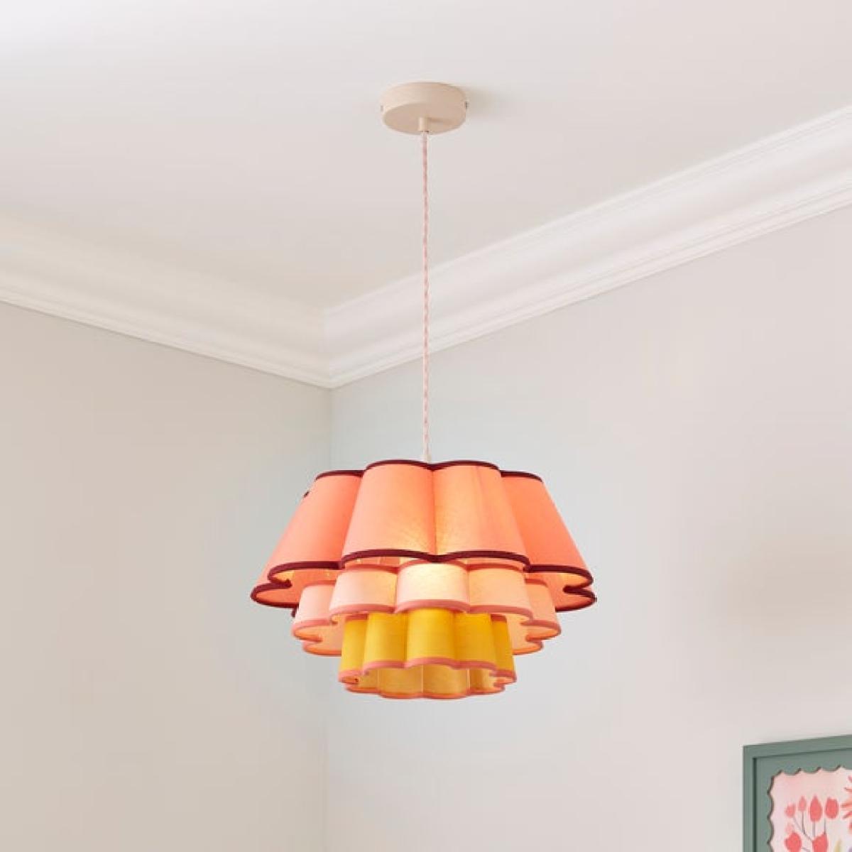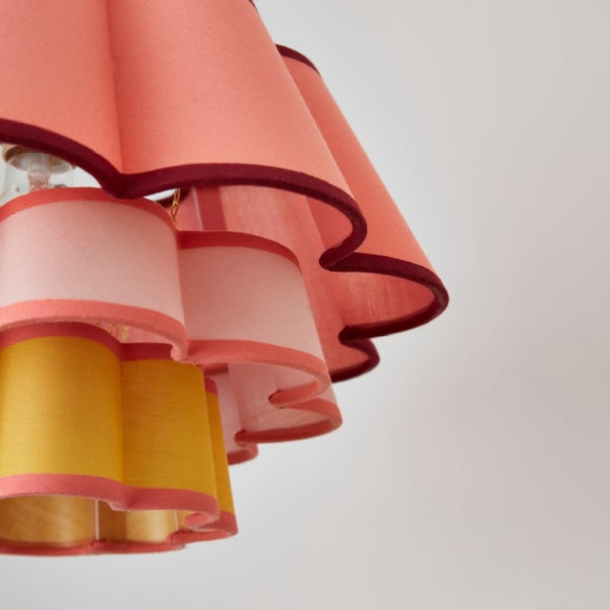 * Unique, Tiered Design * Beautiful Pink Tones * Made from Fabric & Metal * Dimmable Compatible - Requires Dimmable Bulb & Switch Featuring charming petal-pleat shades and a matt pink metal frame, this ceiling light adds a soft, stylish touch to any room. Perfect for enhancing your décor with a hint of elegance!