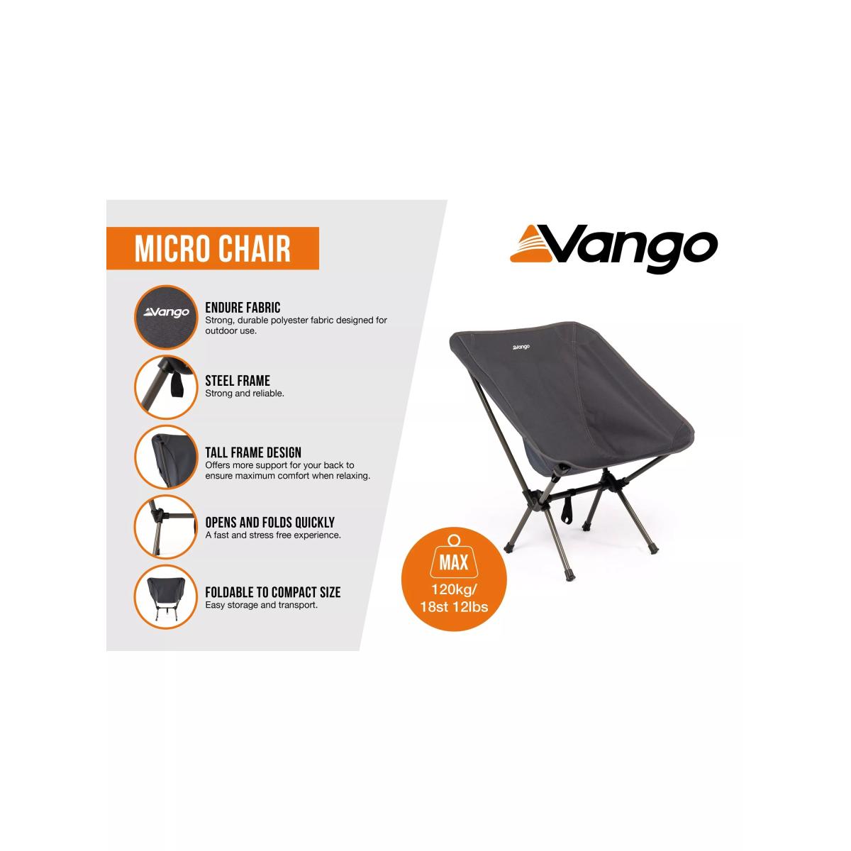 The Vango Micro Folding Chair is a compact, sturdy and durable chair - the perfect match for festival-goers, first-time campers and trekkers. With an incredible pack size and weight of only 1.4kg, the Micro Chair is ideal for those who want to pack light. Simply pack away into the handled carry bag for easy transportation.